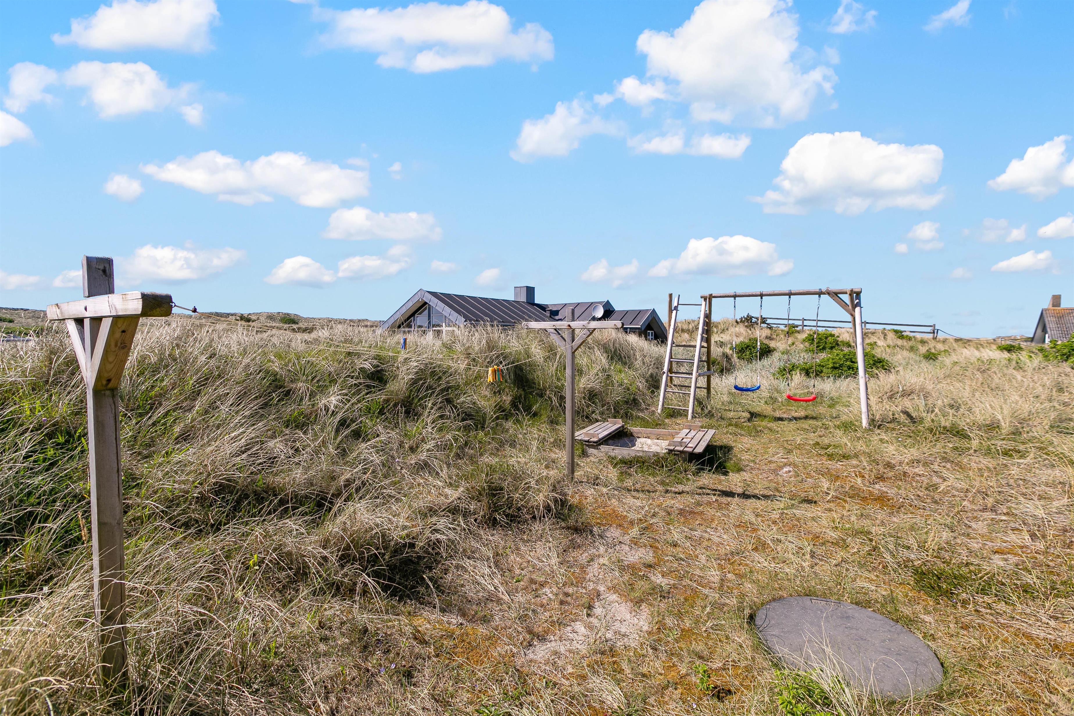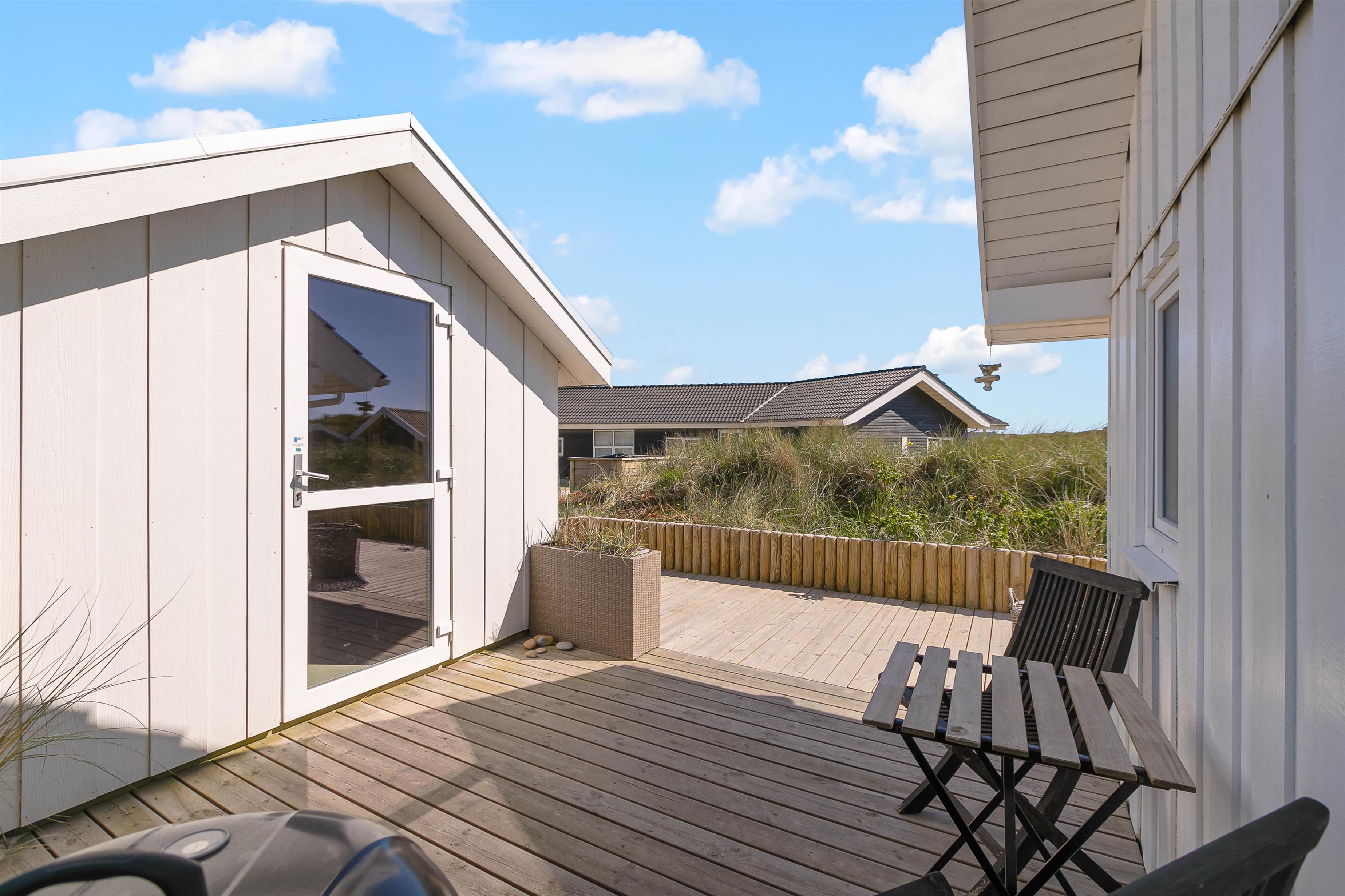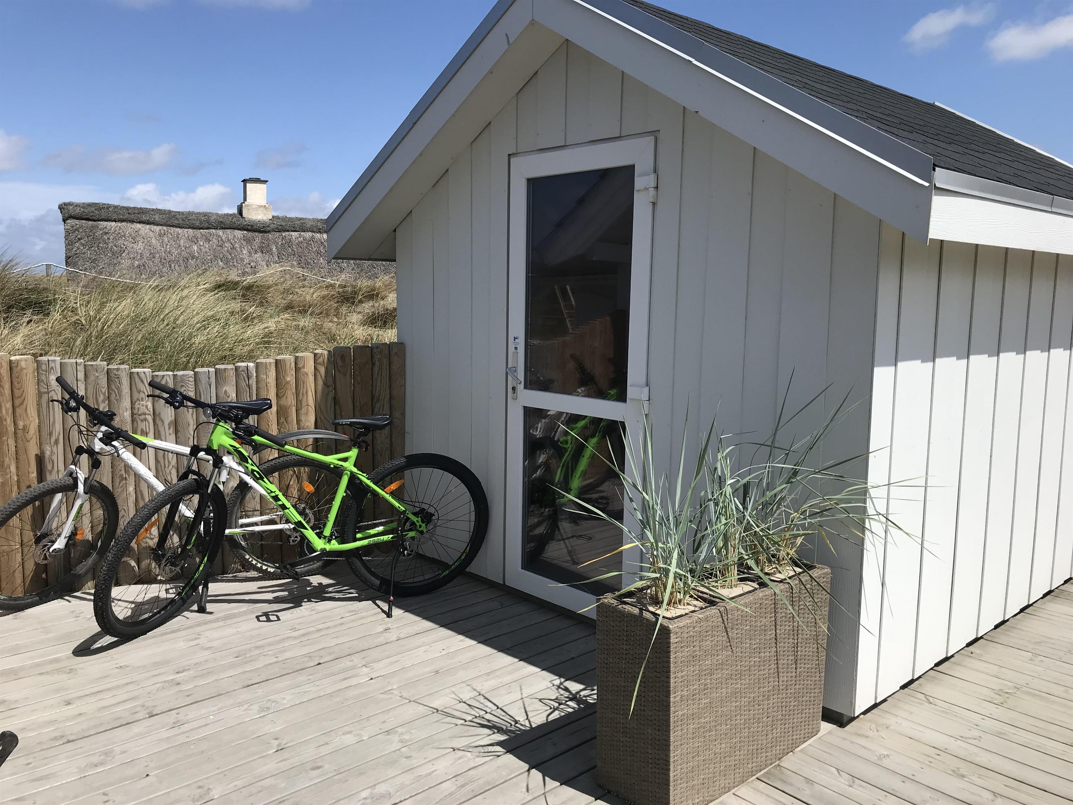 Morgenkaffen kan nydes på den afskærmede terrasse, som strækker sig fra sommerhusets østside til en del af vestsiden. Derfor er der mulighed for at nyde solen det meste af dagen på den skønne terrasse med udsigt til klitterne, imens børnene leger i sandkassen og på gyngen. Ved redskabsrummet er en dejlig terrasse fra 2023, og i rummet finder I havemøbler og 2 cykler, som er til jeres rådighed på ferien.