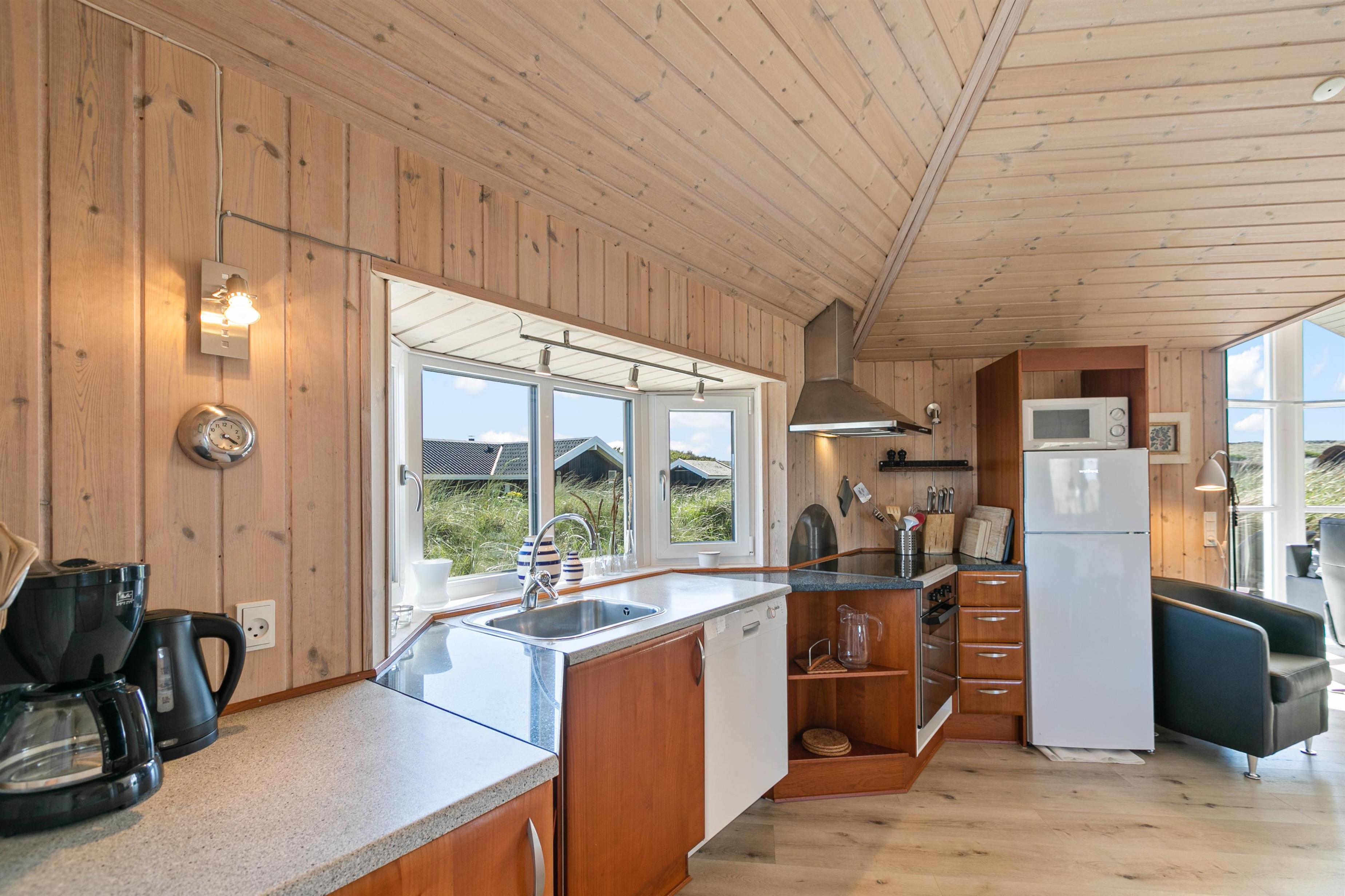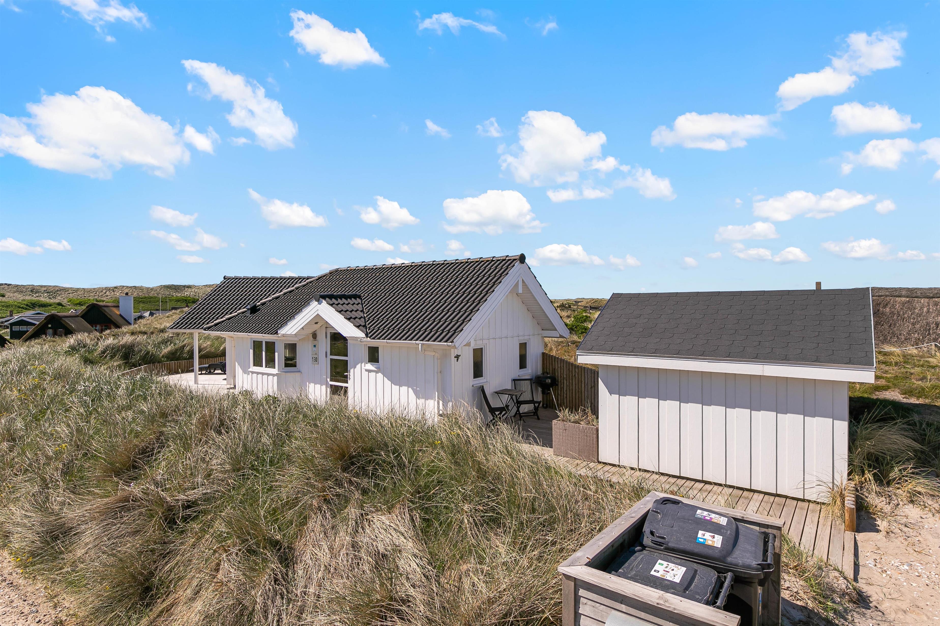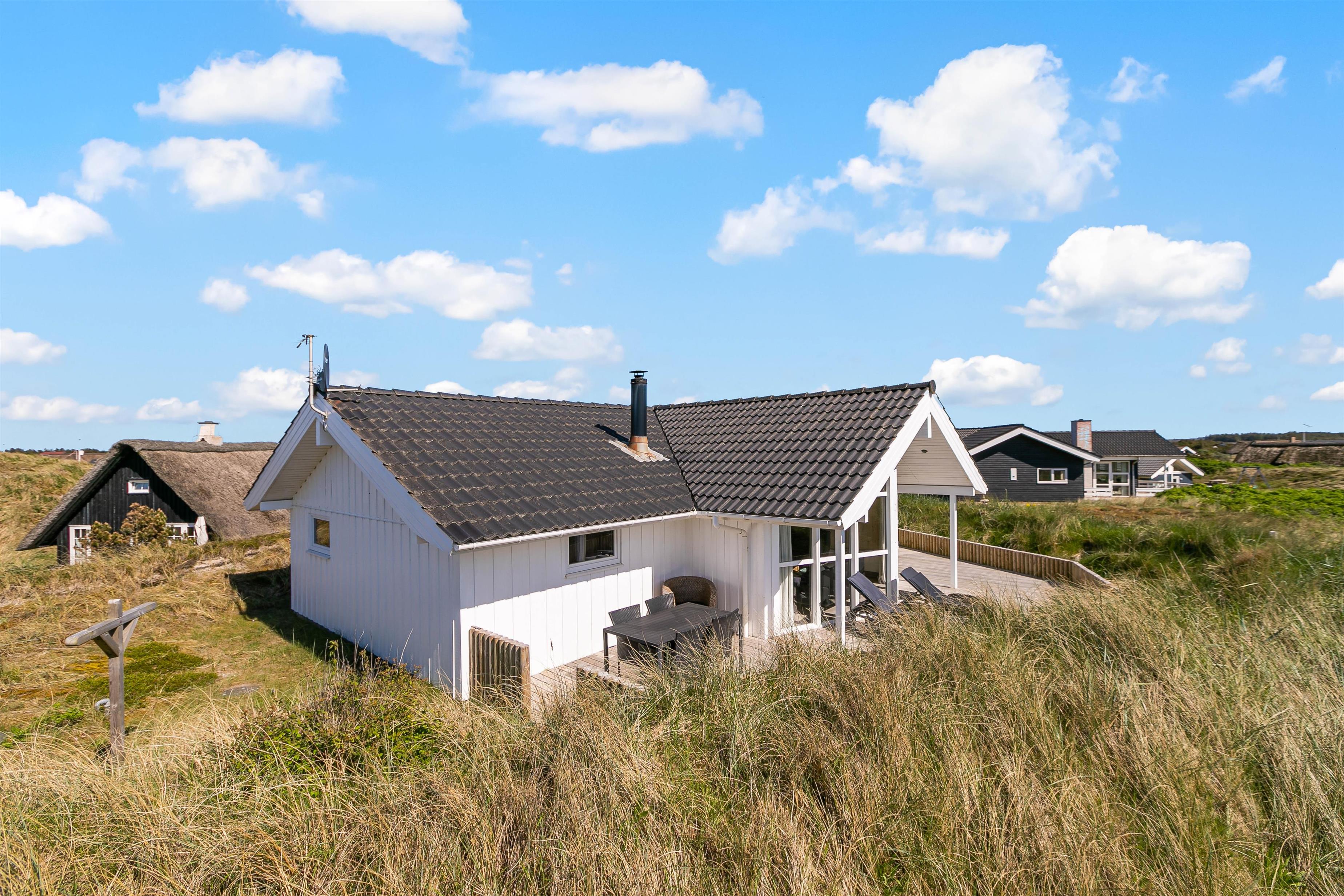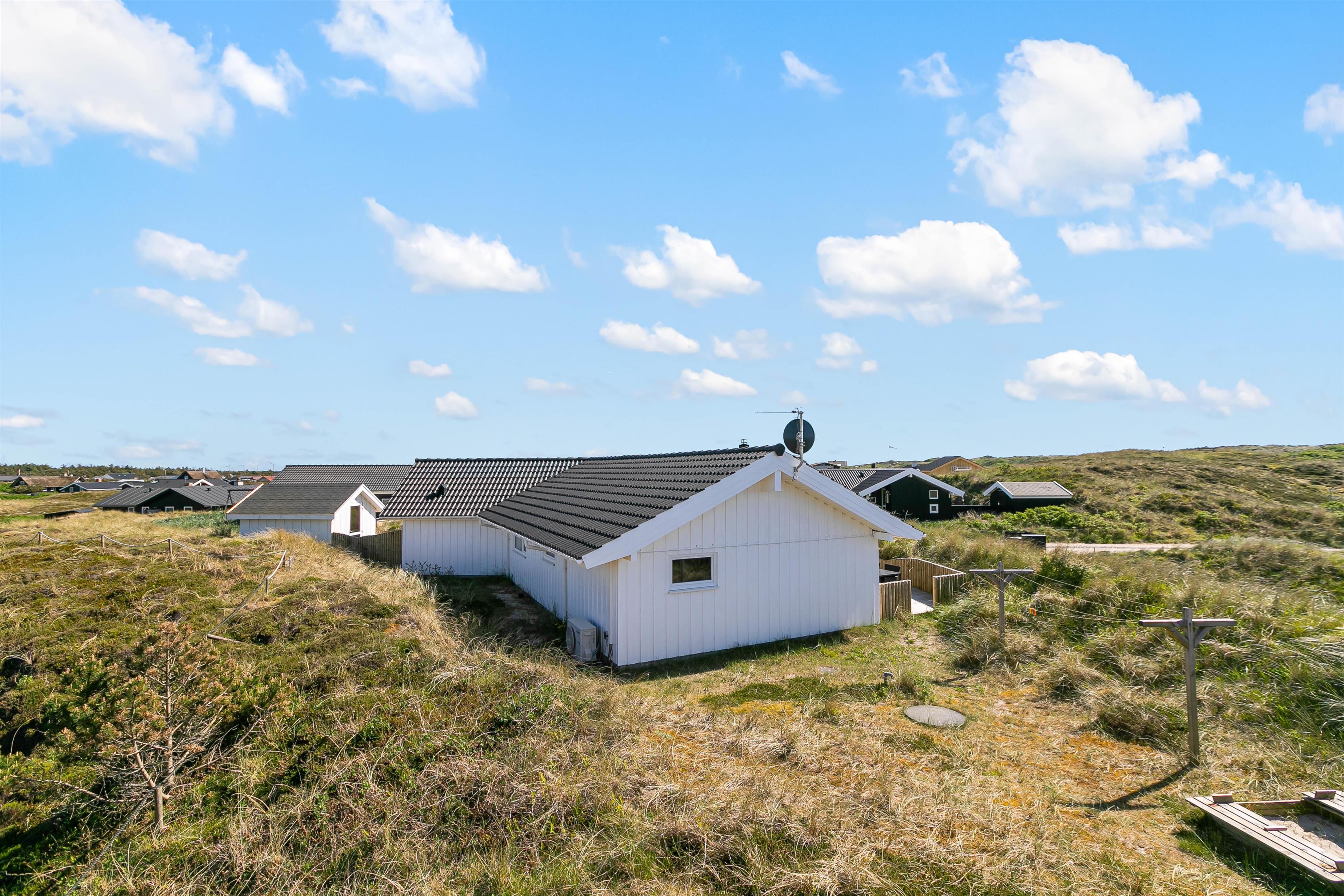 Morgenkaffen kan nydes på den afskærmede terrasse, som strækker sig fra sommerhusets østside til en del af vestsiden. Derfor er der mulighed for at nyde solen det meste af dagen på den skønne terrasse med udsigt til klitterne, imens børnene leger i sandkassen og på gyngen. Ved redskabsrummet er en dejlig terrasse fra 2023, og i rummet finder I havemøbler og 2 cykler, som er til jeres rådighed på ferien.
