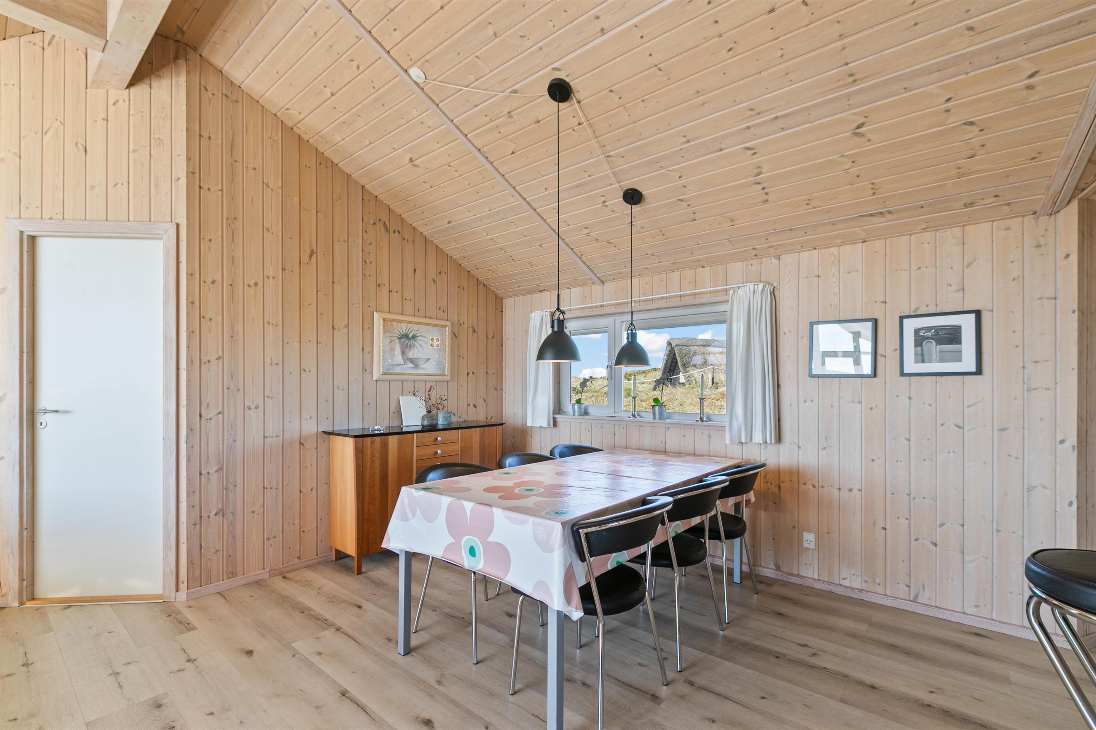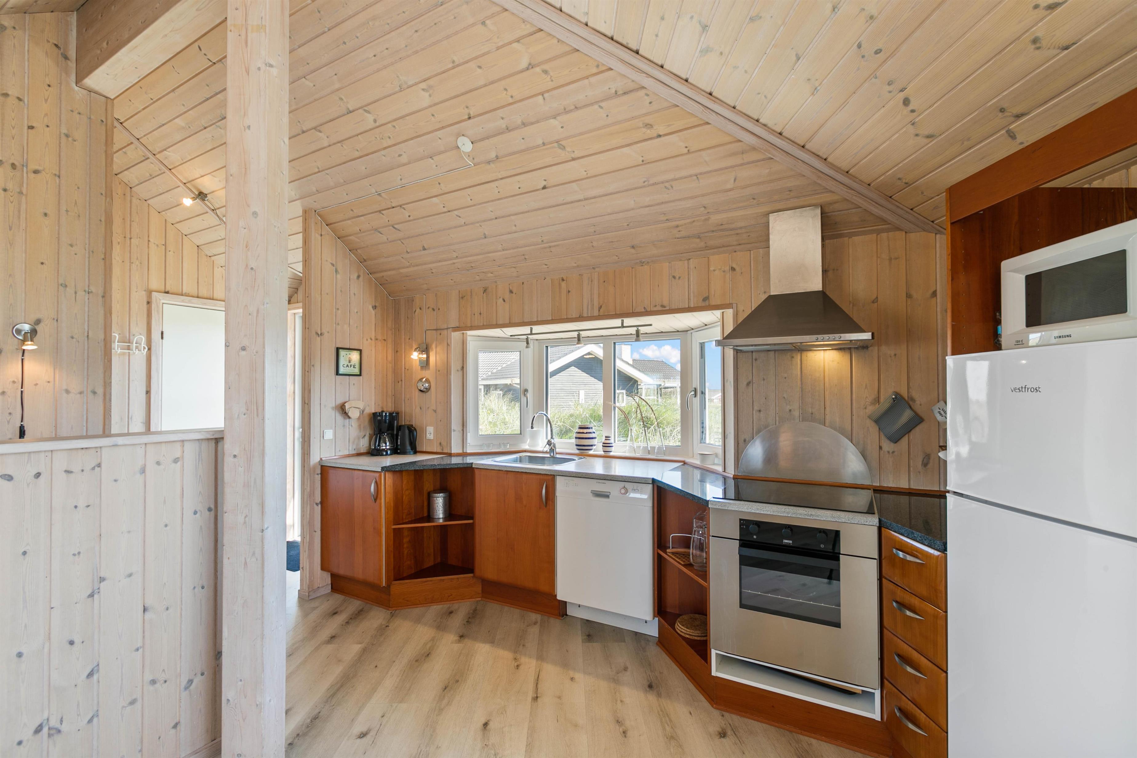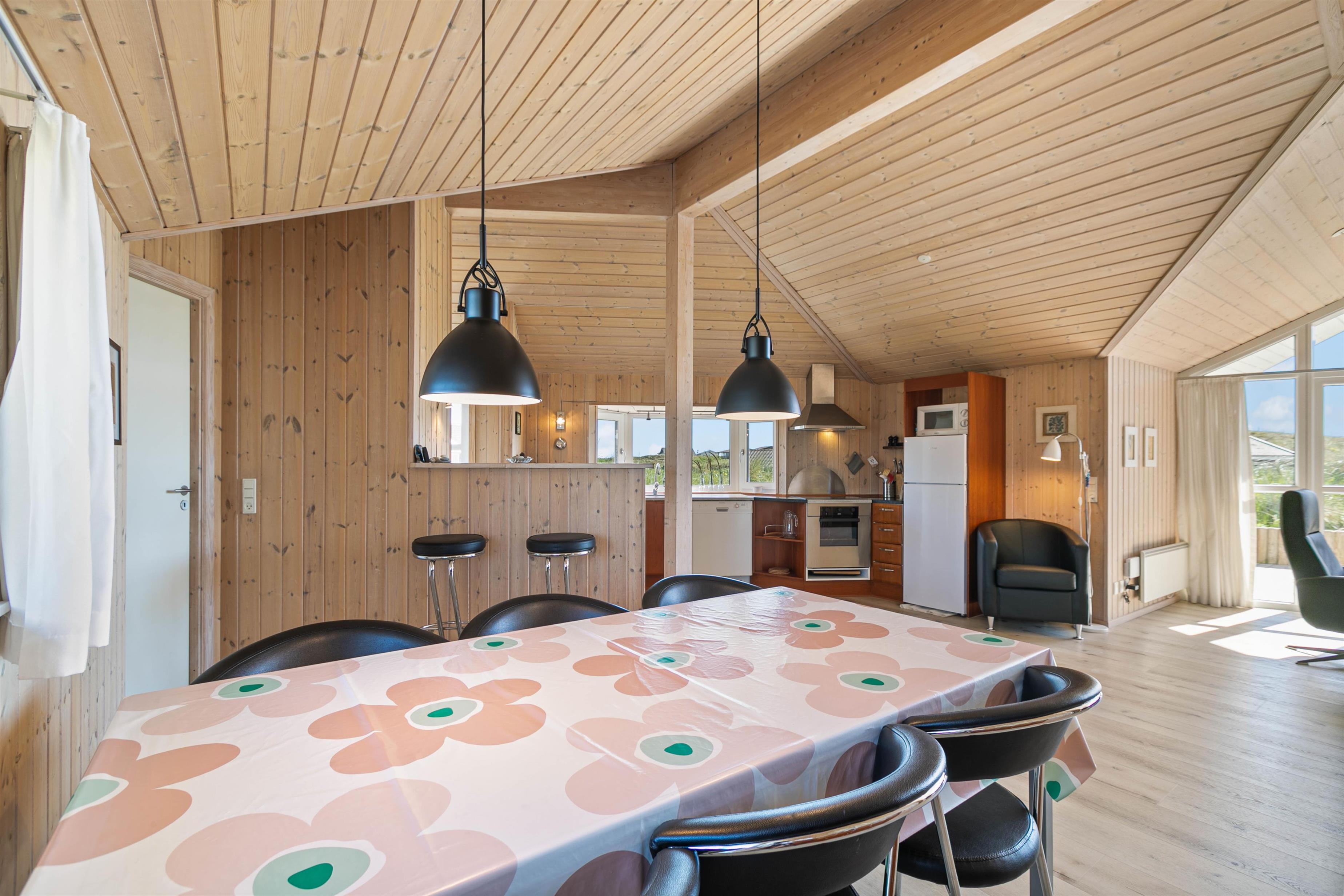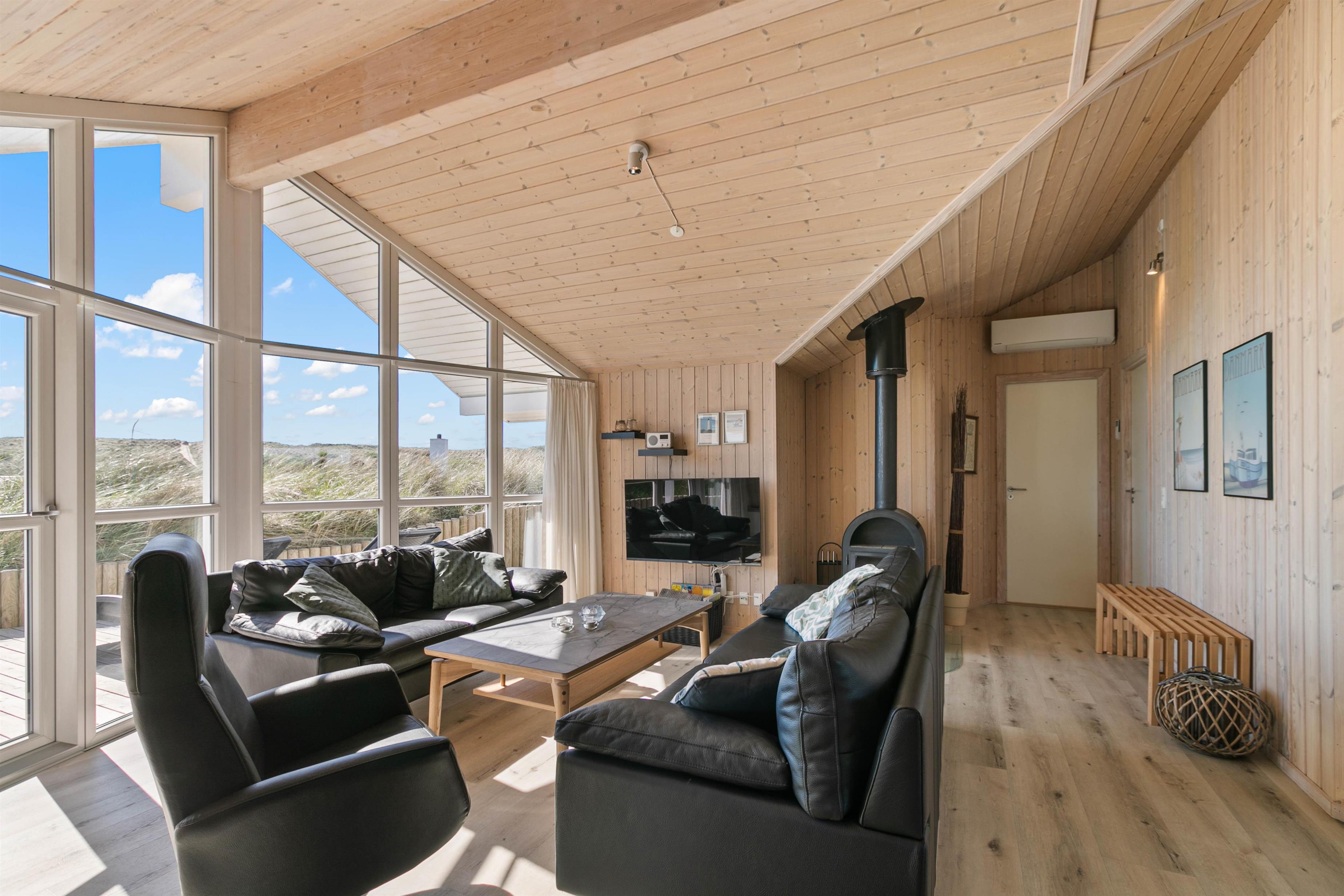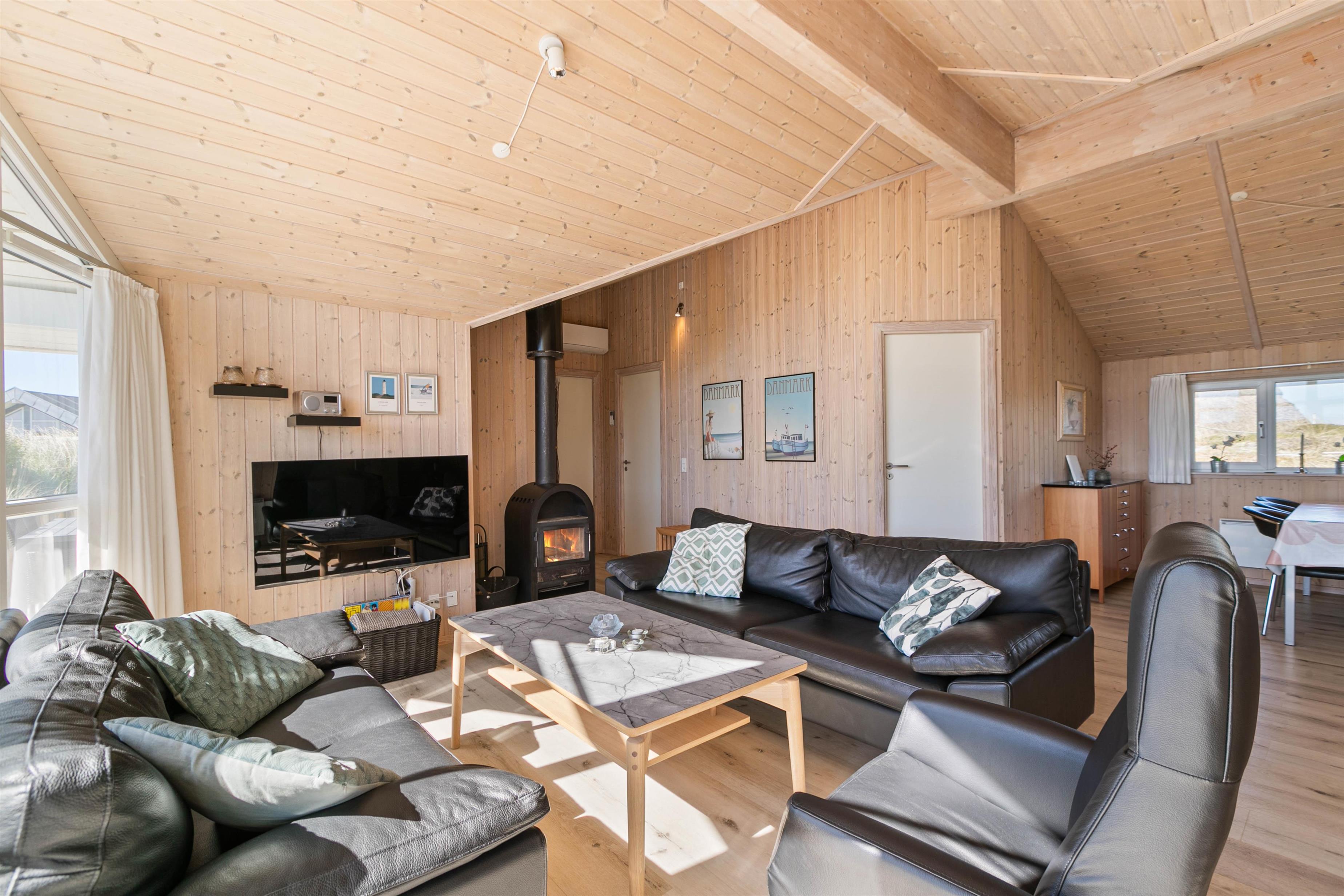 Feriehusets store og elegante stue er åben og ligger i forbindelse med køkkenet, så hele familien kan være samlet; også selvom der skal laves mad. Som prikken over i'et er der en brændeovn i stuen, som giver varme og ekstra hygge. I kan også bruge den energibesparende varmepumpe til at holde temperaturen i alrummet behagelig.