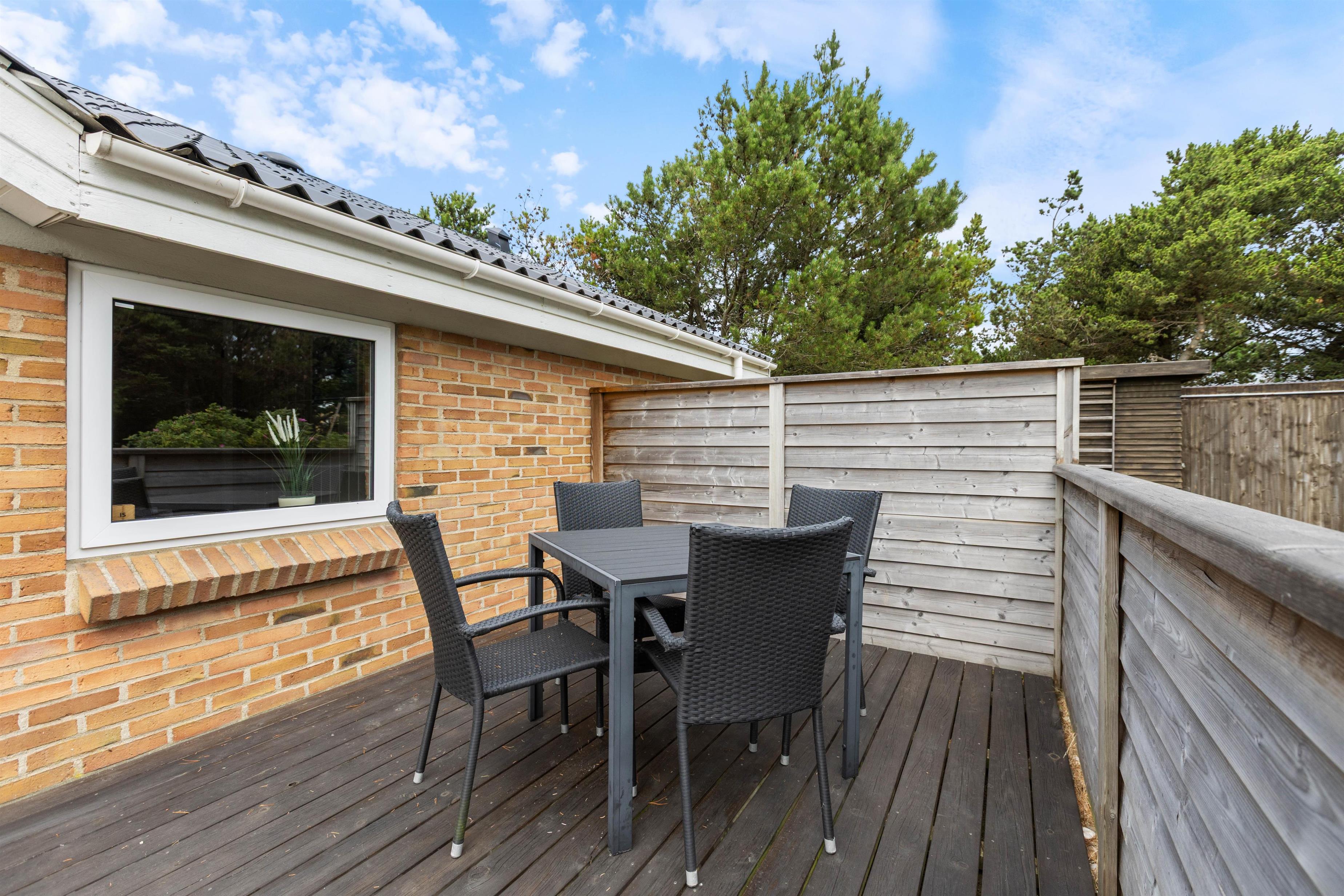 Sommerhusets store og lukkede terrasse gør, at I på ethvert tidspunkt kan sidde i læ og lade jeres eventuelle husdyr løbe frit.