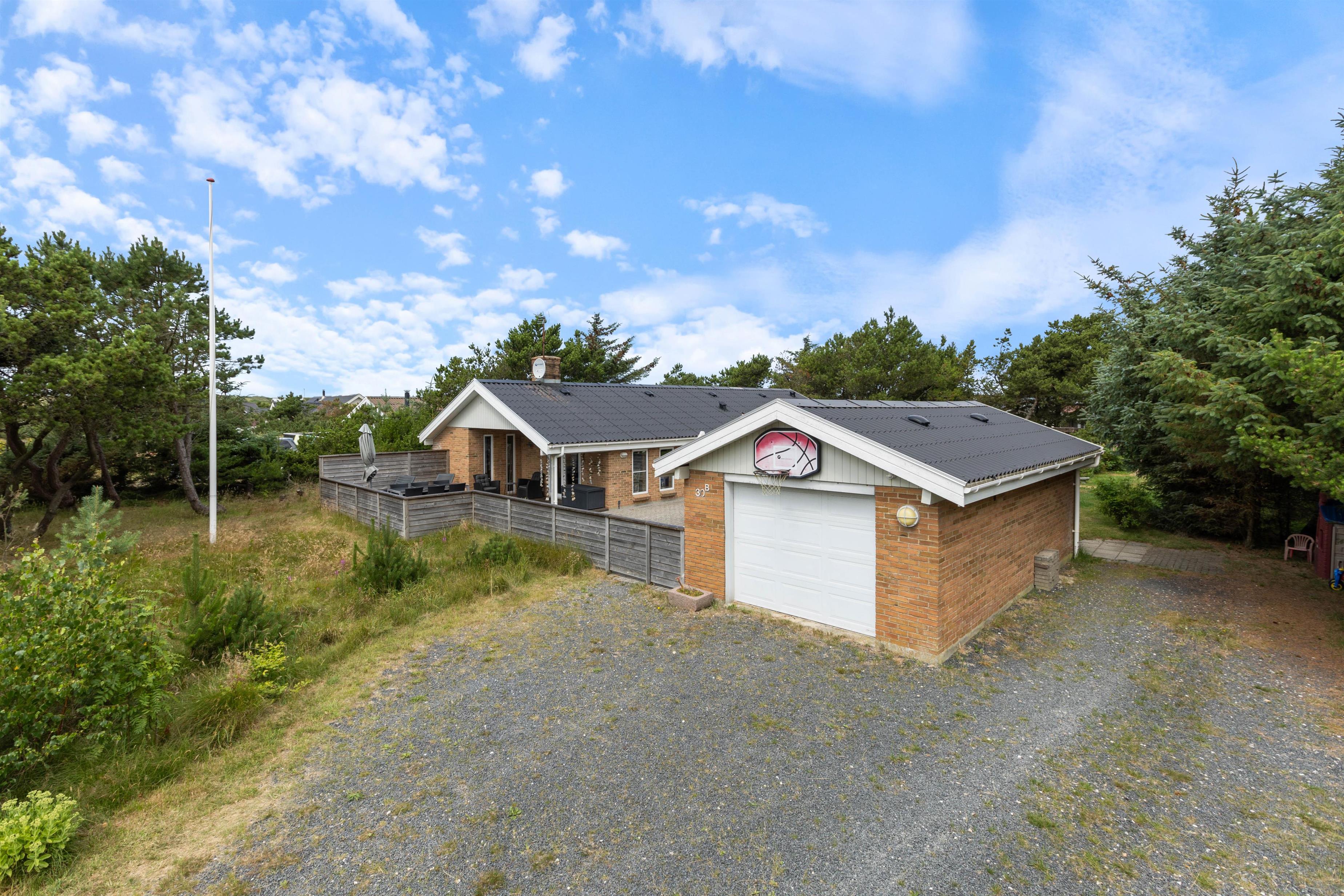 På sommerhusets store afskærmede terrasse som former en gårdhave kan I sidde i læ og nyde en dejlig kop kaffe eller nyde aftensmaden selvlavet på feriehusets egen grill. Her kan hunde frit løbe rundt, da terrassen er lukket. I garagen kan I finde et aktivitetsrum med bordfodbold, bordtennisbord, dart og mere til alle aldre.