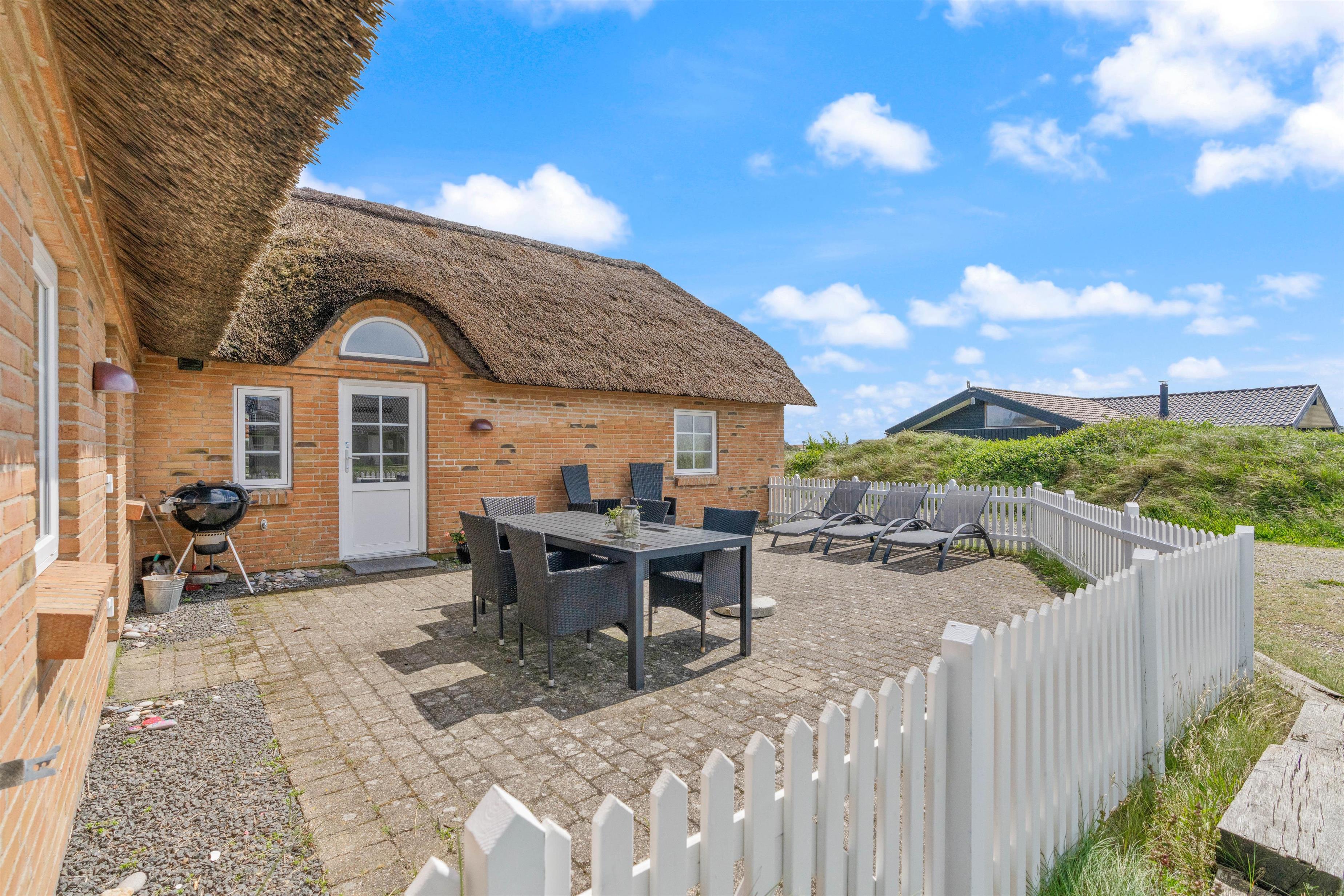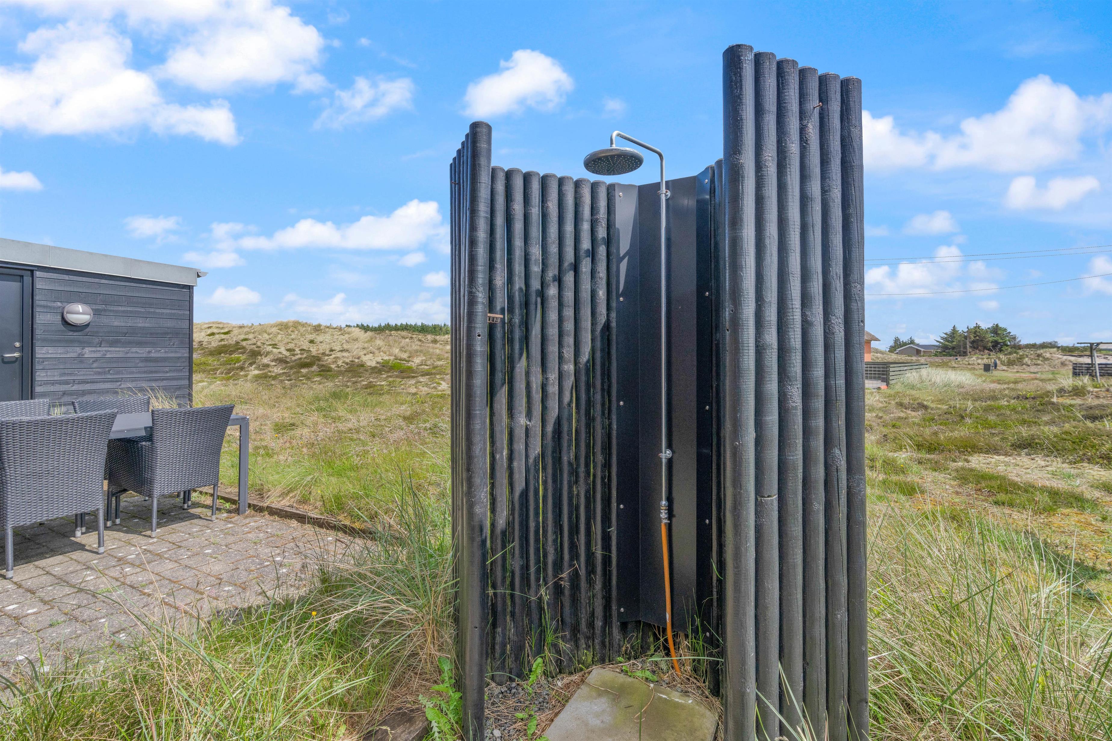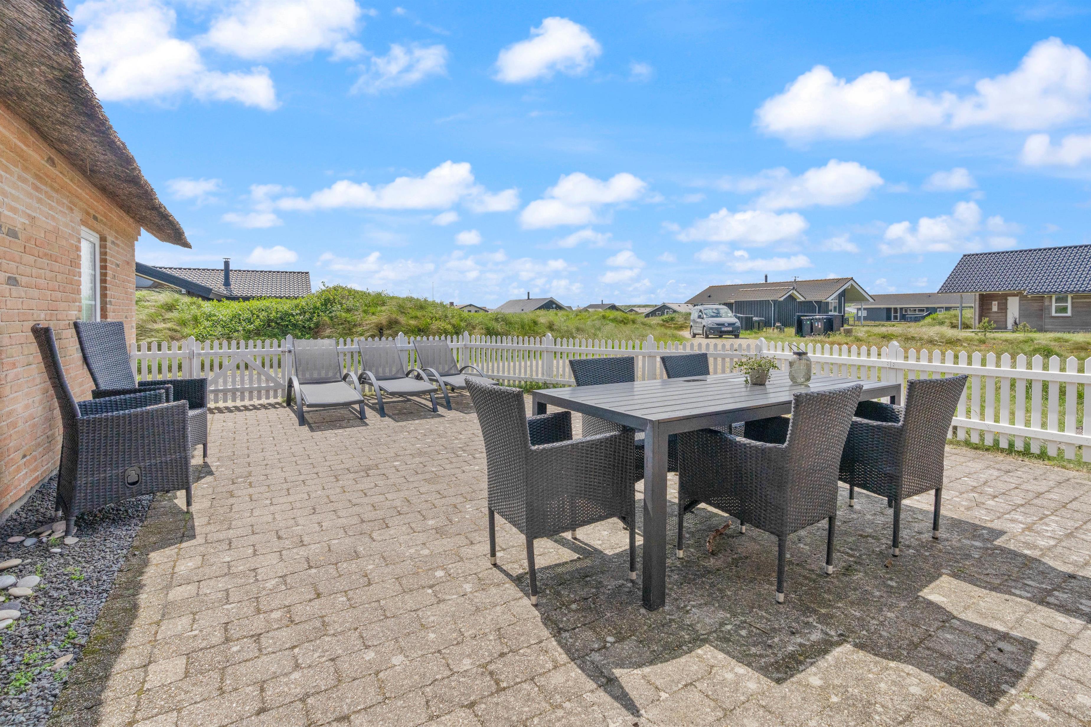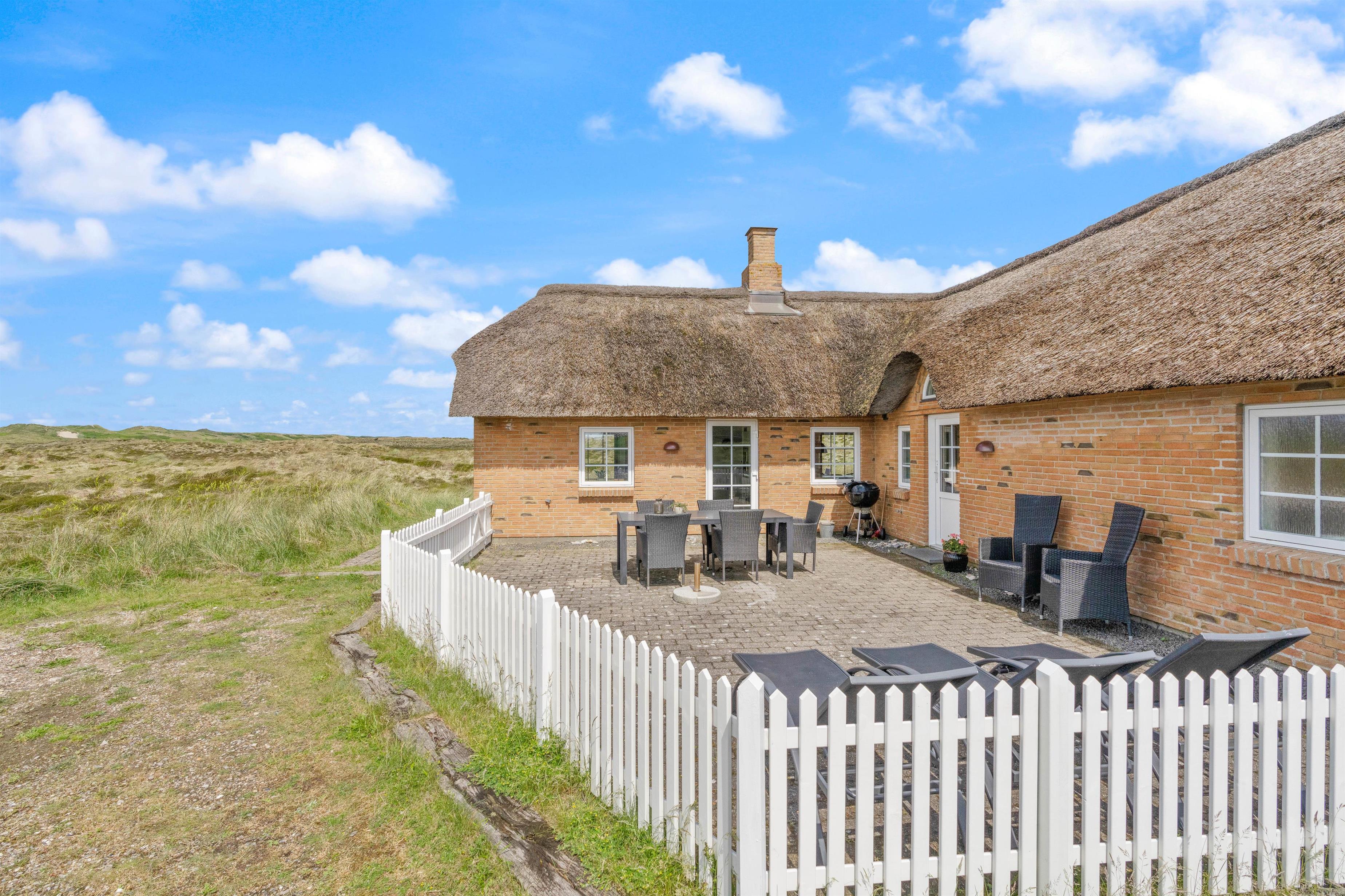 Omgivet af den 1200m² store naturgrund har I forskellige siddemulighed omkring sommerhuset og kan nyde udsigten ud over naturen med hede- og klitlandskabet omring jer. På den lukkede terrasse er der komfortable havemøbler og liggestole, som indbyder til afslapning. Her kan du også lade dine små børn og dine hunde løbe frit omkring, uden at de udforsker omgivelserne uden dig.
