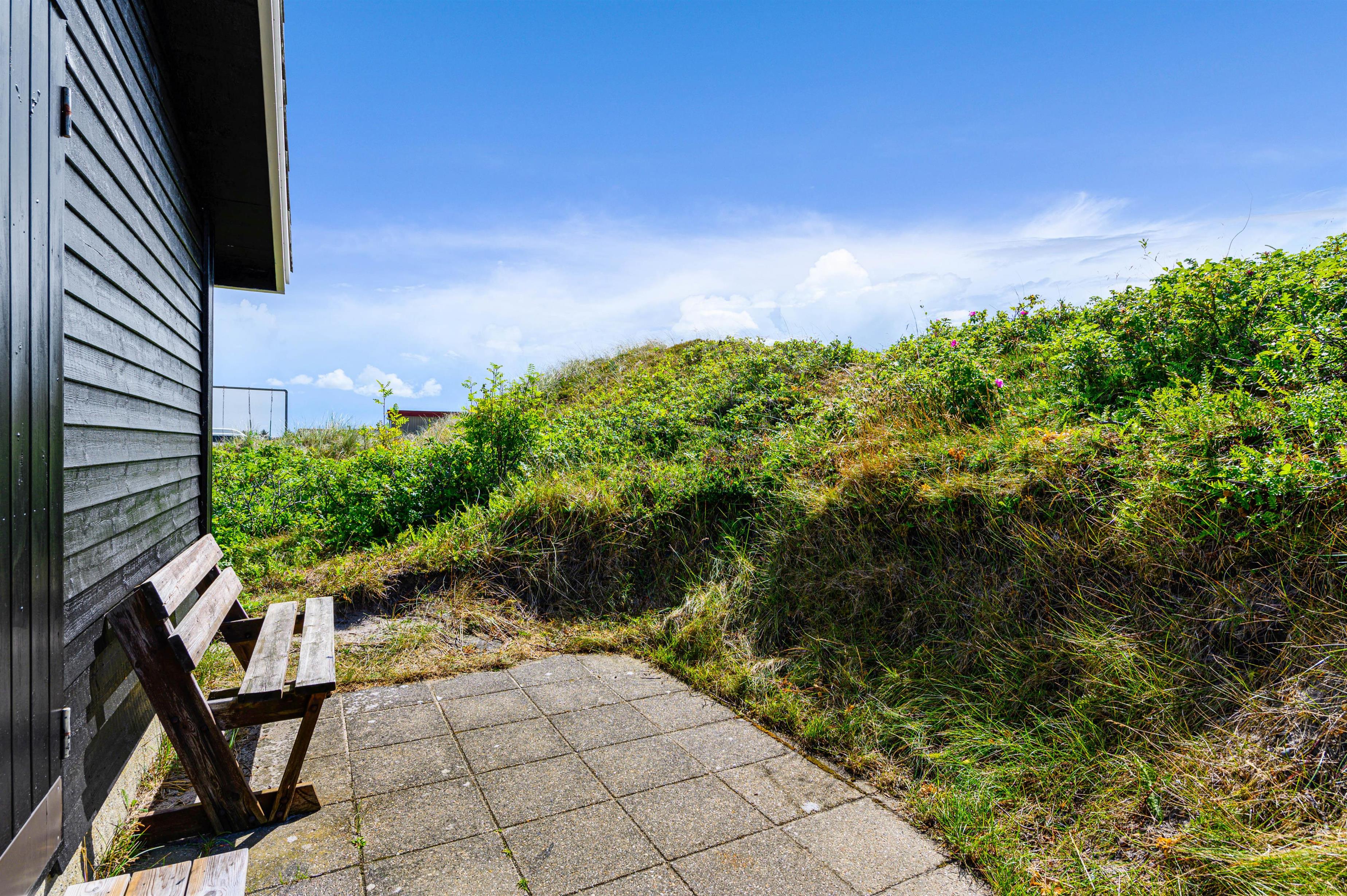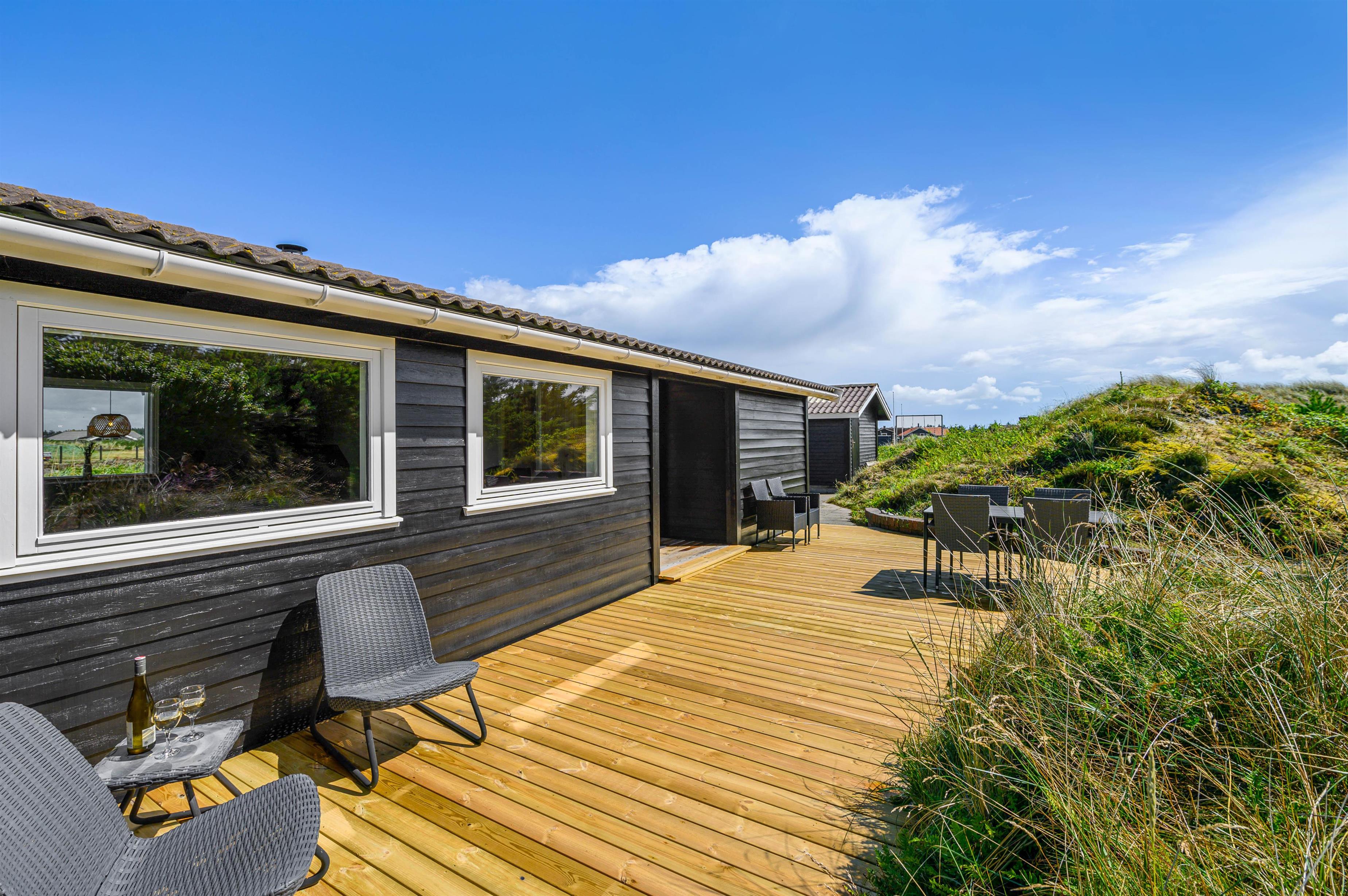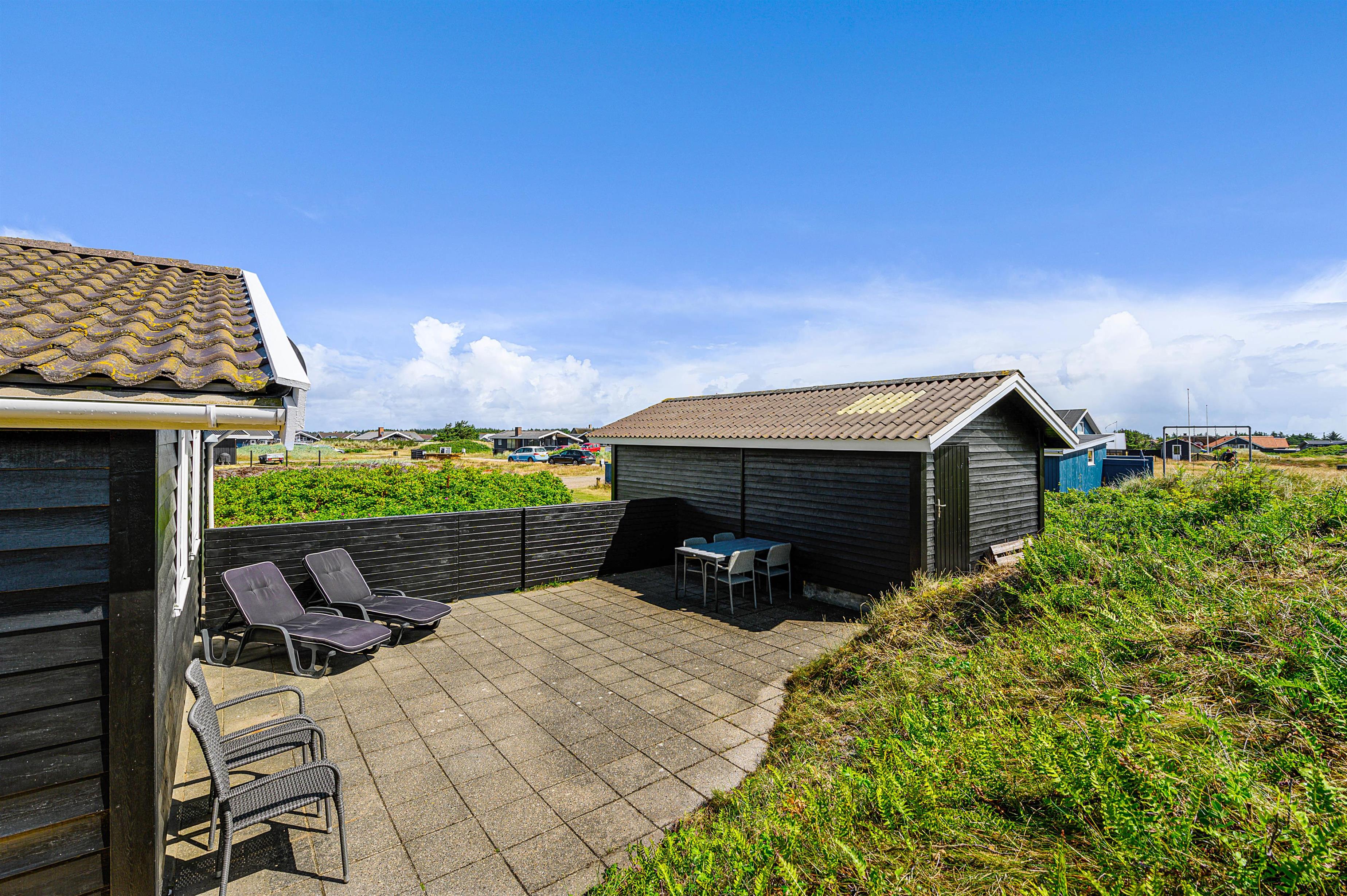 Udenfor kan den friske havluft nydes på de afskærmede terrasser, som naturligvis er udstyret med havemøbler, liggestole og grill. Den sydvendte træterrasse indbyder til hyggelige stunder, hvor et lækkert grillmåltid kan nydes på en lun sommeraften. Øst for sommerhuset er der desuden en fin stenterrasse, hvor morgenkaffen kan drikkes, mens solen står op.