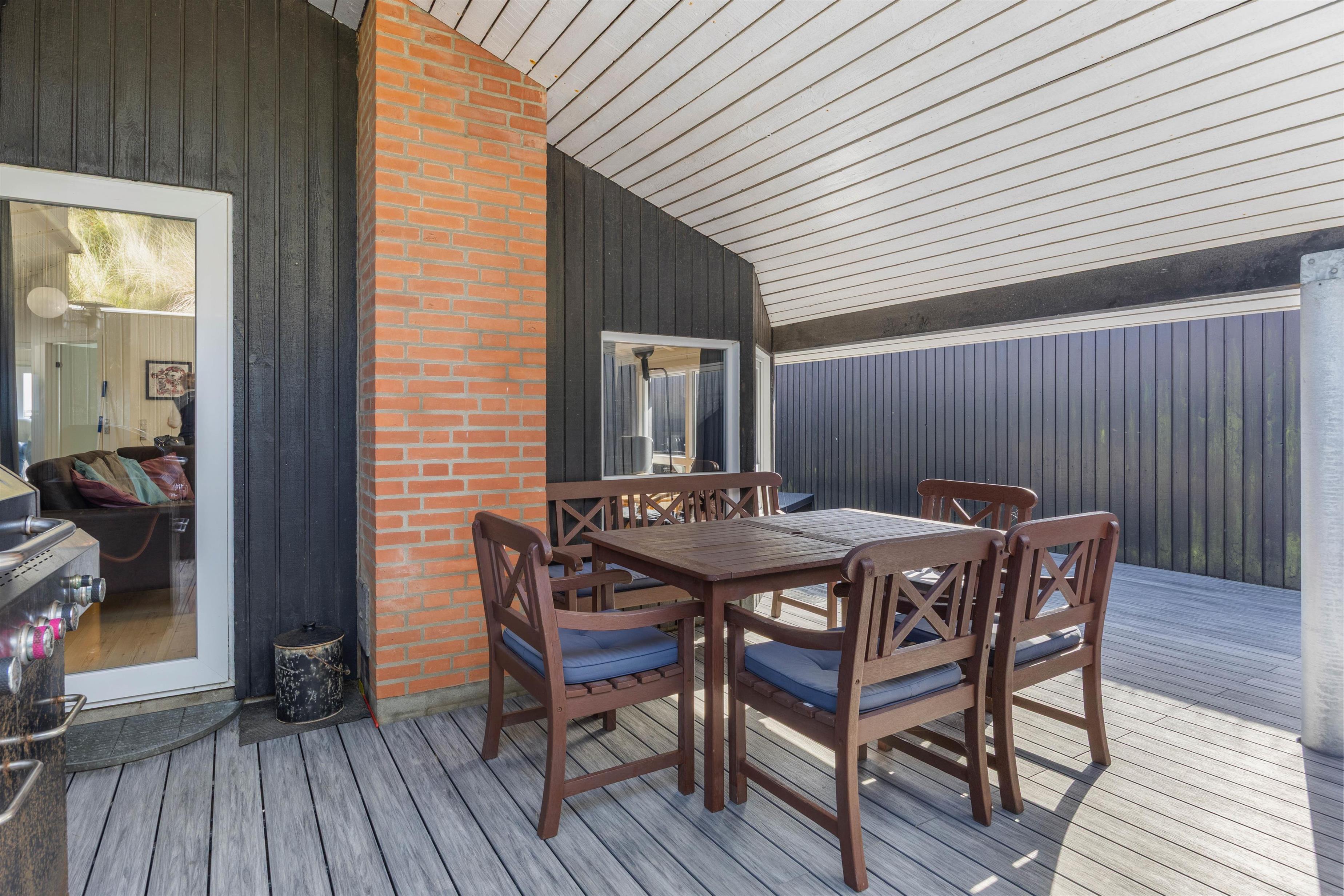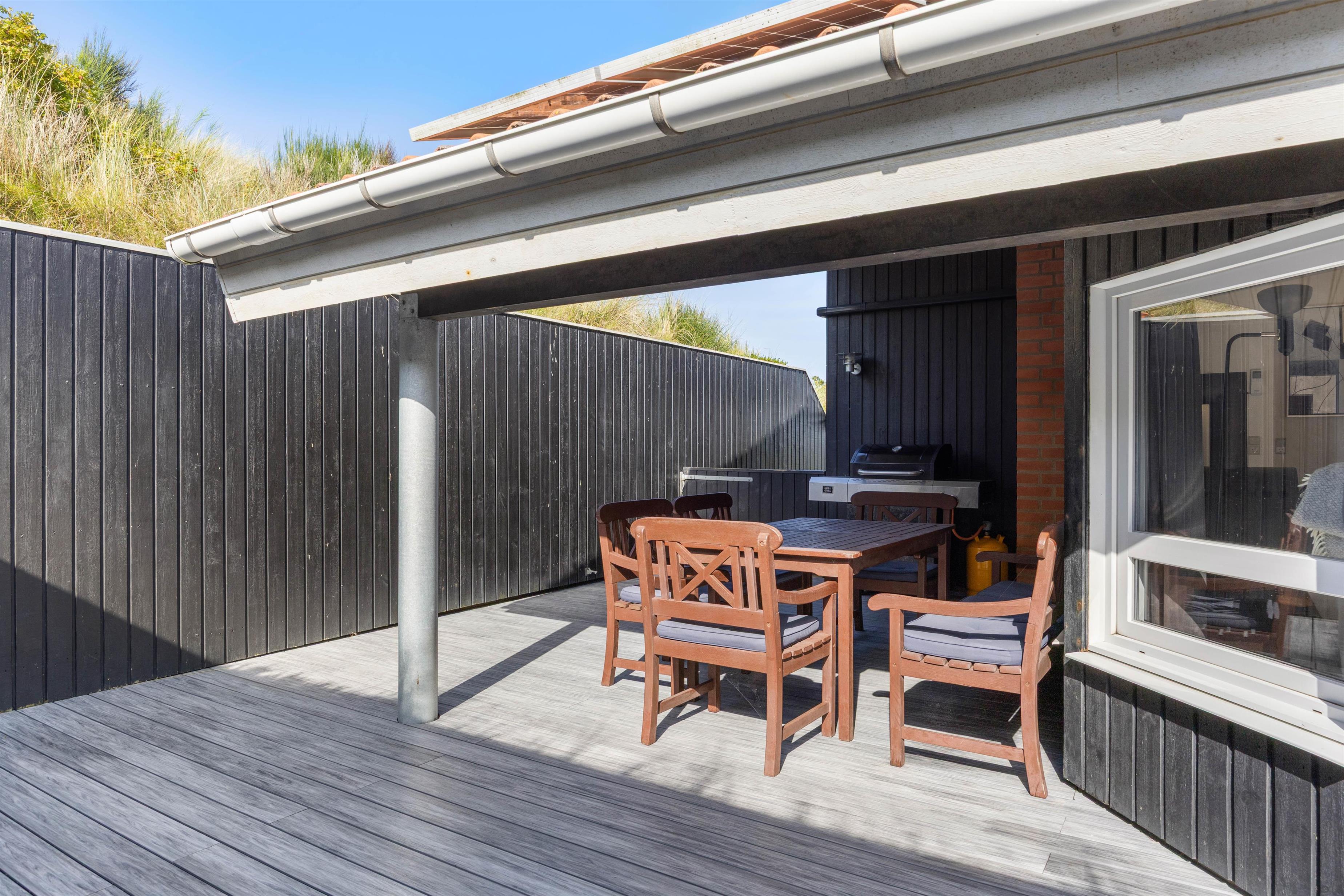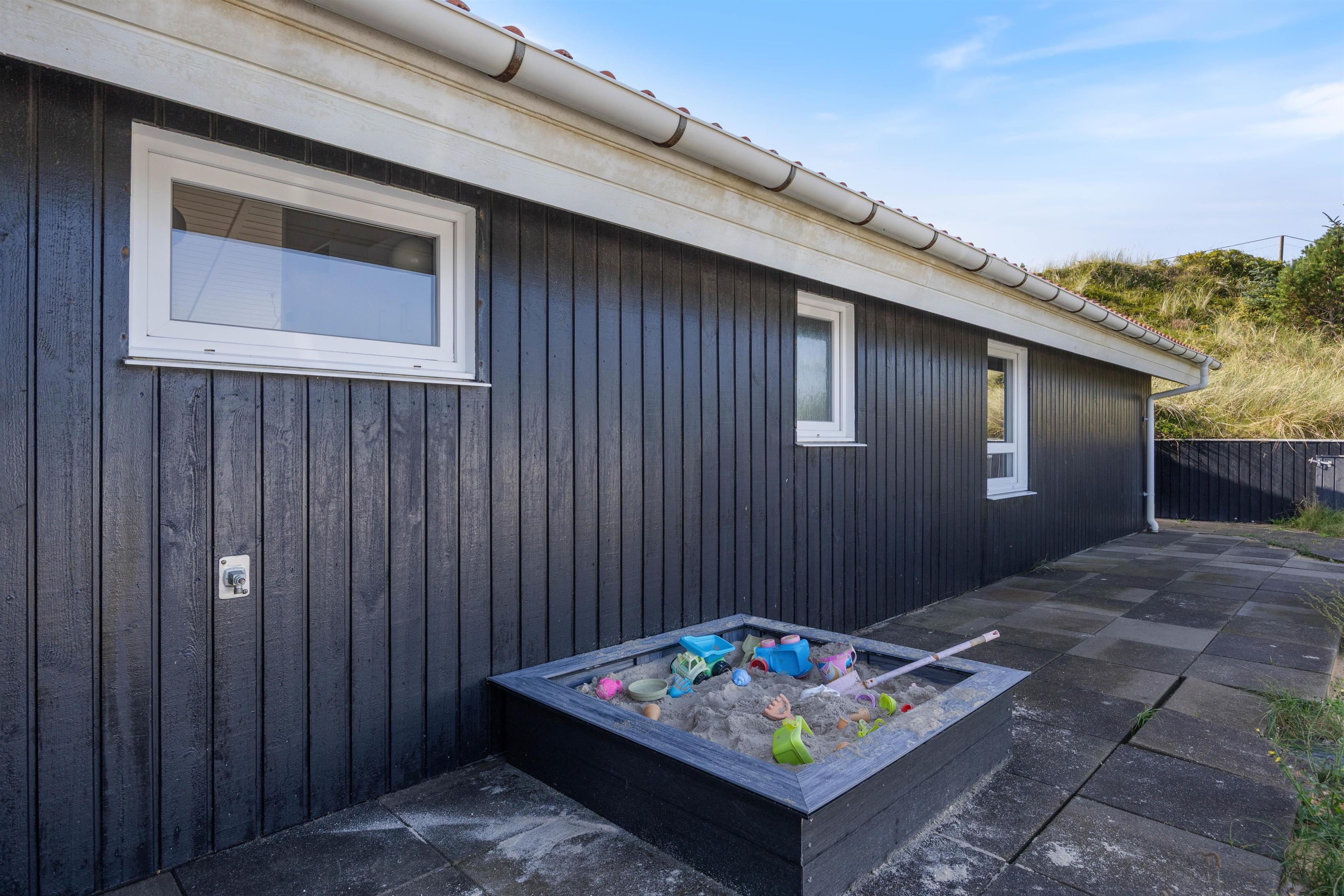 Der er gode terrasser tilhørende sommerhuset, som strækker sig rundt fra øst, mod syd og mod vest. Mod øst er terrassen særdeles anvendelig i morgen og formiddagstimerne og til hen på eftermiddagen. Herefter kan I benytte den sydvendte del, hvor I er helt uforstyrret, ligesom I er på den vestvendte terrasse. Mod vest er terrassen endvidere delvis overdækket, ligesom den er delvis afskærmet både mod syd og mod vest. Der er en sandkasse og en gynge til de små.