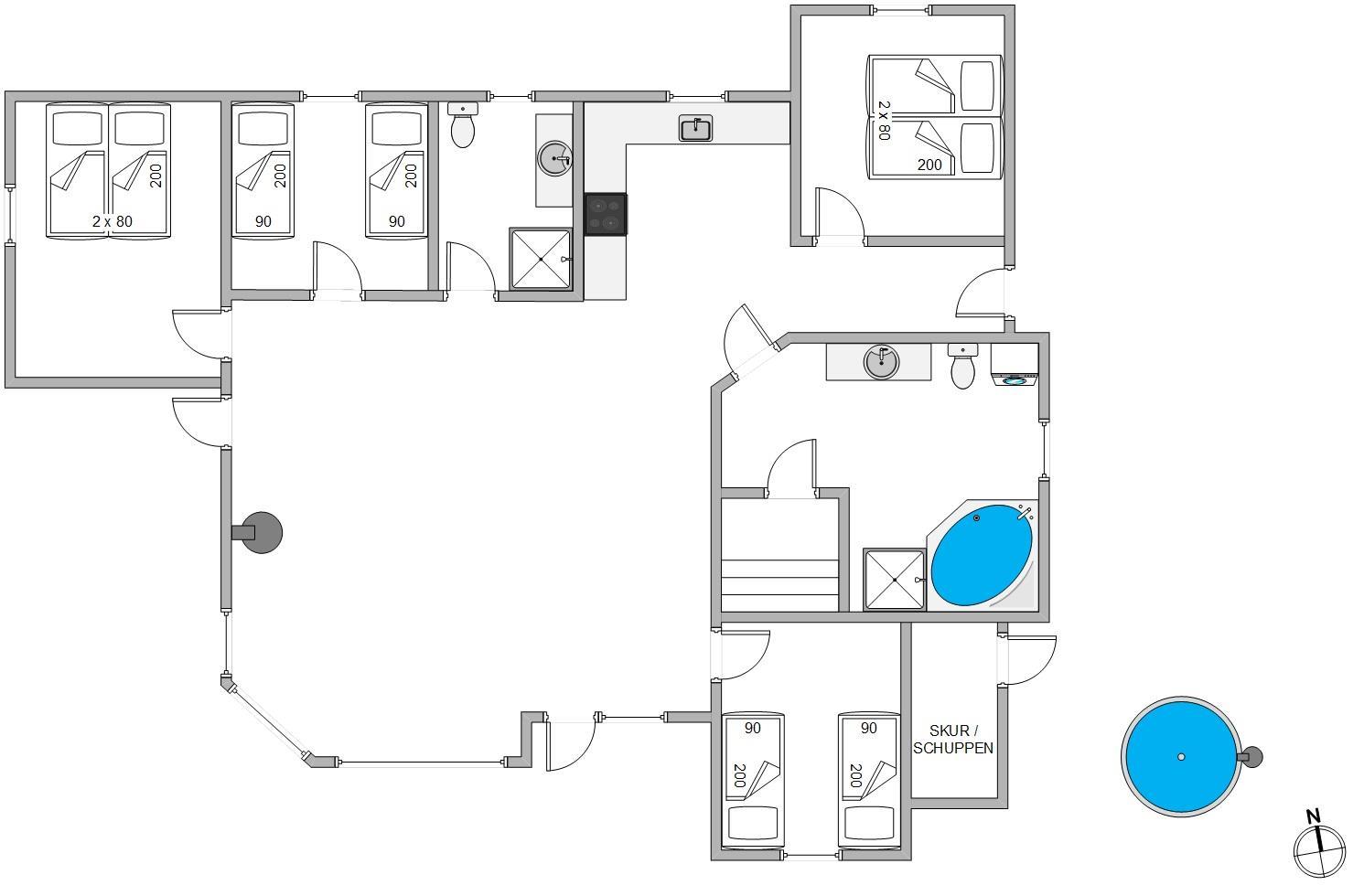 Dette sommerhus har 8 sovepladser fordelt på 4 soveværelser. 2 af værelserne har hver en dobbeltseng, og de sidste 2 har hver 2 enkeltsenge. Der er 2 badeværelser med gulvvarme i feriehuset, hvoraf I finder sommerhusets sauna og spabad på det store badeværelse. Her er altså god mulighed for afslapning og velvære efter en sjov feriedag i naturen. Sommerhusets vaskemaskine og tørretumbler er også placeret i det store badeværelse.