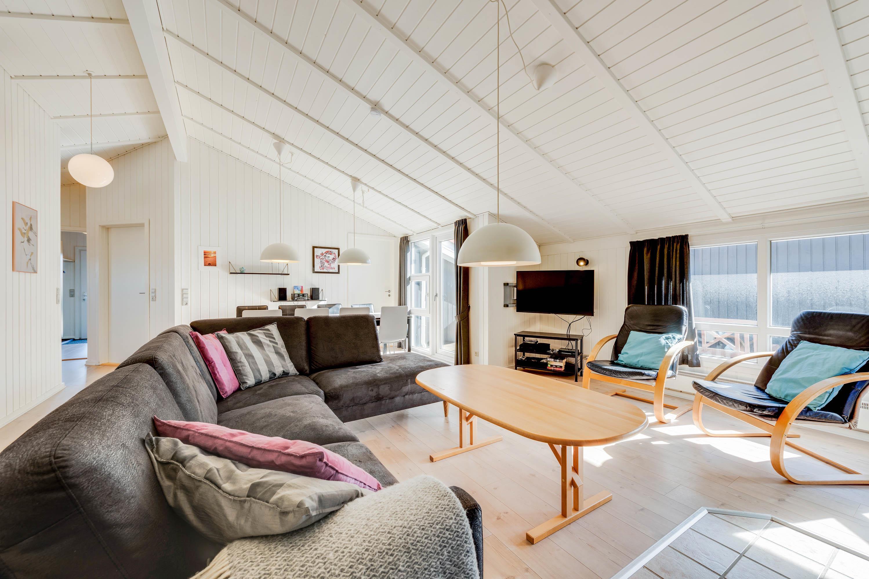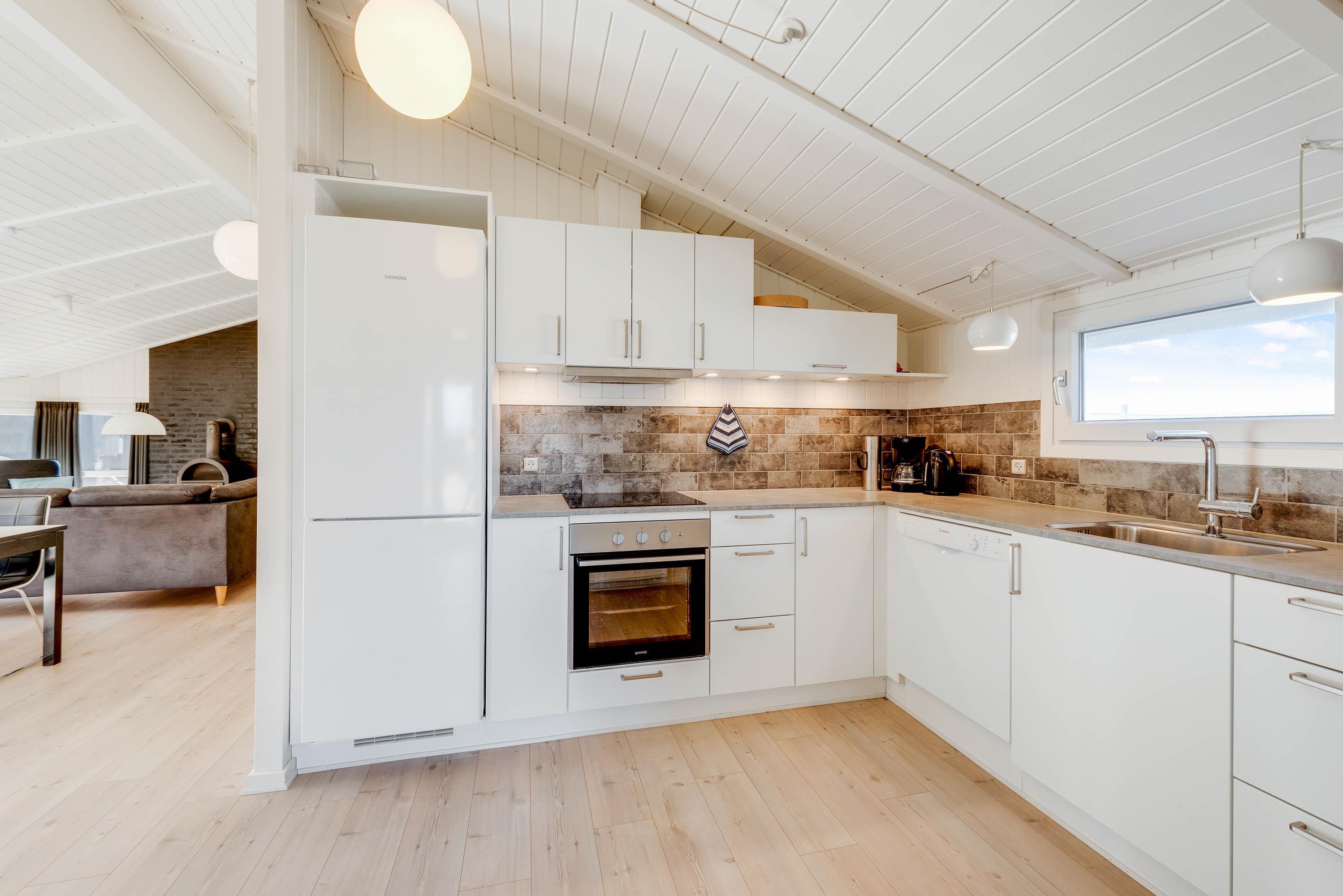 Køkkenet er placeret i den nordøstlige del af sommerhuset. Her er der en opvaskemaskine, en mikroovn og en fryser på 90 L. Der er udsigt fra køkkenet til stuen, som er placeret i den sydvestlige del af feriehuset. Stuen er lys og indbydende, og klitterne betyder, at I er 100 % ugeneret. Der er en brændeovn, som både varmer og hygger, der er et fladskærms-TV, parabol, radio m/CD-afspiller, og så er der gratis trådløst internet.