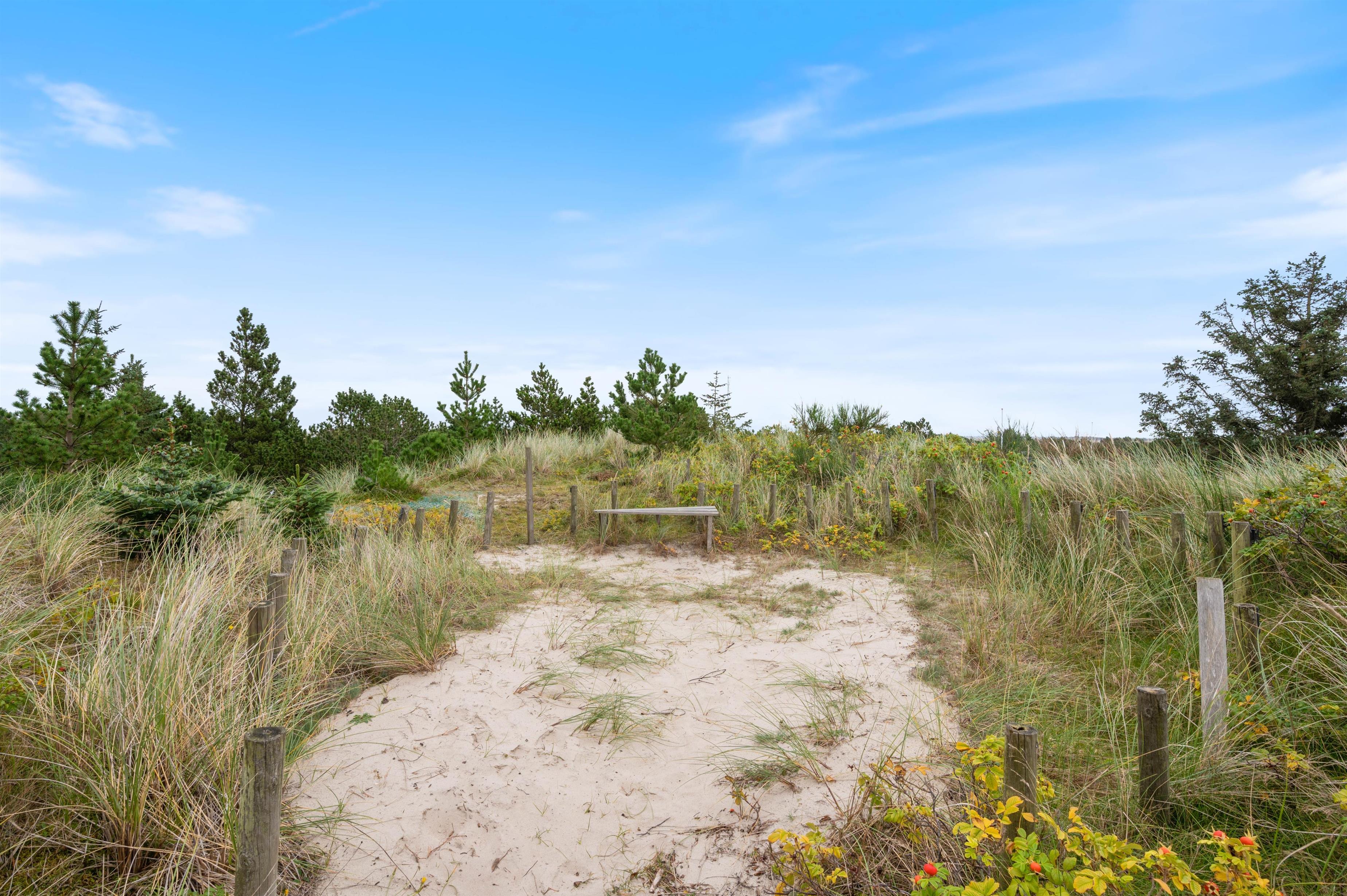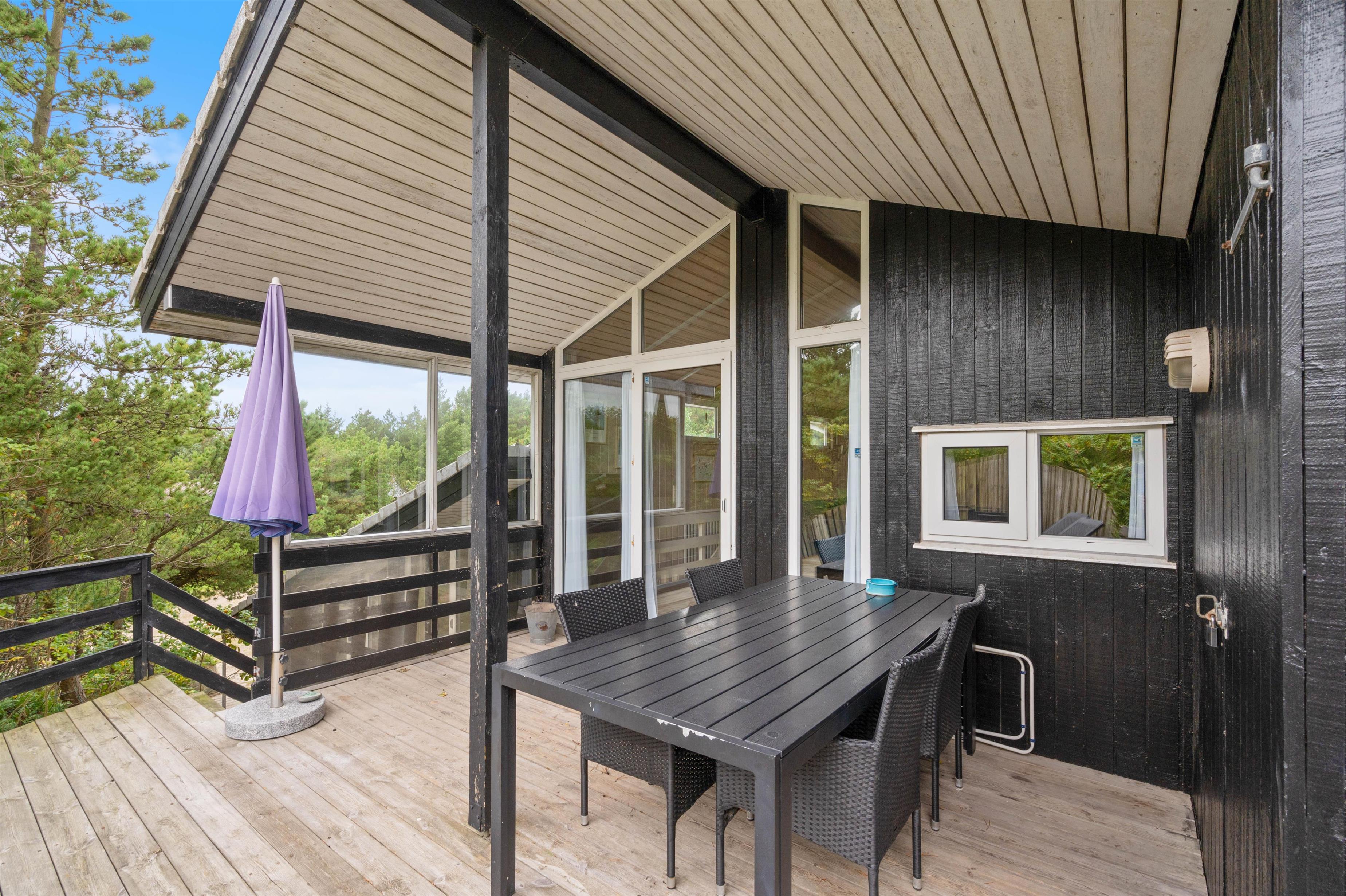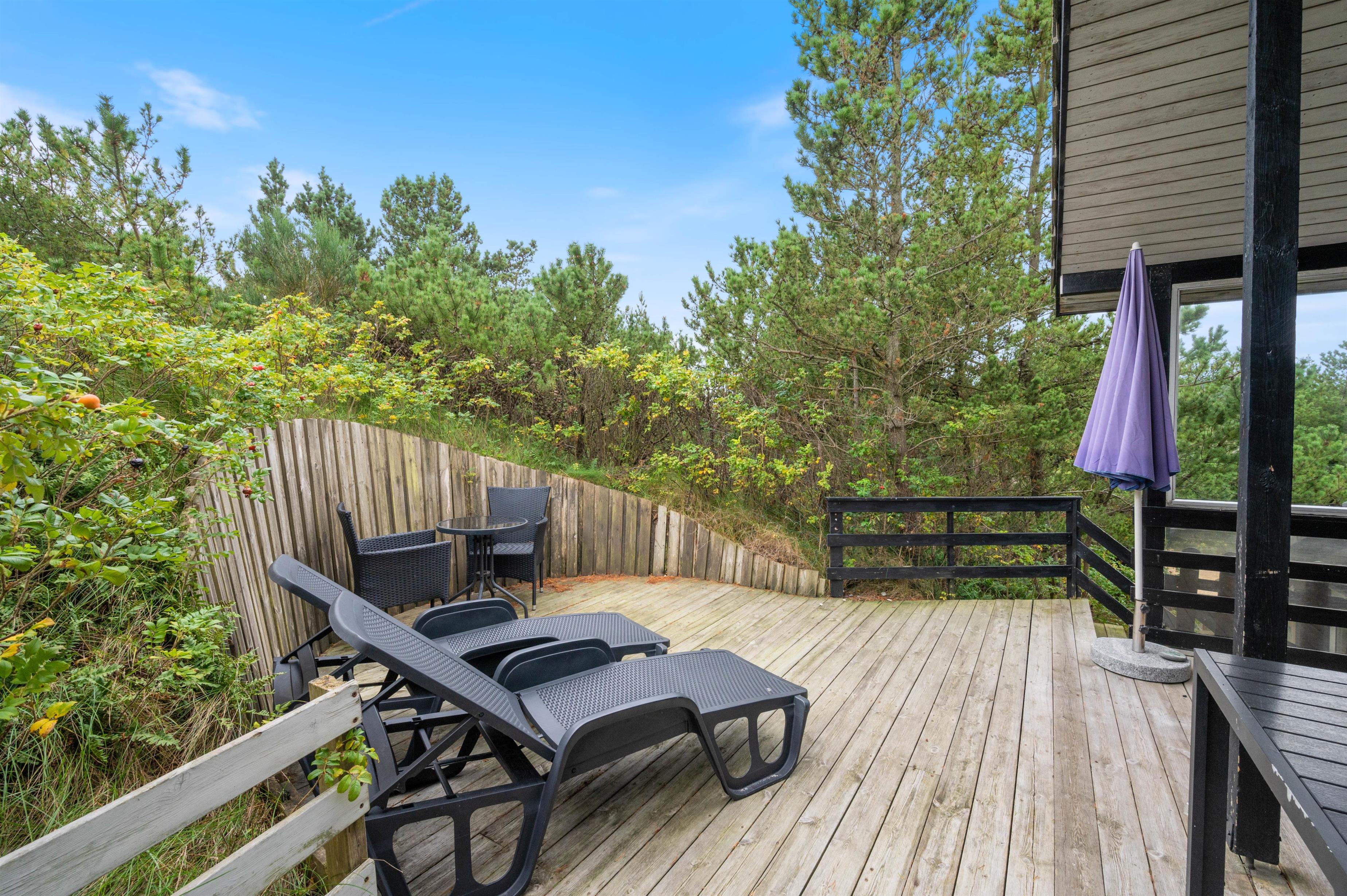 Også i uderummet har sommerhuset mange charmerende detaljer. På grund af sin unikke beliggenhed er der gode, private terrasser og hyggeoaser rundt om hele feriehuset. Her kan I sidde, omgivet af fyrrebuske og hybenplanter, og nyde naturen og hinanden. Fra den private klittop, der ligger bag sommerhuset, er der desuden en meget smuk udsigt over Ringkøbing Fjord.