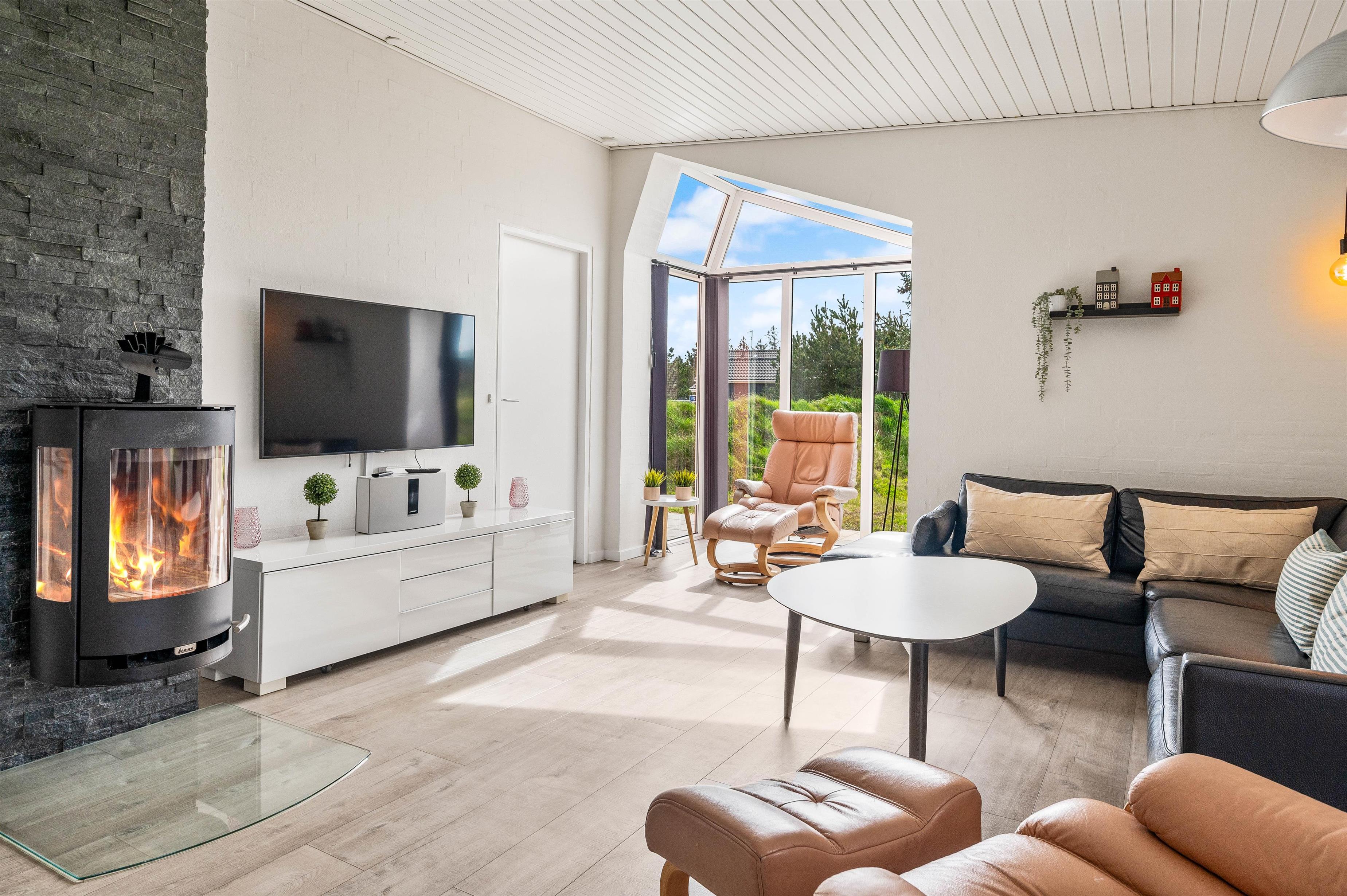 Fra første ferieøjeblik vil I blive budt varmt velkommen i de skønne omgivelser, der udstråler kvalitet og feriehygge bedste stil. De hvide vægge og lofter gør indretningen dejlig rummelig og får rummene til at virke endnu større, og gennem vinduerne bliver det flotte opholdsrum oplyst af solens stråler.