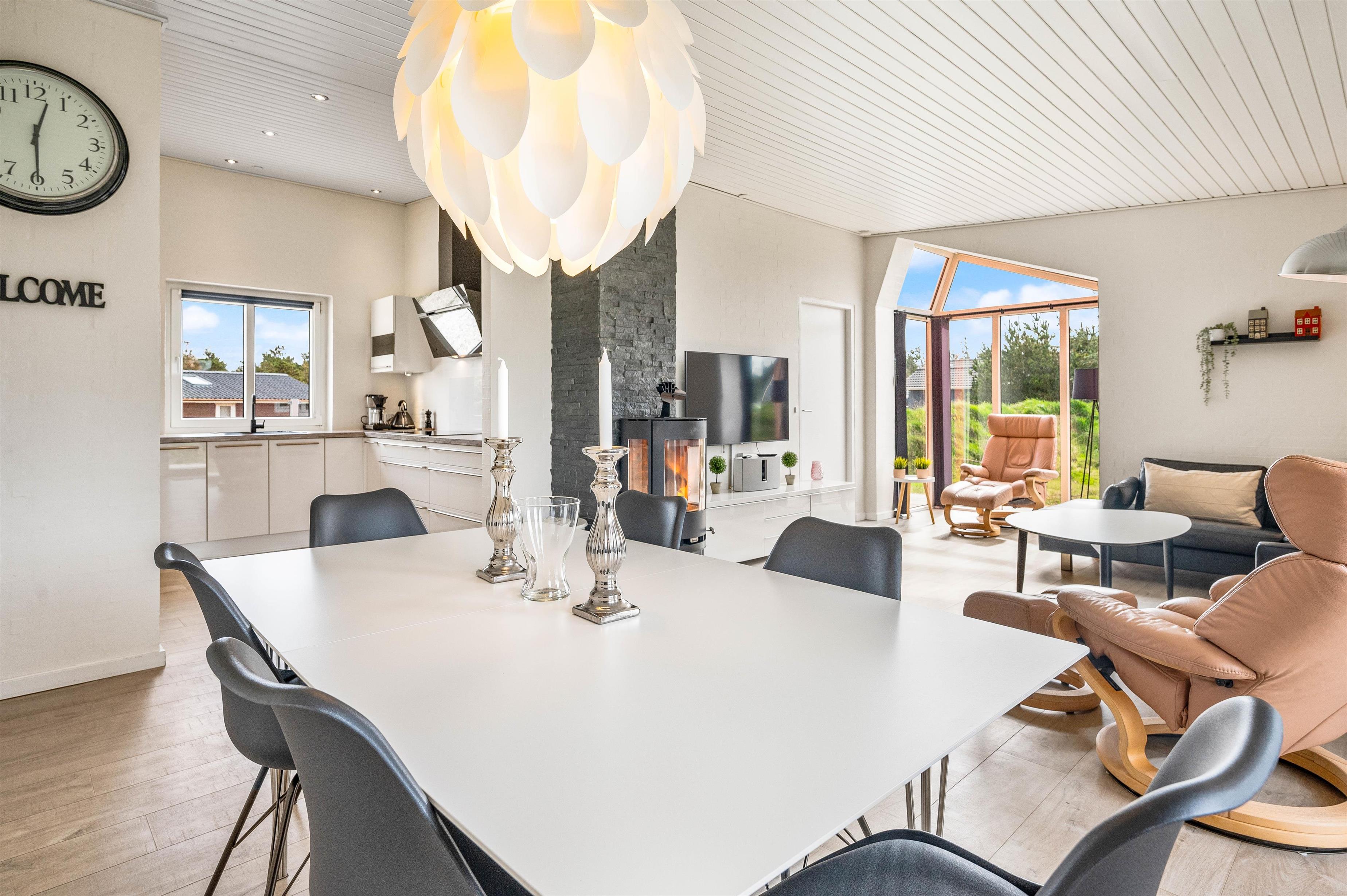 De mange små detaljer giver et helt personligt præg og gør, at I straks vil falde til i det nye hjem for ferien. Spisestuen ligger i forbindelse med køkkenet, og her bliver der tid til masser af dejlige familiestunder med fælles madlavning, hjemmelavede feriemåltider og sene aftener på sofaen foran den knitrende brændeovn.