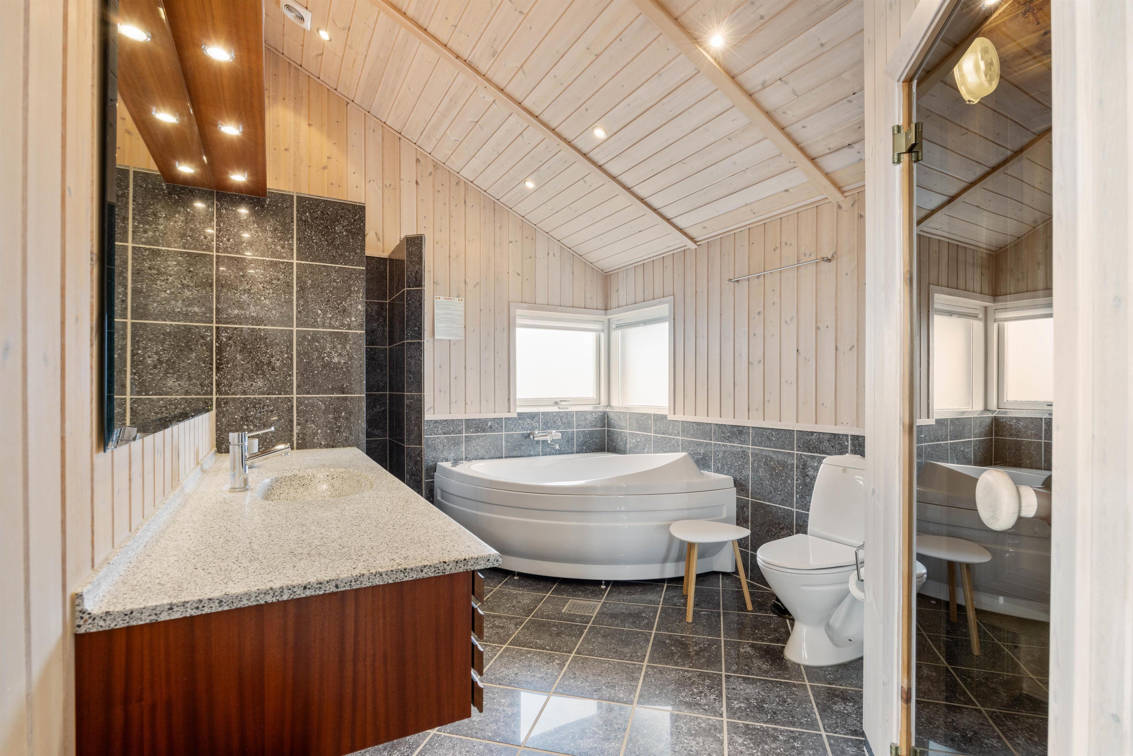 Sommerhuset er indrettet med 2 gode badeværelser, hvoraf det største gemmer på et af feriehusets highlights. Her får I nemlig en skøn wellnessoase med sauna og spabad, hvor I kan lade batterierne op efter en forfriskende dag på stranden.