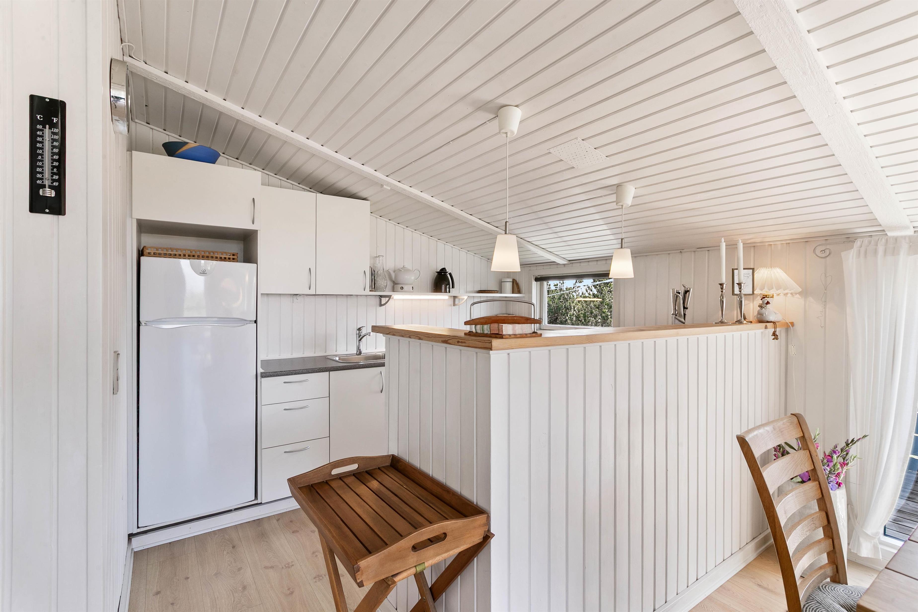 Fra badeværelset er der adgang til sommerhusets sauna, hvor I kan forkæle jer selv lidt ekstra og tanke nye kræfter i varmen - efter ungerne er lagt i seng eller efter en forfriskende gåtur i den salte havluft. Badeværelset har skråvæg ved bruseren, hvilket du særligt vil bemærke, hvis du er over 1,80 meter høj – her kan pladsen være begrænset.