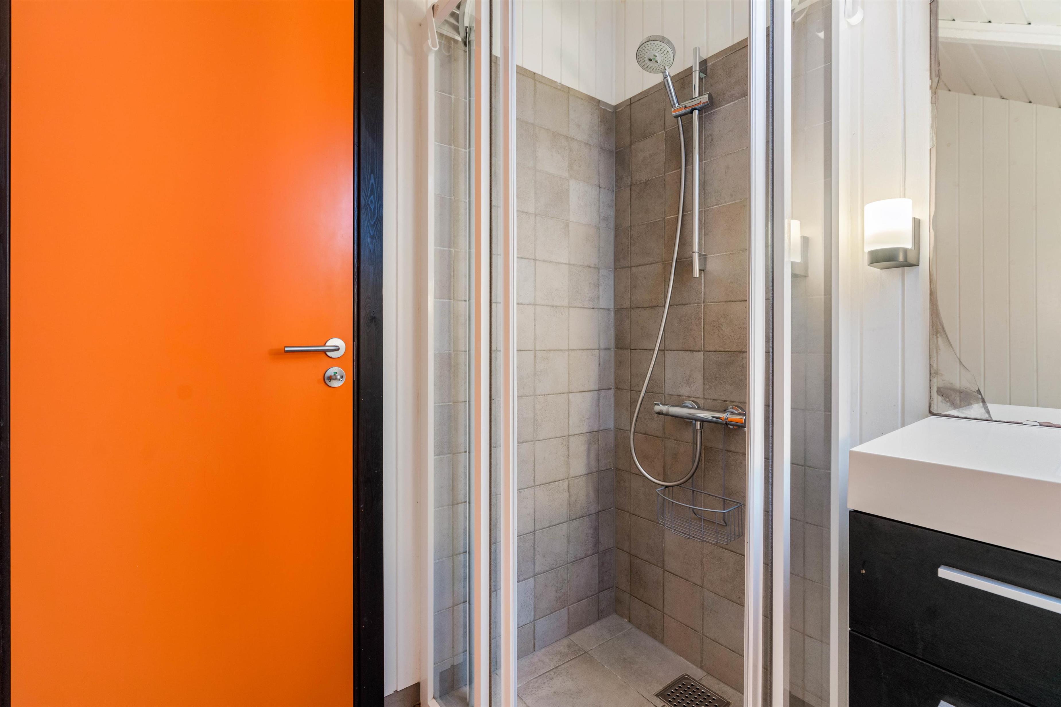 I entréen finder I desuden både vaskemaskine og tørretumbler, så I har mulighed for friske håndklæder. På venstre hånd har I badeværelset, der er udstyret med gulvvarme, så I ikke fryser fødderne om morgenen – ligesom I kan blive varmet godt igennem i saunaen overfor. Dette er godt for muskler og led, og særligt tiltrængt efter en lang gåtur.