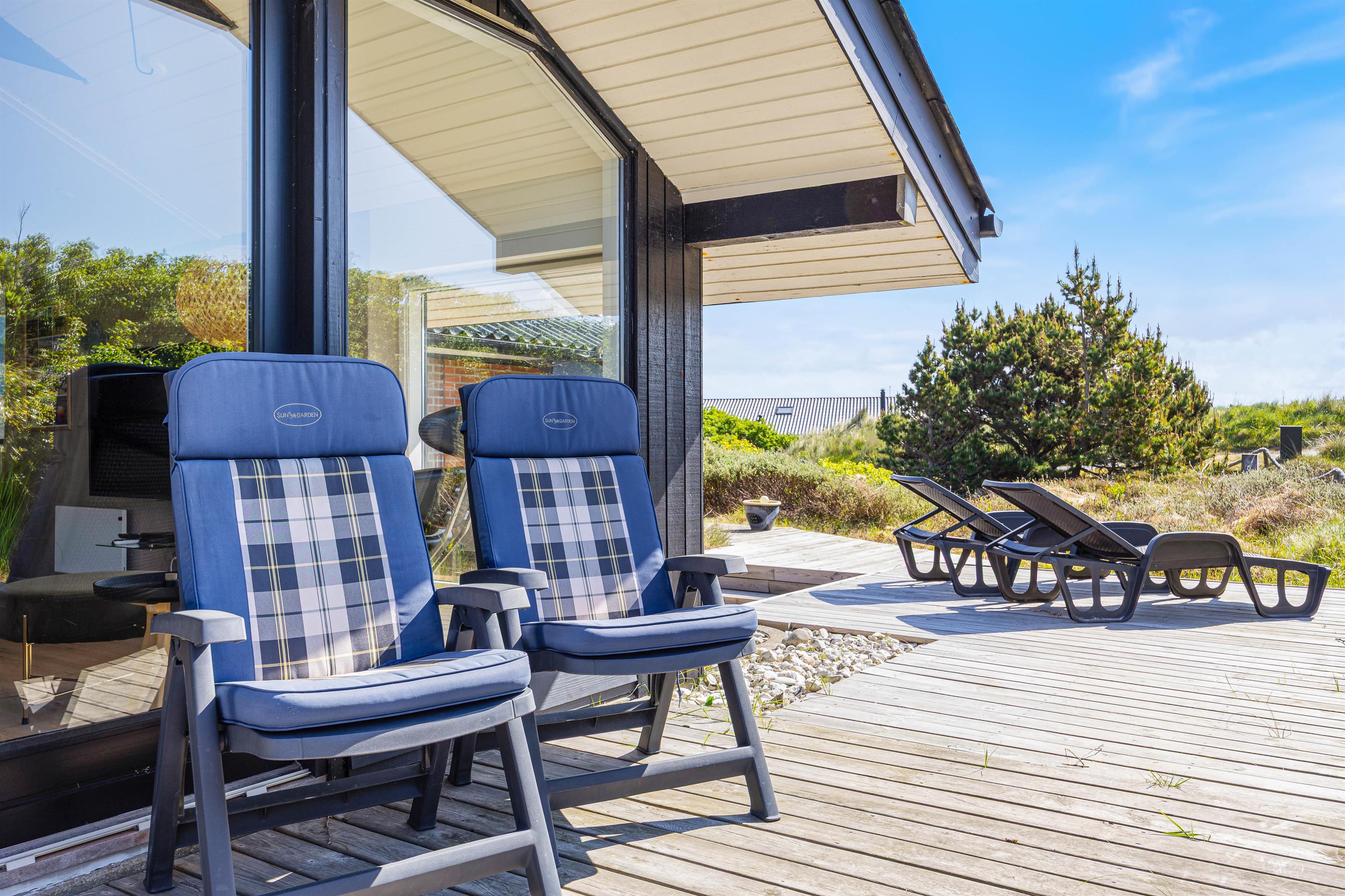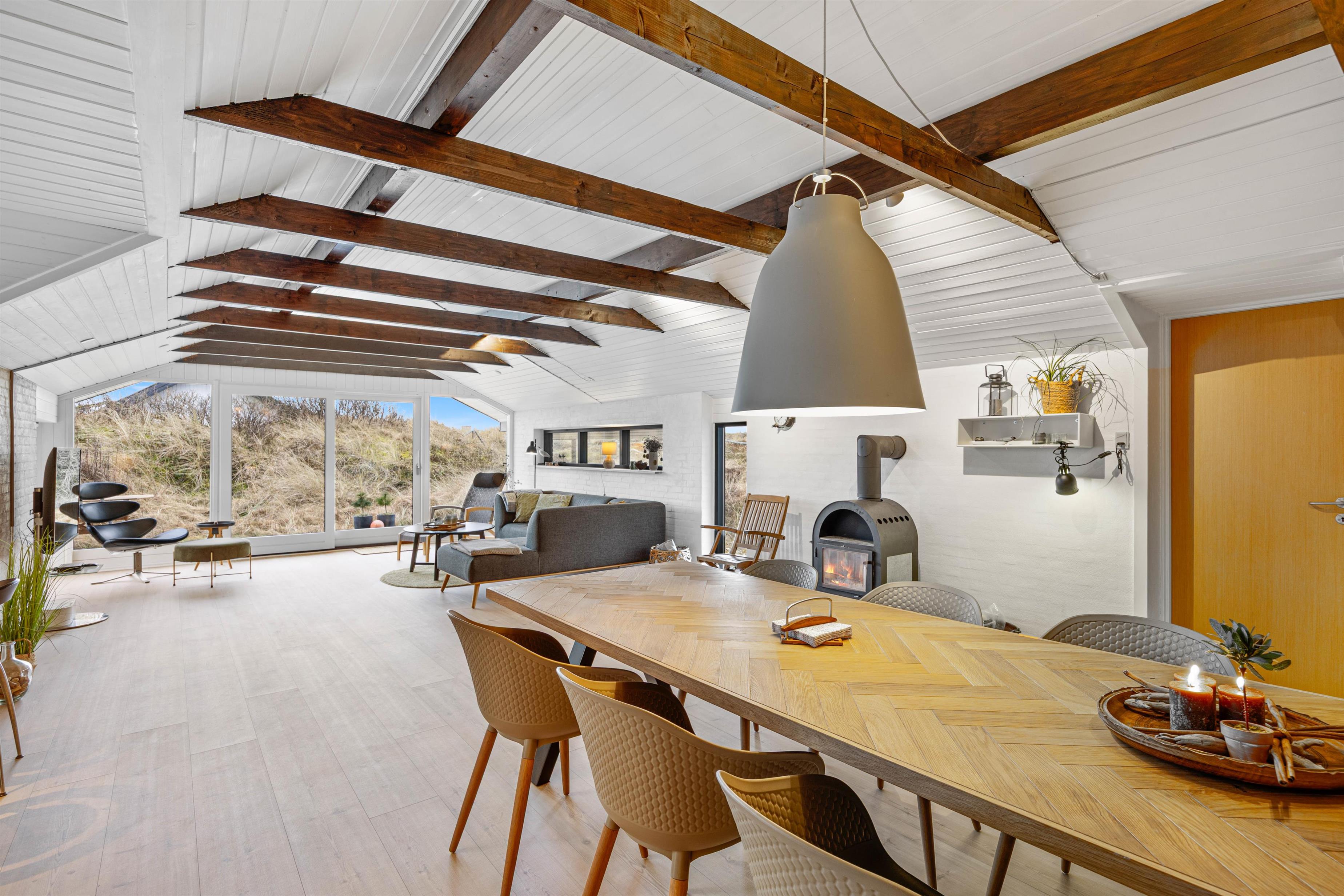 Spisebordet har en fantastisk placering foran stuens panoramavinduer med udsigt til klitterne. Fra stuen har I udgang til den sydvendte terrasse. Afhængig af årstiden kan I hygge jer både ude og inde med følelsen af at sidde midt i den dejlige natur, og klitterne giver god afskærmning til naboer, så I kan føle jer ugeneret. Om aftenen kan I nemt og hurtigt tilberede en lækker middag på husets gasgrill, hvilket er til stor fornøjelse hos både store og små.
