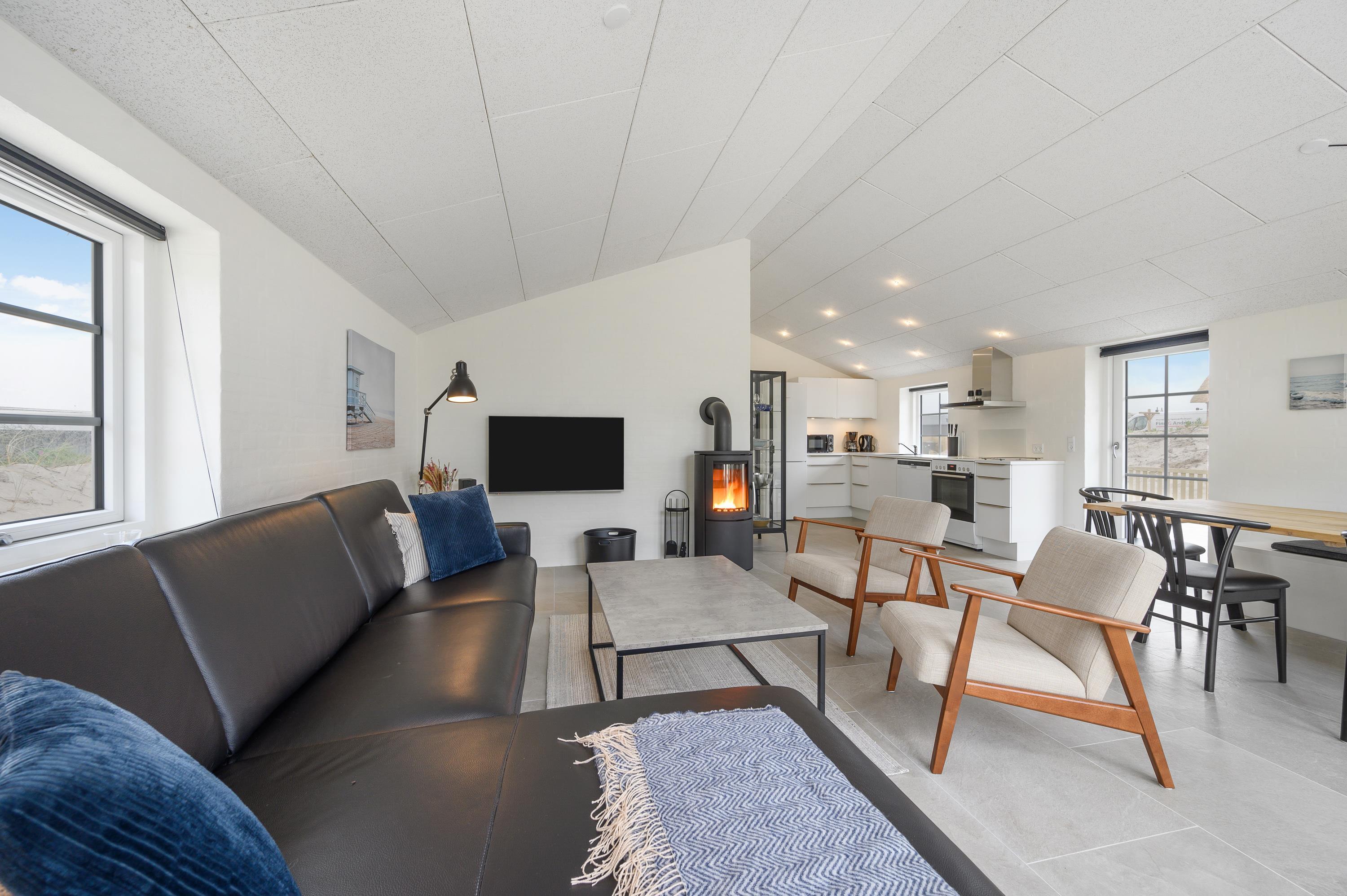 Sommerhusets hjerte er det store opholdsrum, der forener køkken, stue og spiseplads i ét. Her kan I nyde mange hyggelige stunder med hinanden, hvad end det er med fælles madlavning, et hyggeligt spil eller en god film i tv’et. Top det hele af med at tænde op i brændeovnen, der fuldender den gode feriestemning.
