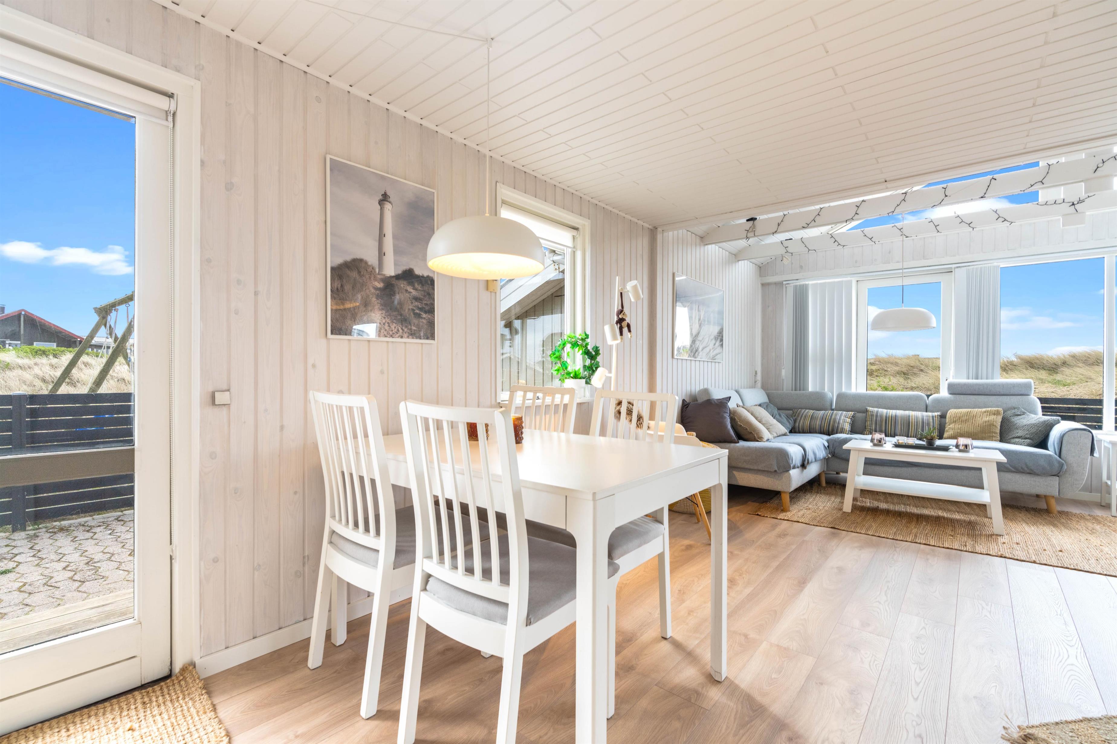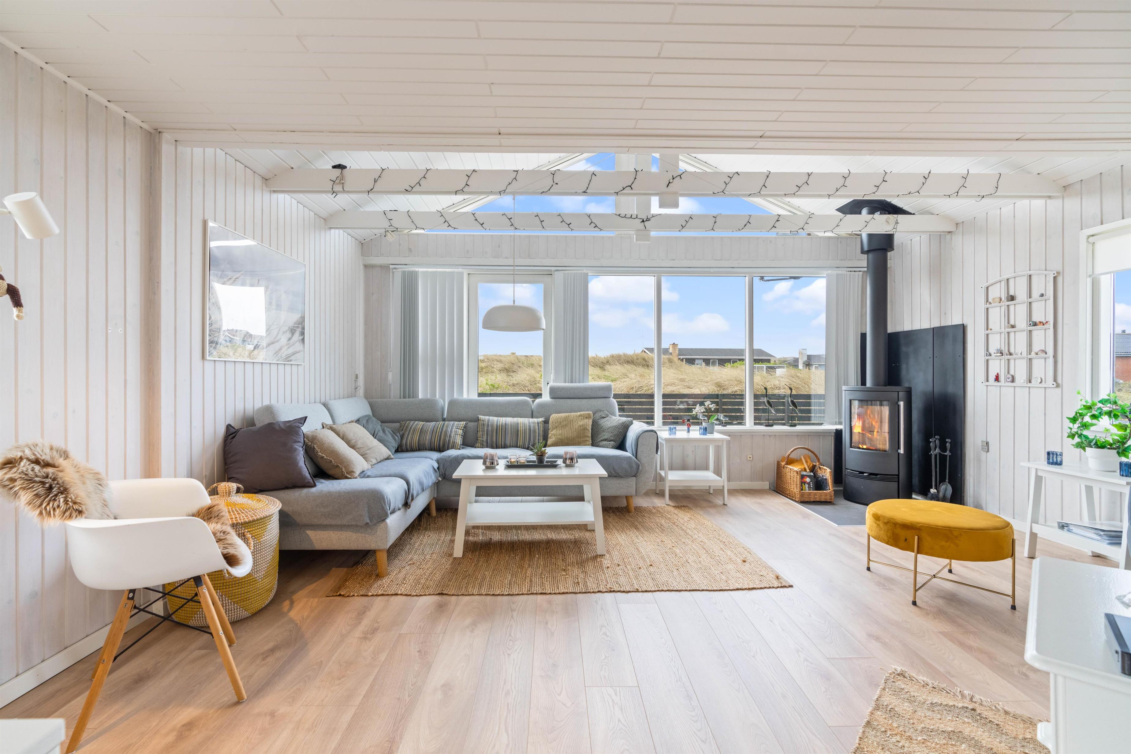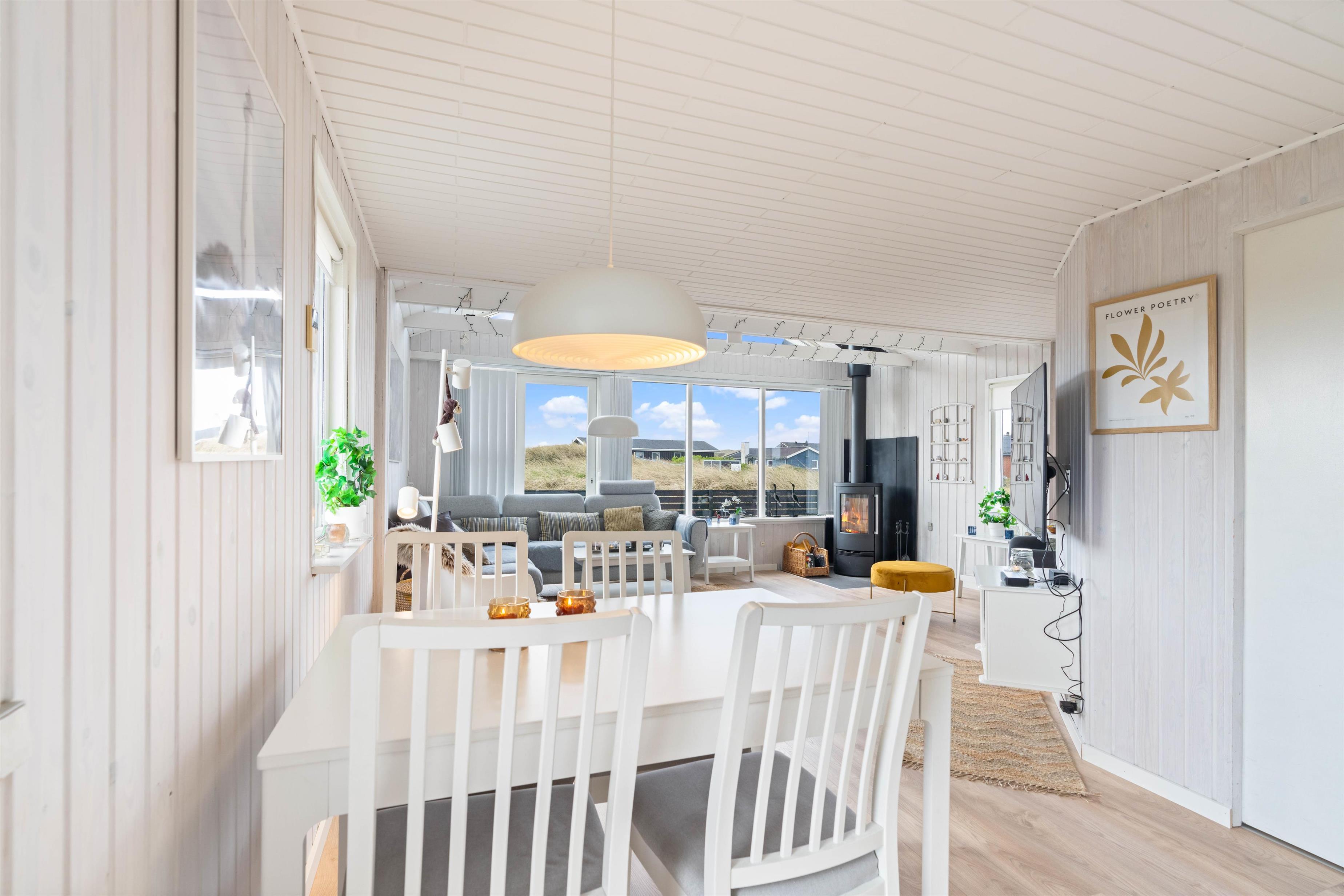 I sommerhuset er der gode lyse rum med lyse trævægge og hvide lofter. Sommerhuset giver et hyggeligt indtryk med god møblering, et funktionelt køkken og en hyggelig brændeovn. Til lyden af den knitrende brændeovn kan I nyde udsigten til den dejlige natur med hede- og klitlandskabet eller se en film i fjernesynet. Der er Chromecast i sommerhuset. I kan med fordel også bruge den energibesparende varmepumpe.