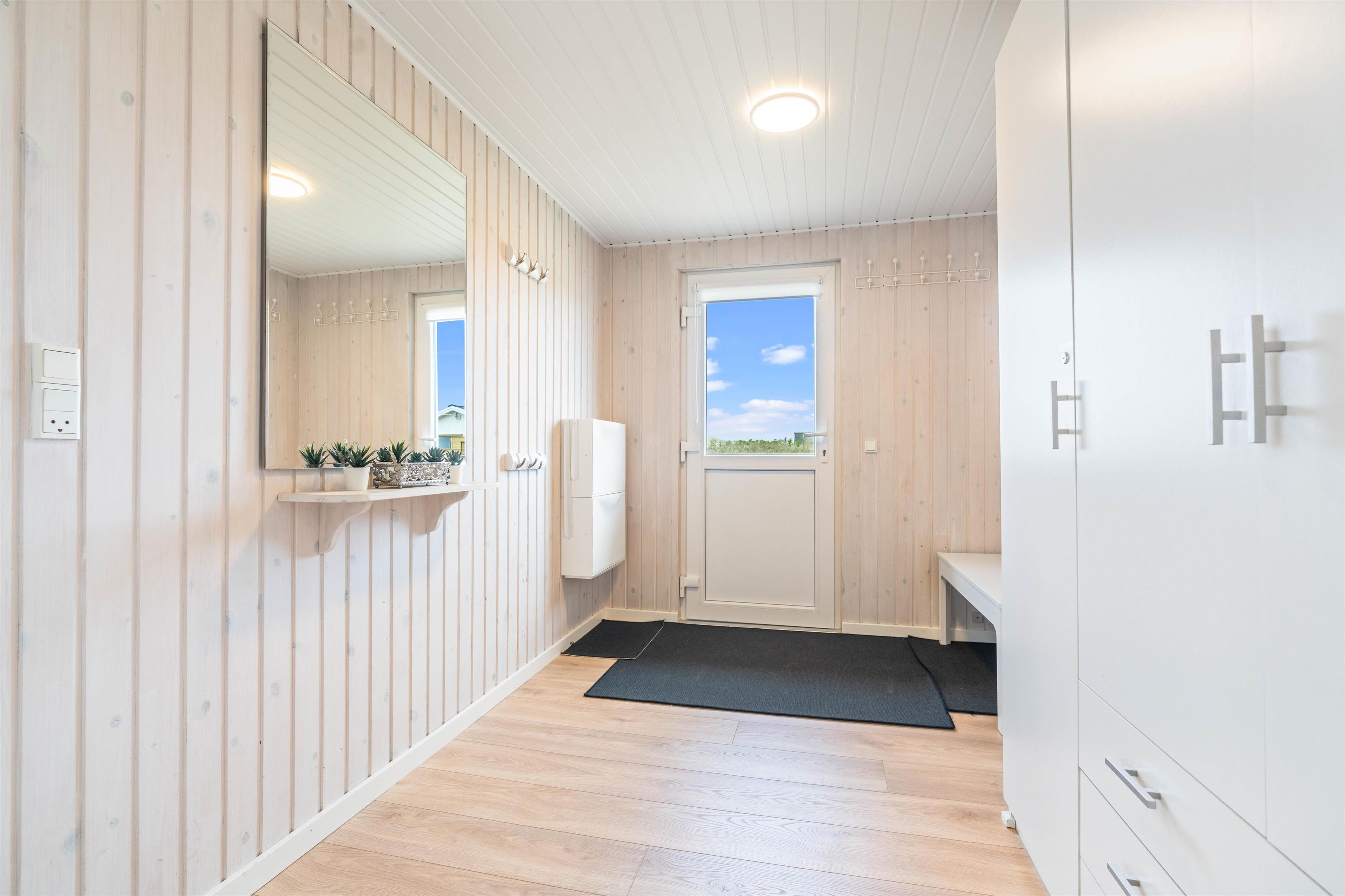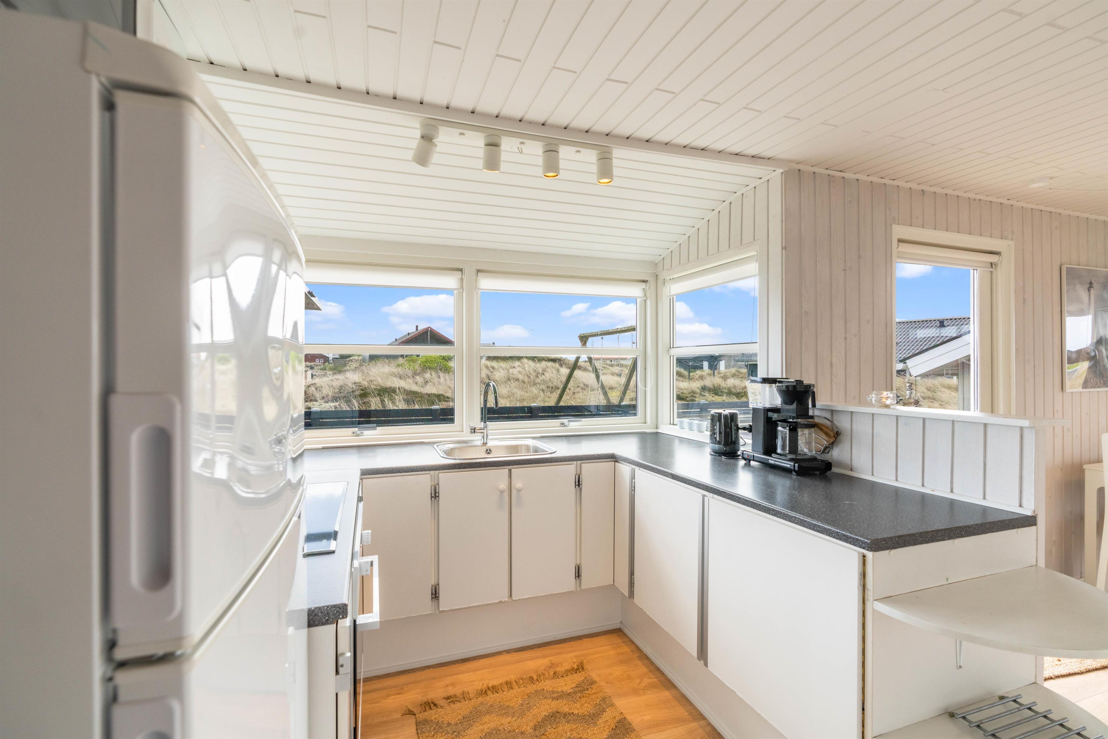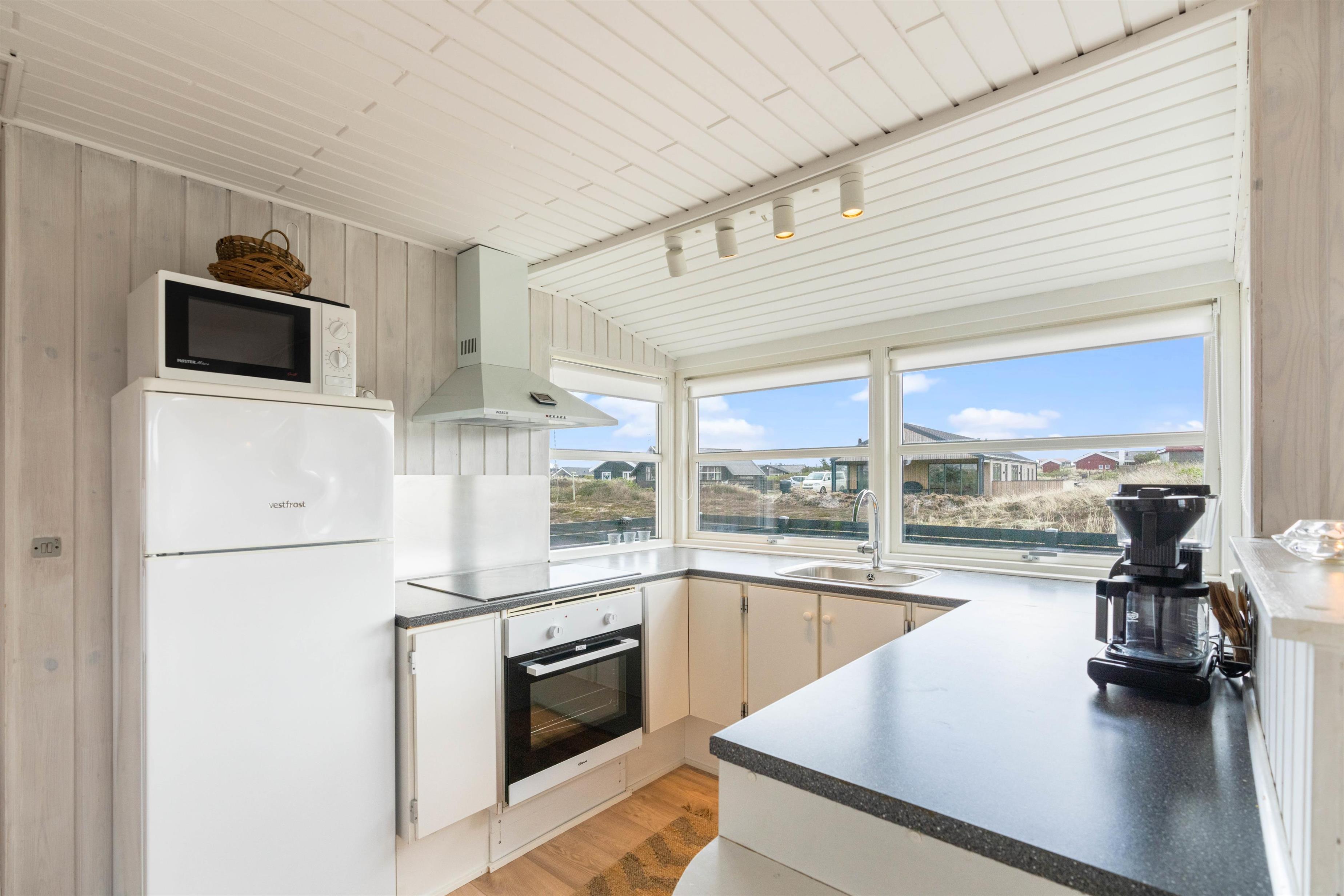 I sommerhuset er der gode lyse rum med lyse trævægge og hvide lofter. Sommerhuset giver et hyggeligt indtryk med god møblering, et funktionelt køkken og en hyggelig brændeovn. Til lyden af den knitrende brændeovn kan I nyde udsigten til den dejlige natur med hede- og klitlandskabet eller se en film i fjernesynet. Der er Chromecast i sommerhuset. I kan med fordel også bruge den energibesparende varmepumpe.