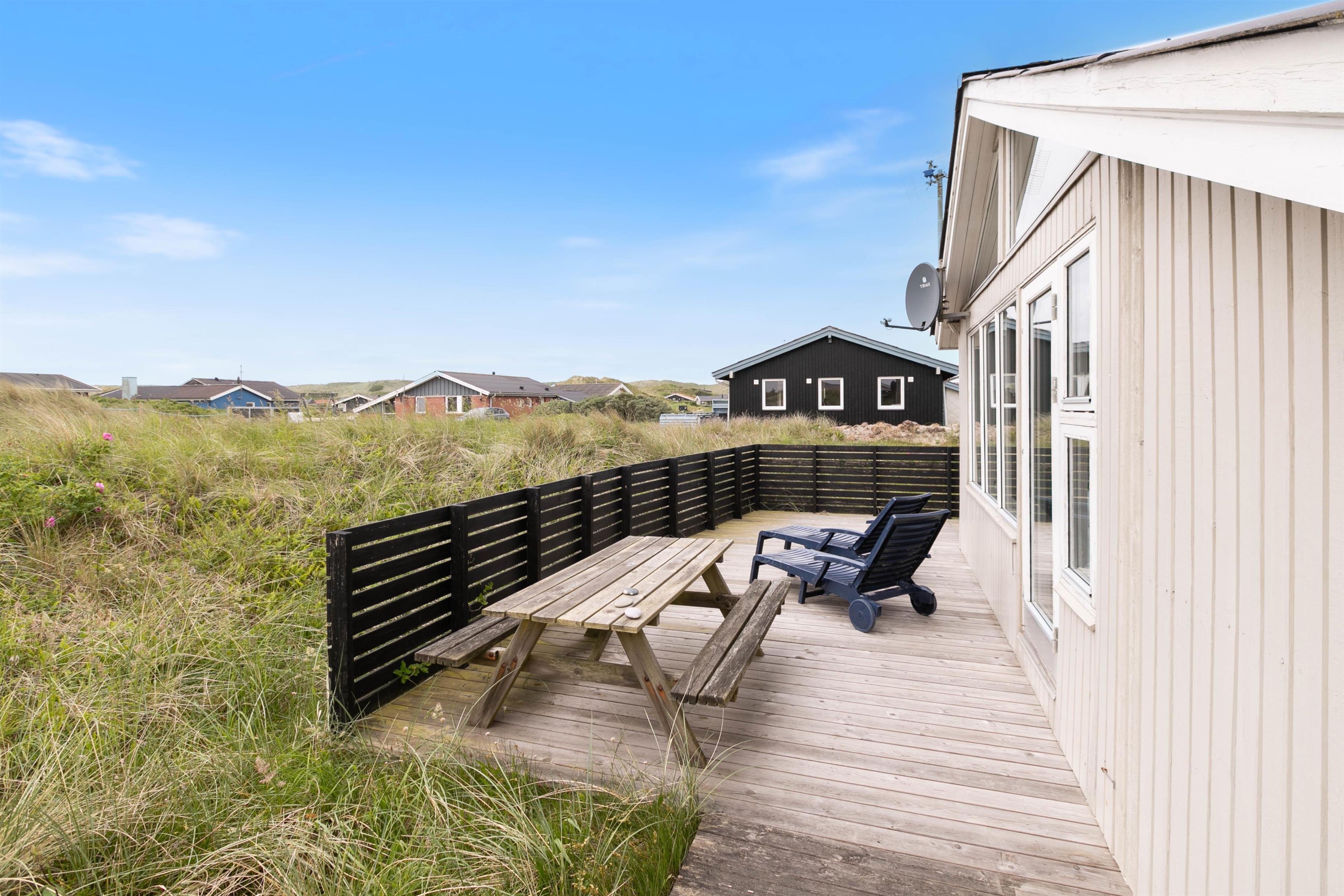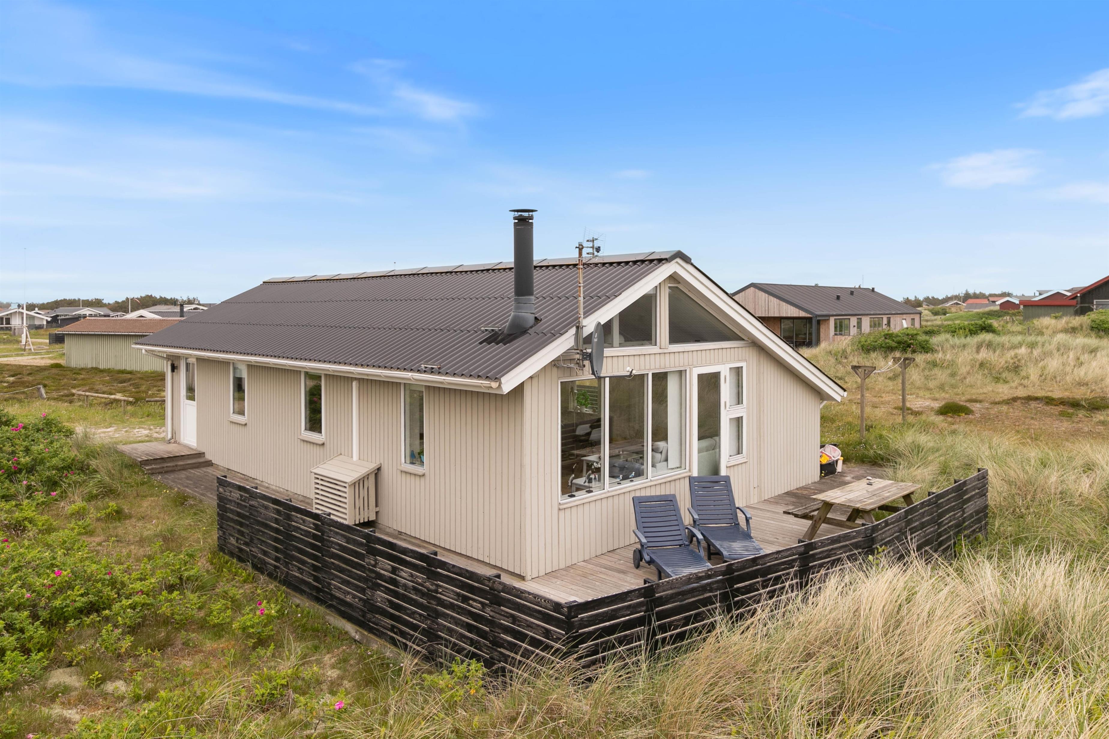 På de afskærmede terrasser kan der altid findes en lækrog, hvor I kan nyde solen og naturen i det skønne Bjerregård på vestkysten i Danmark med den friske havluft. På sommerhusets naturgrund finder I både gyngestativ og sandkasse, hvor børnene kan lege, mens I nyder solen på solvognen eller læser en god bog. Klitterne og den dejlige sandstrand ligger blot 350 meter fra feriehuset og indbyder til både badning og gode traveture. Mærk sandet mellem tæerne og find rav langs vandkanten.