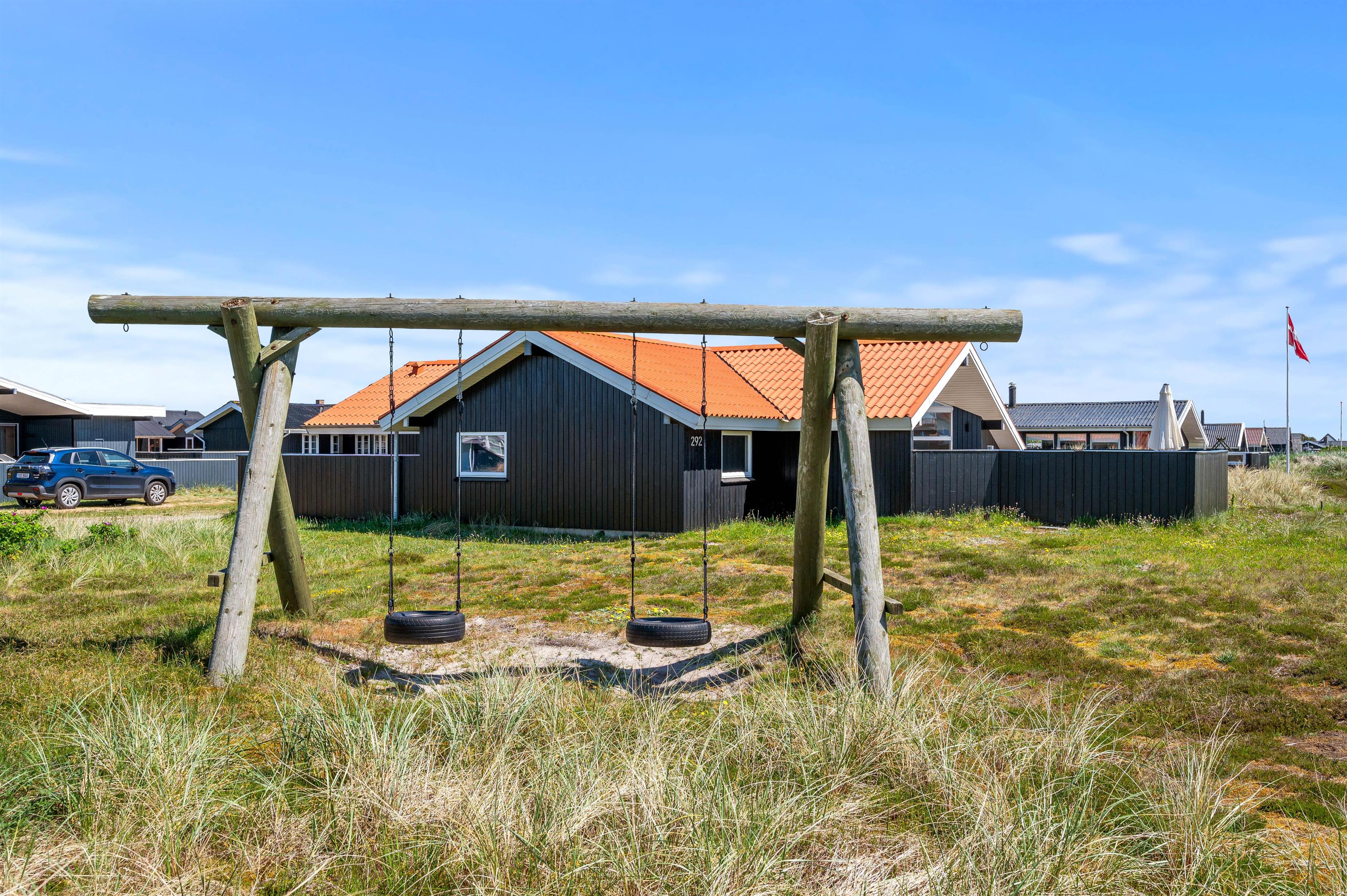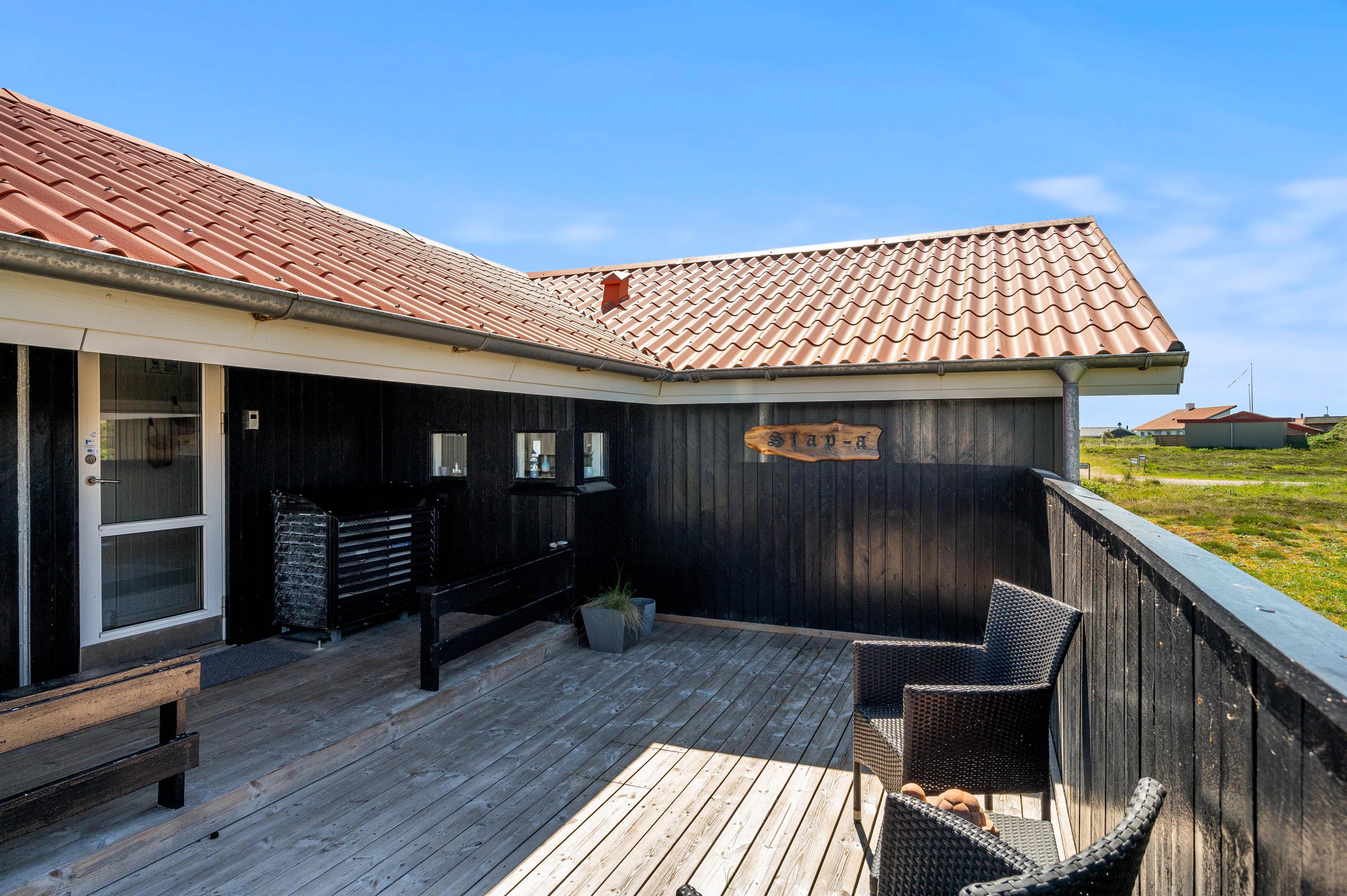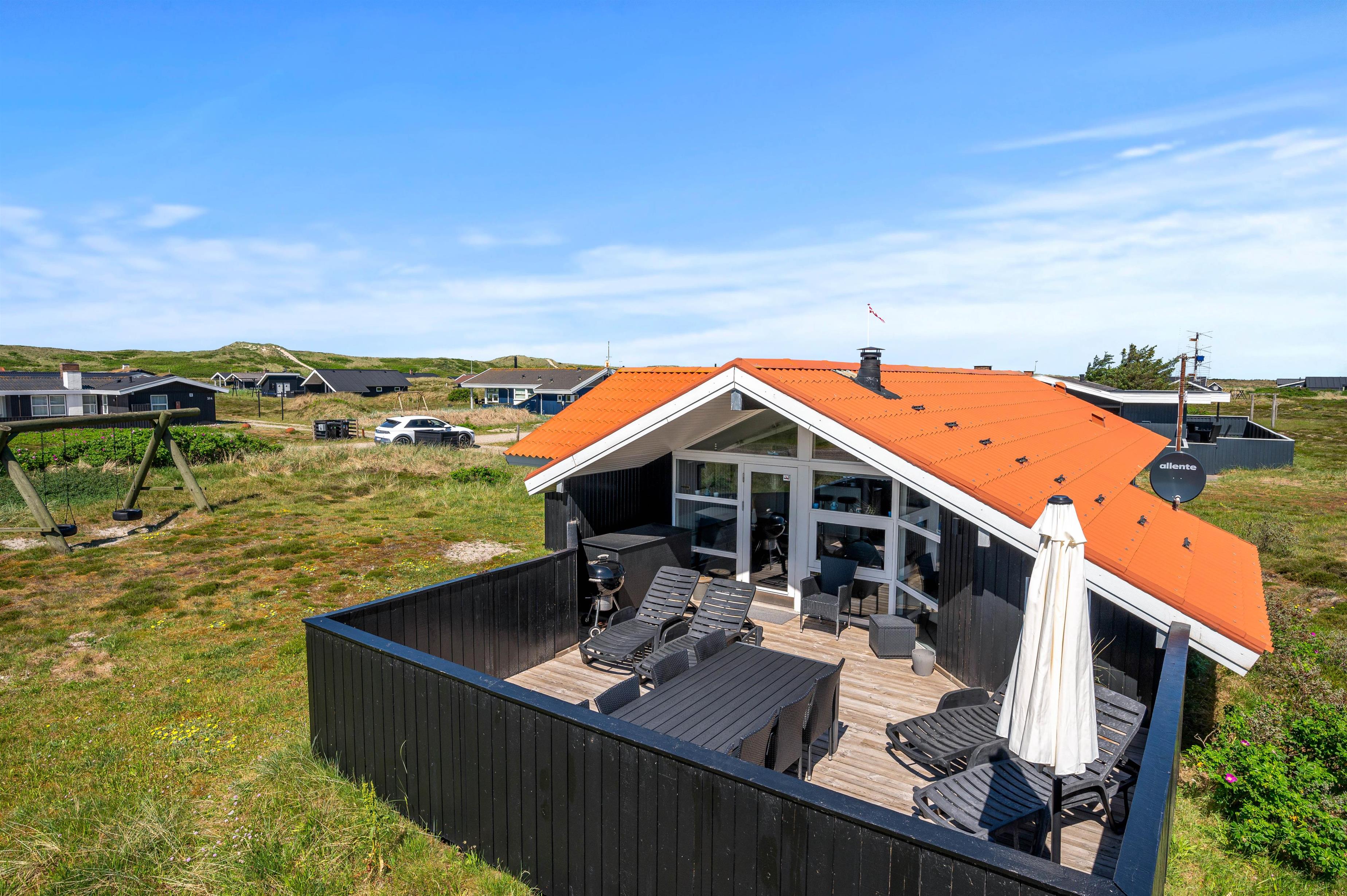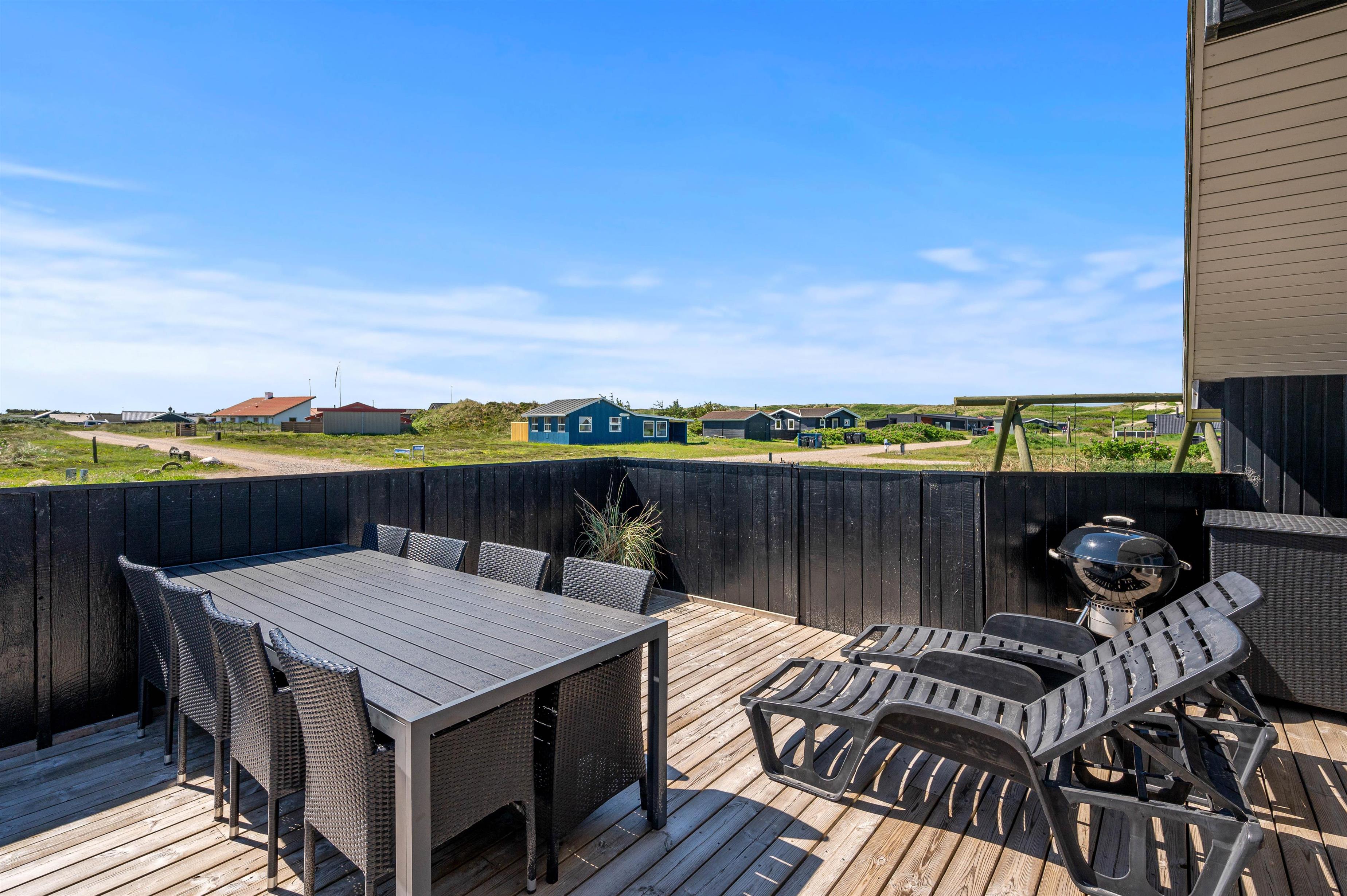 Den skønne, lukkede og delvist overdækkede terrasse byder på solbadning i komfortable liggestole eller afslapning i havemøblerne. Her kan I også nyde opholdet i den friske vesterhavsluft i tæt kontakt med naturen. Børnene kan brænde energi af på gyngerne, og I kan slutte dagen af med at tænde op i grillen til et lækkert grillmåltid, som I nyder, imens skyggerne bliver lange. Undlad ikke en gåtur til stranden, som kun ligger 450 meter væk. En solnedgang ved Vesterhavet er altid en oplevelse.