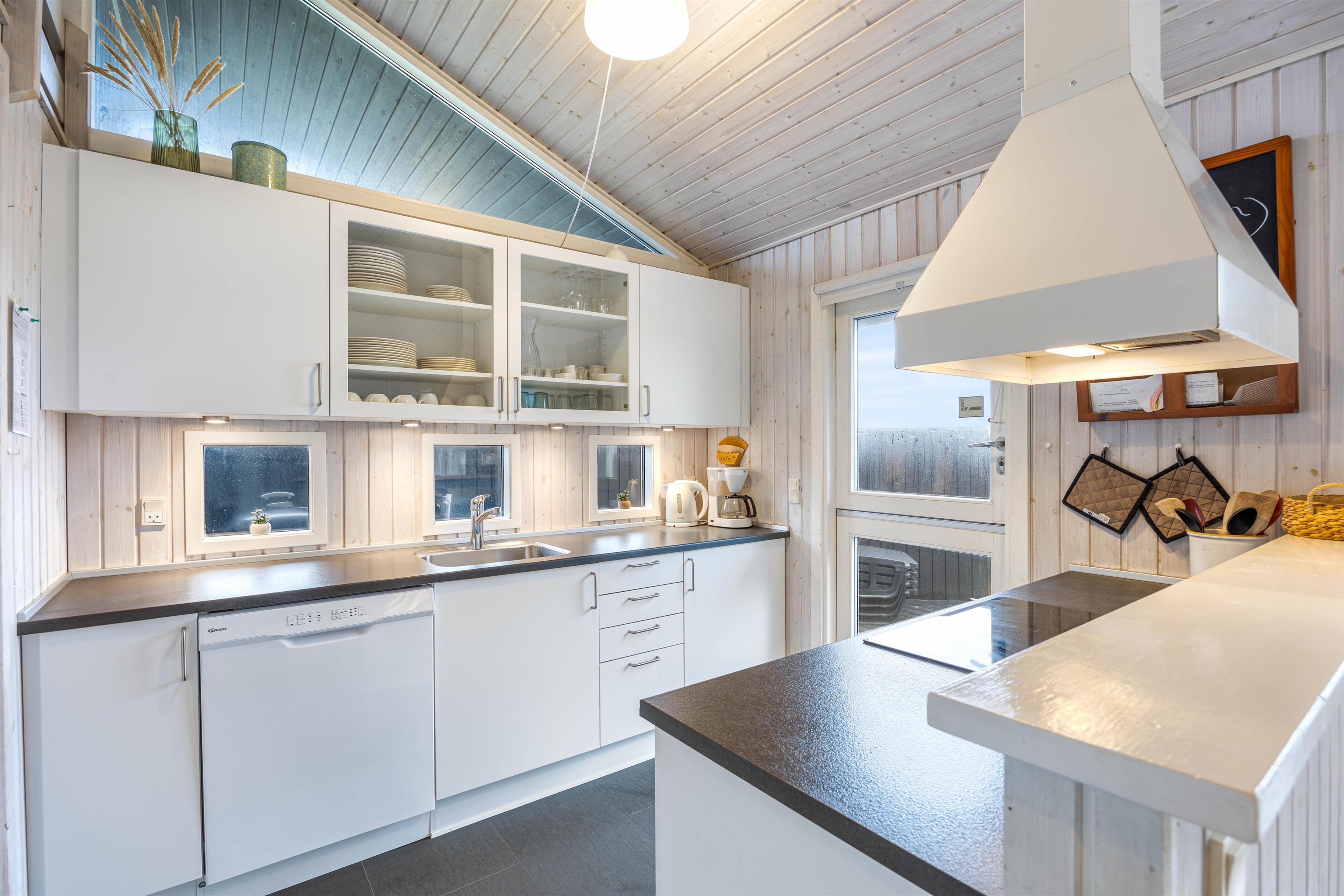 Feriehuset på 89 m2 har 3 fine soveværelser og en hems, hvor der er en ekstra madras. Her kan I hvile ud efter en dejlig dag fyldt med aktiviteter og gode stunder. Stuen er hjertet i feriehuset, og her kan I slappe af foran brændeovnen. Indretningen er lys, og dagslyset strømmer ind gennem de mange vinduer. Her er mange hyggelige kroge, hvor I kan nyde en friskbrygget kop kaffe og en god bog. Fra stuen er der åbent ud til køkkenet og spiseafdelingen, hvor I kan samles om lækre retter og gamle brætspil. Her hænger en energibesparende varmepumpe, så I hurtigt kan holde på varmen. I stuen, ved spisestuen og på alle værelser er der trægulv.
