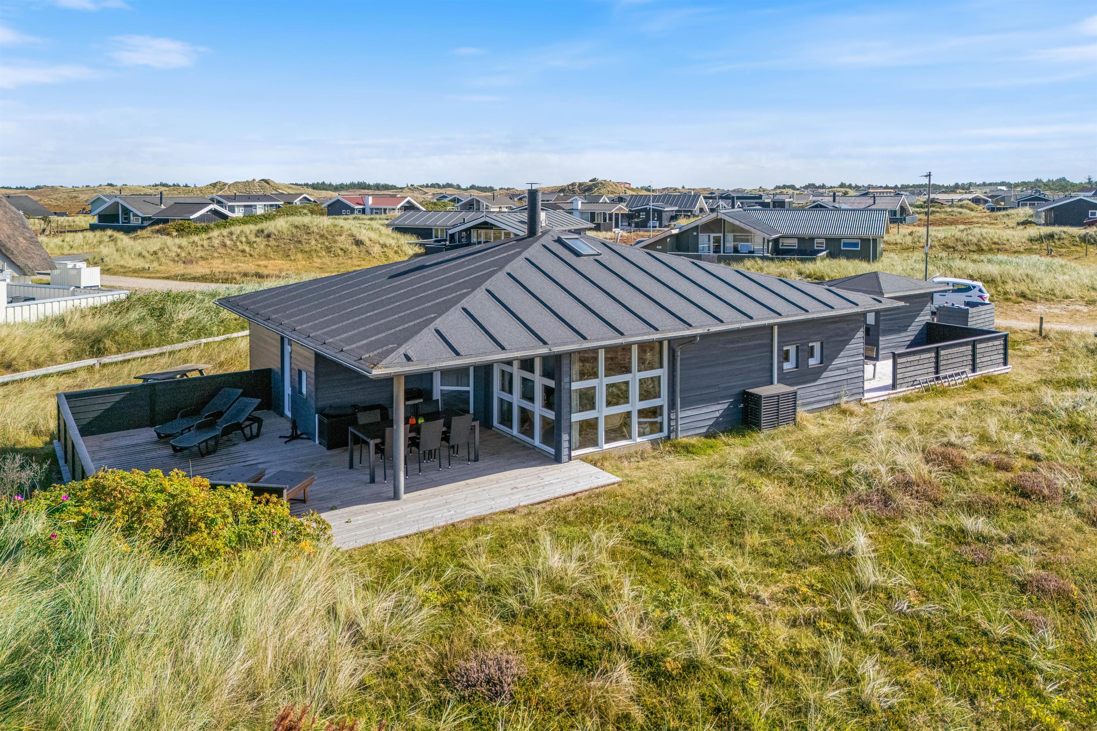 Lige bag yderste klitrække finder I dette interessante feriehus – kun 100 meter fra stranden. Feriehuset er kvadratisk bygget i en spændende byggestil og med sjove lysindfald, og det ligger på Bjerregårdsvej 402, lige i udkanten af det populære feriehusområde Bjerregård.
