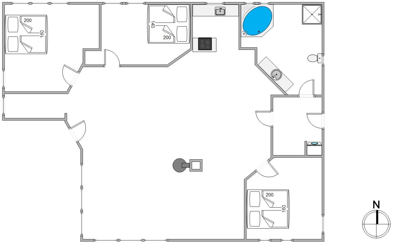 Ud fra opholdsrummet finder I de 3 fine soveværelser med hver en dobbeltseng. Det praktisk indrettede badeværelse er med en nedsænket spa, som indbyder til afslapning og hygge efter en lang dag ved stranden og i klitterne.