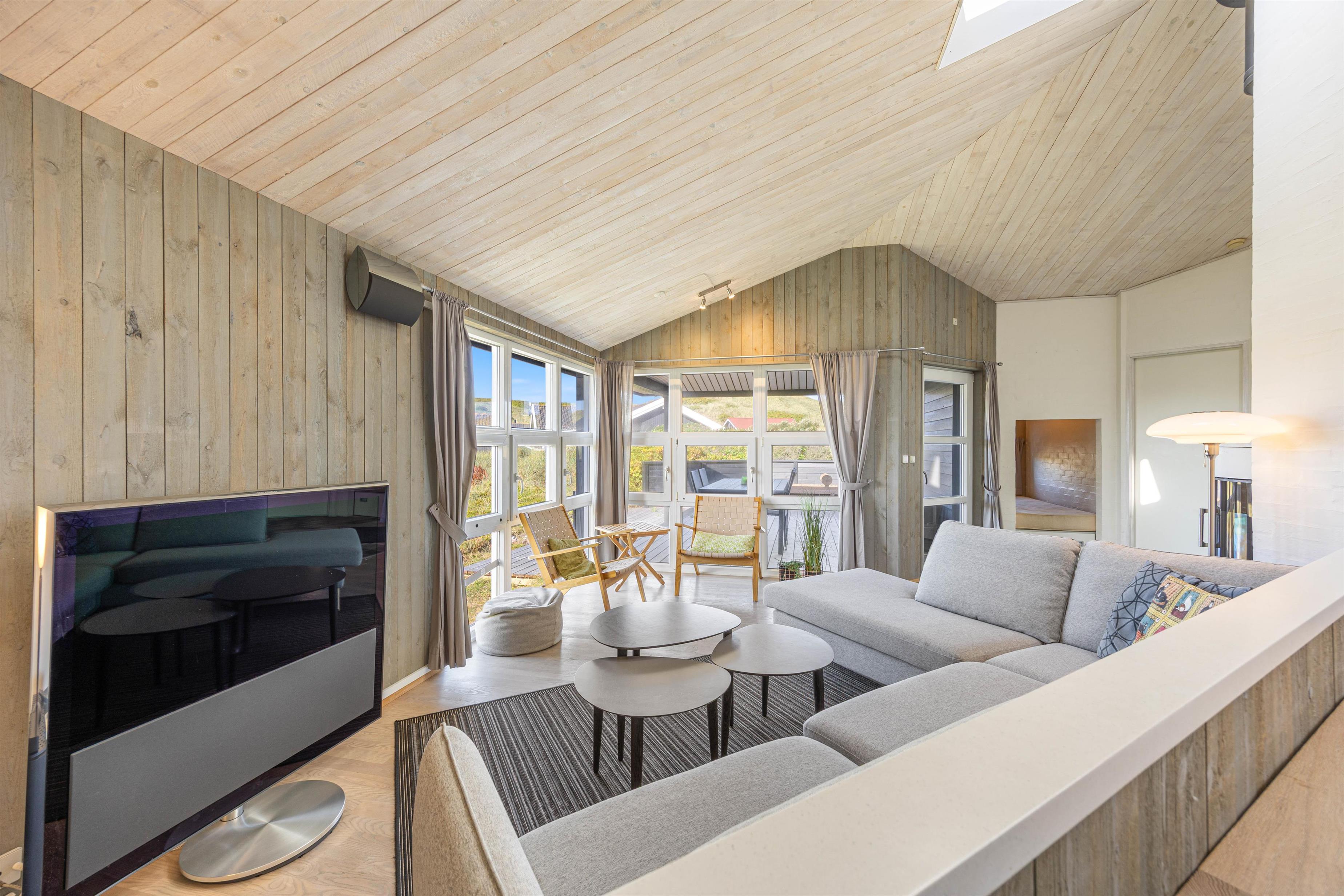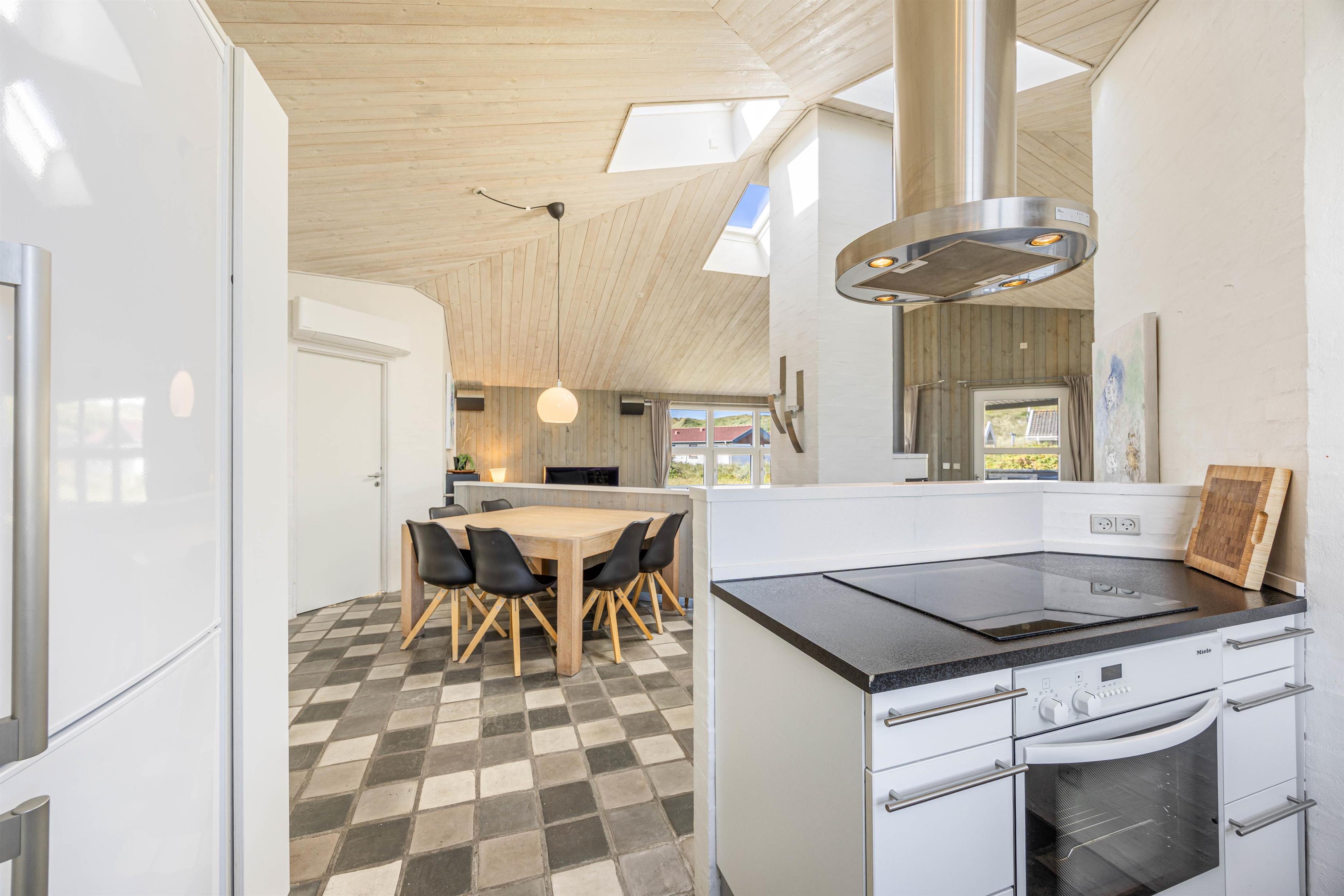 På den ene side af halvmuren finder I den veludrustede køkkenafdeling med bl.a. 50 l. fryser, mikroovn og opvaskemaskine, samt den hyggelige spiseplads. Stueafdelingen befinder sig på den anden side af halvmuren – med det hyggelige sofahjørne og de store panoramavinduer, som inviterer naturen med helt ind i stuen.