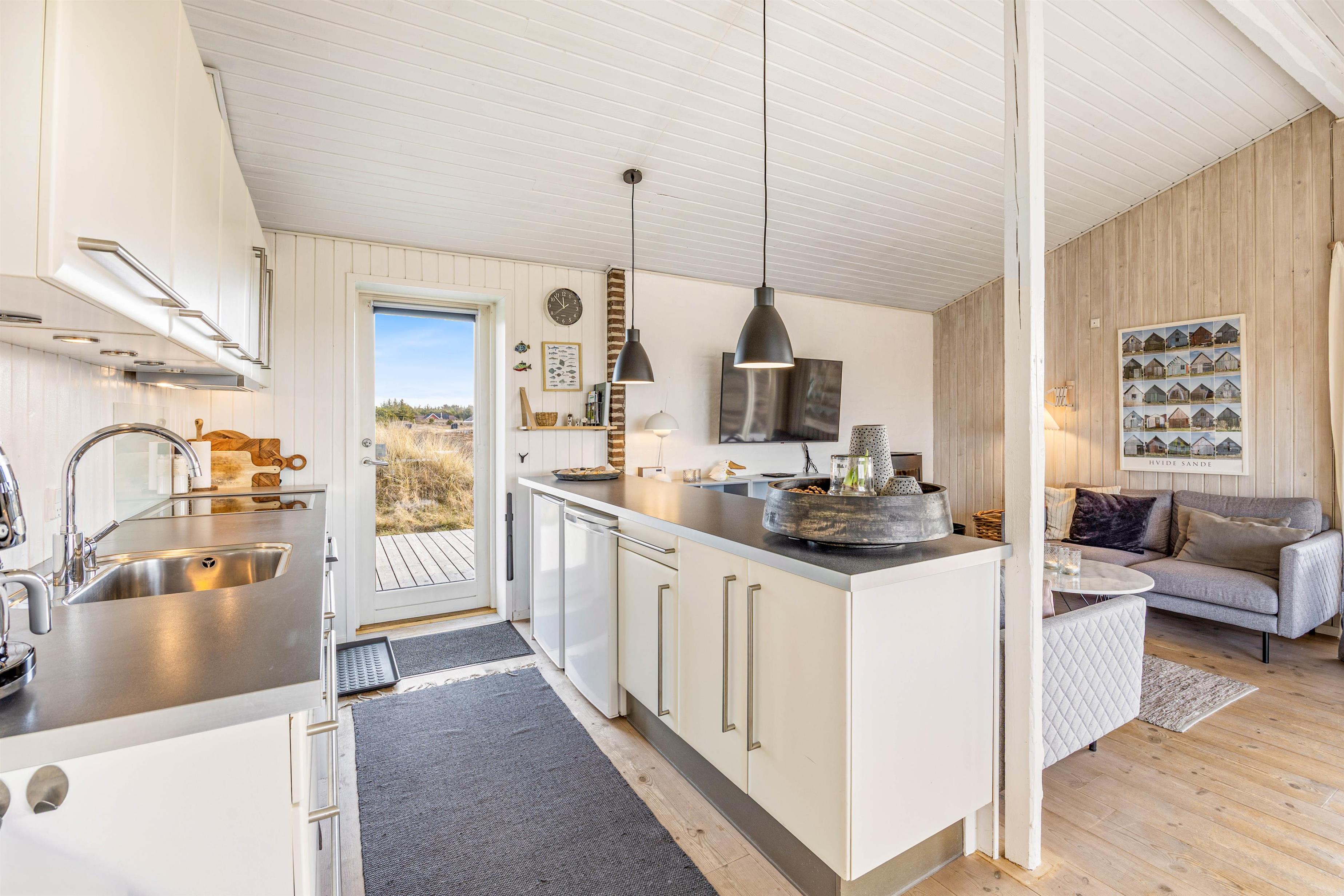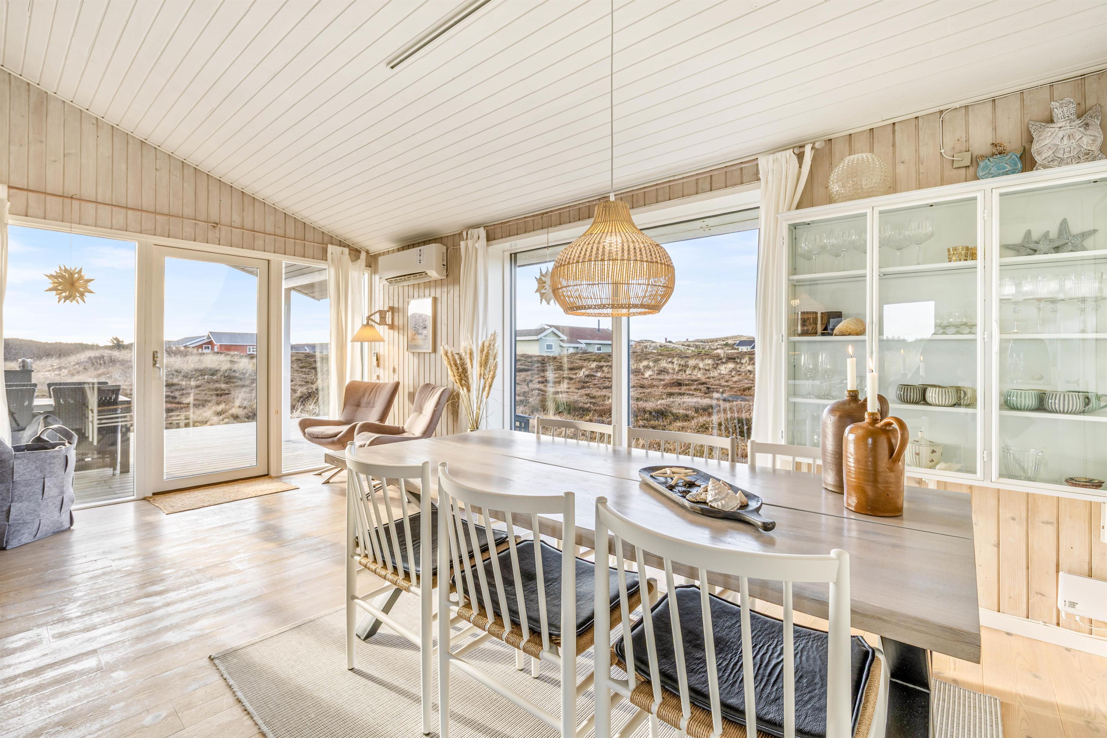 Fra opholdsrummet kan I gå direkte ud på den sydvendte terrasse, hvor I kan nyde de varme sommerdage. Terrassen fortsætter til østsiden af sommerhuset, så I kan drikke en kop kaffe til den skønne udsigt af solopgangen.