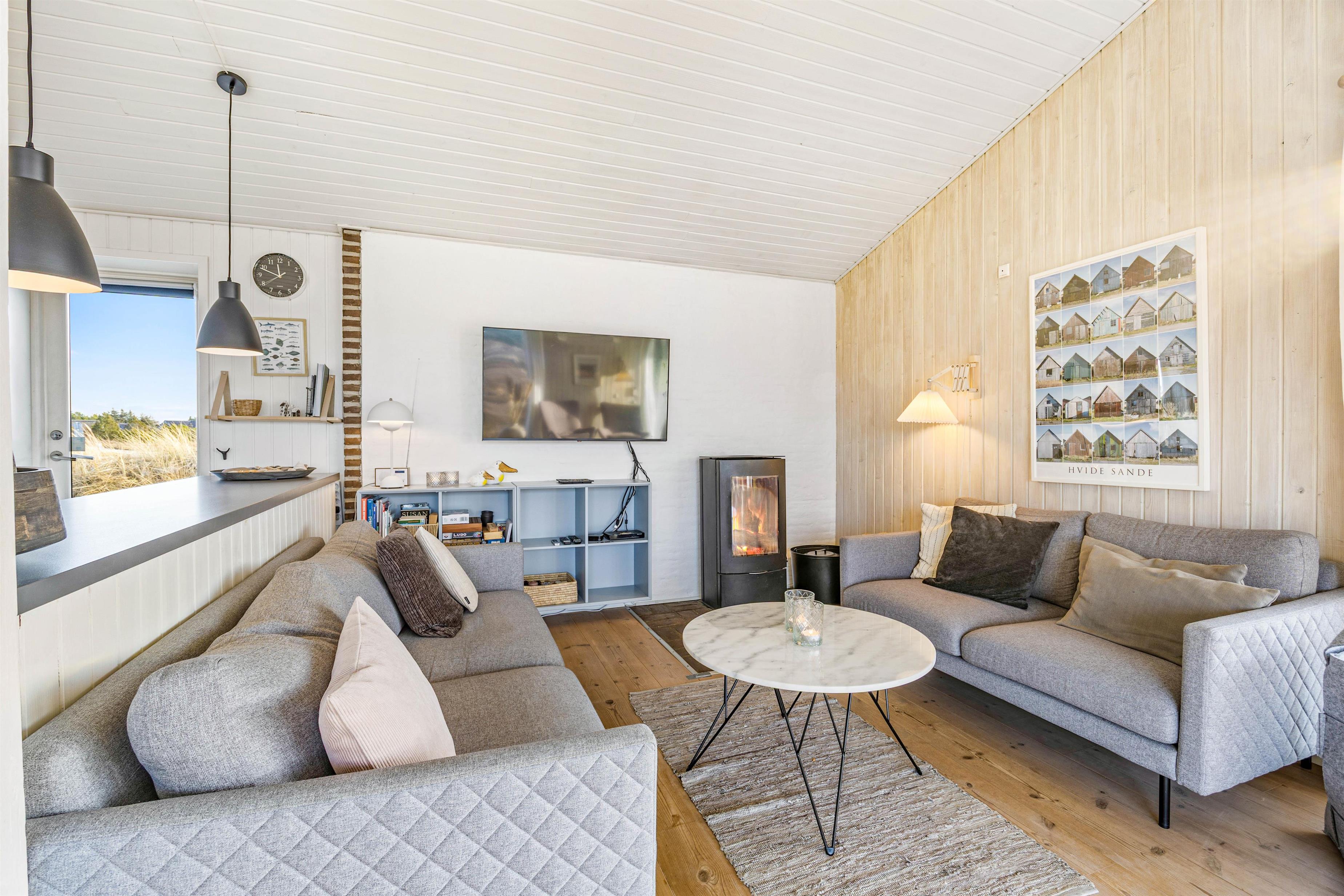 I åben forbindelse med det veludstyrede køkken ligger den hyggelige stue, hvor familien kan nyde hinandens selskab, læse en god bog og drikke en kop kaffe, mens brændeovnen knitrer i baggrunden.