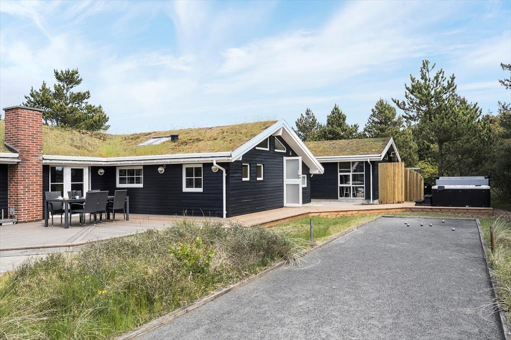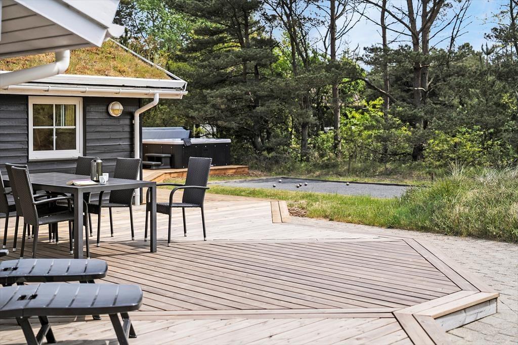 Selvom husets indre er lyst og indbydende, vil I formentlig tilbringe mest mulig tid ude i det fri, når solen skinner. Den 2040 m2 store naturgrund er nemlig særdeles skøn, så her kan I lege, slappe af og nyde ferielivet fuldt ud. Mellem den vilde beplantning er der både petanquebane, sandkasse og legestativ, mens en stor og delvist overdækket træterrasse breder sig syd for sommerhuset. Et udendørs spabad er prikken over i’et, for at sidde her under stjernehimlen bliver helt klart en mindeværdig ferieoplevelse.