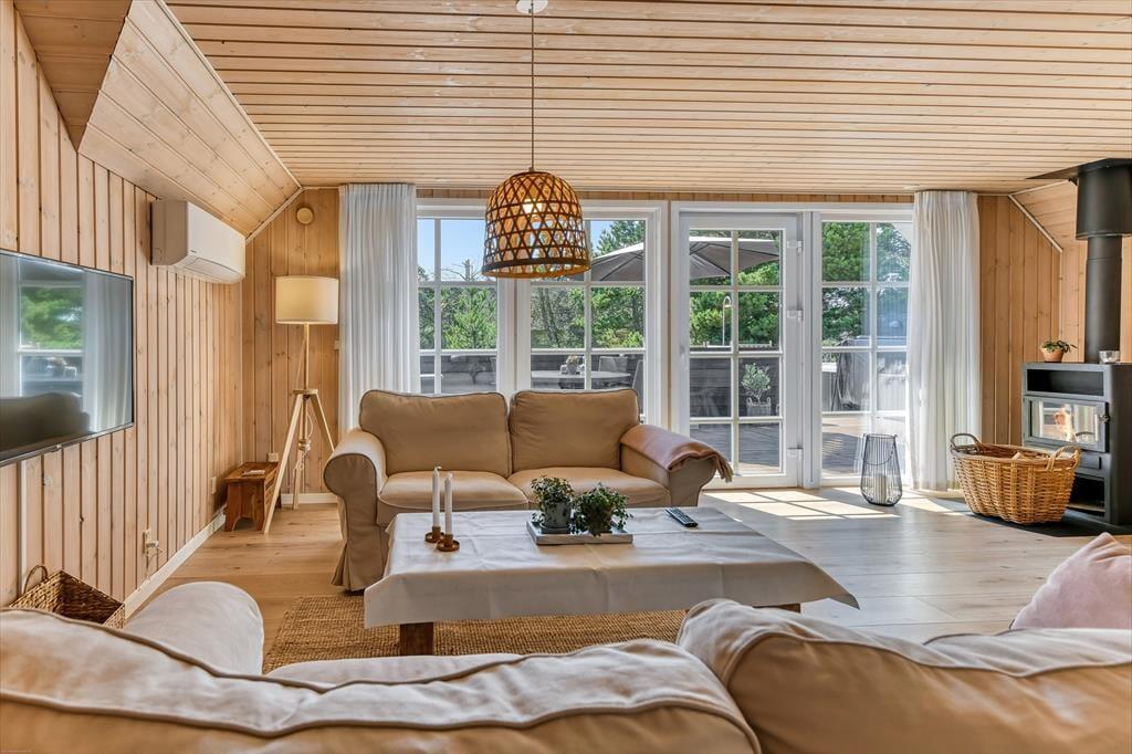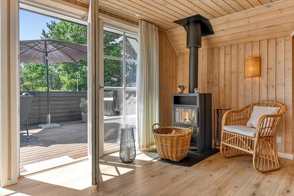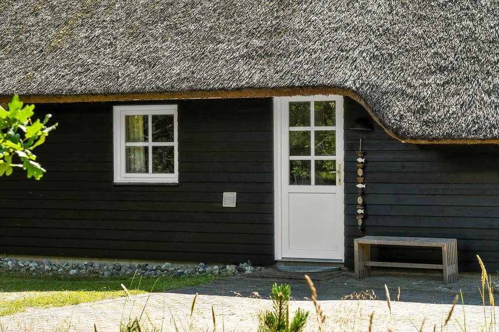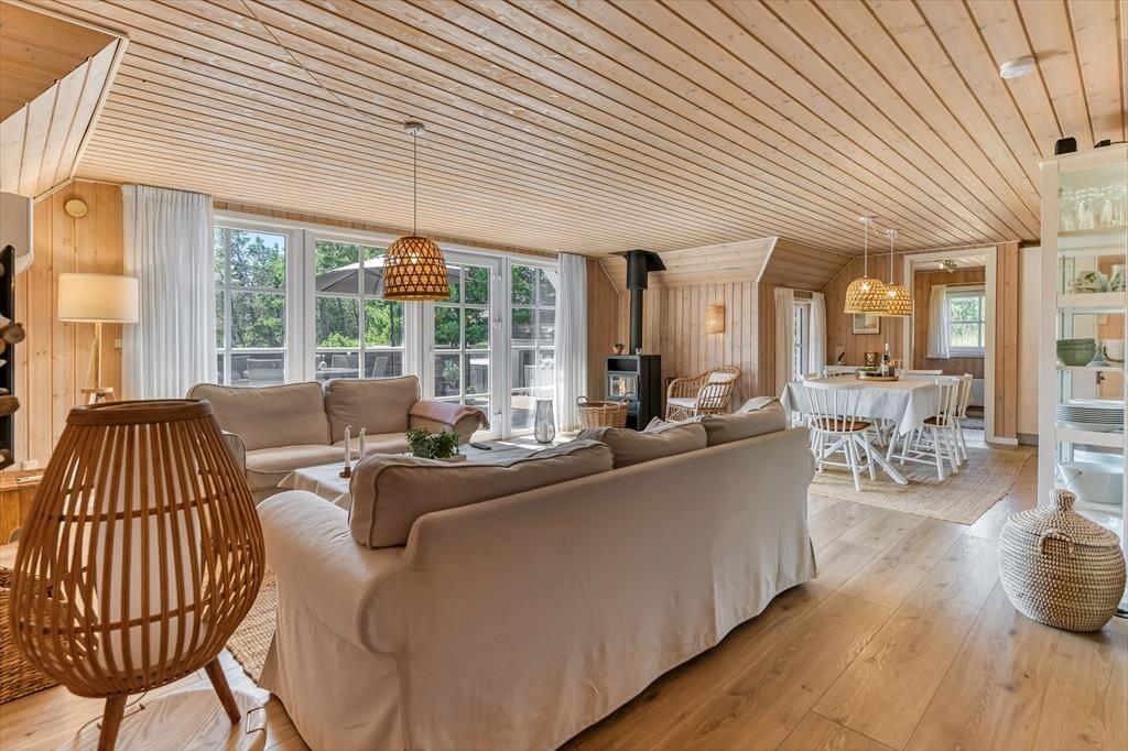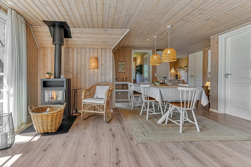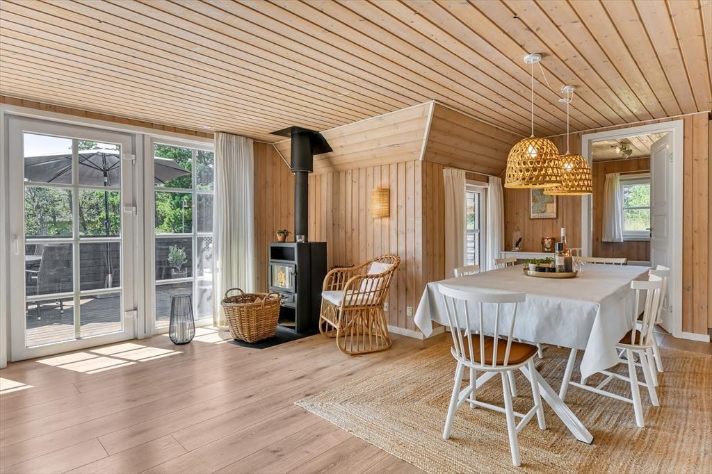 Det stråtækte træhus er blevet grundigt moderniseret inden for den seneste årrække, og det kan tydeligt både ses og mærkes i de stilfuldt indrettede rum. Interiøret er lyst og indbydende, så det er fristende at bruge en stor del af ferien på at hvile, lege og hygge sig i ro og mag. Køkken og stue ligger i åben forbindelse, og i nærheden af både spisebordet og sofaafdelingen står en brændeovn, som du kan tænde op i, hvis vejret kalder på ekstra varme og hyggestemning. Saunaen og spabadet, der står på det største badeværelse, inviterer til total afslapning, og når det er sengetid, kan du glæde dig til at sove længe på et af de to soveværelser.