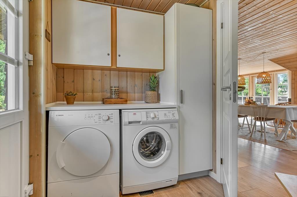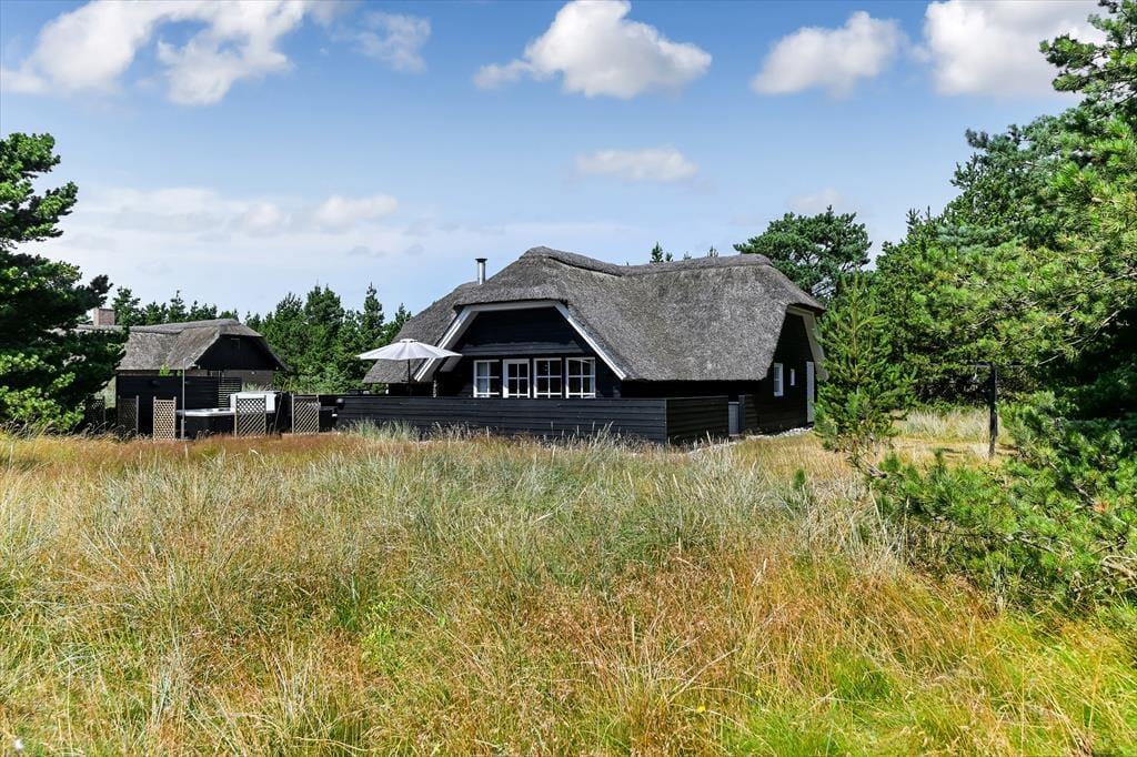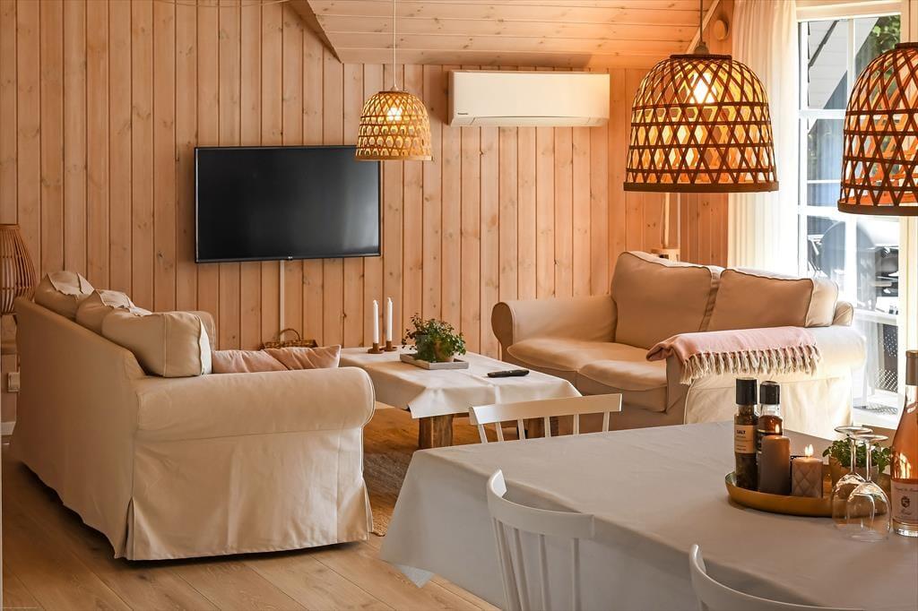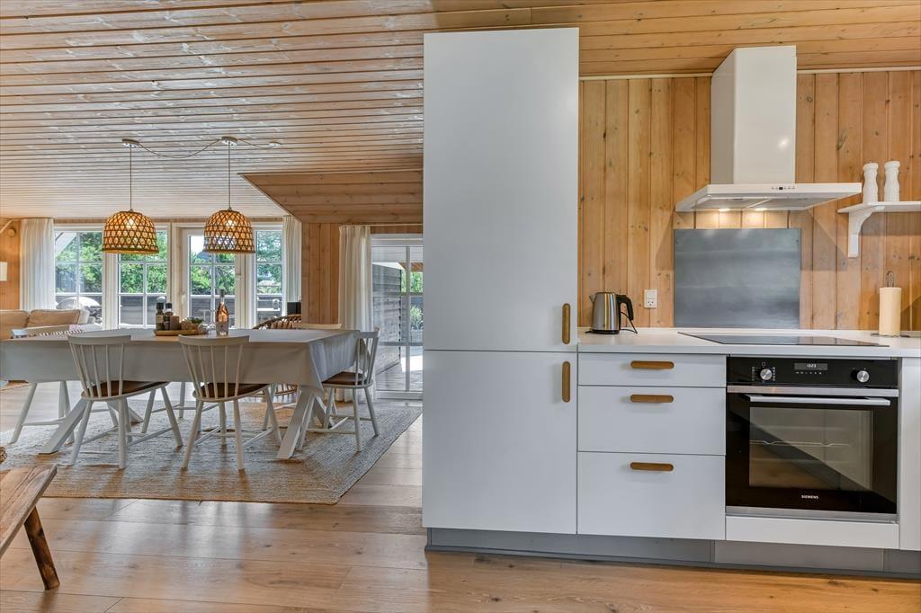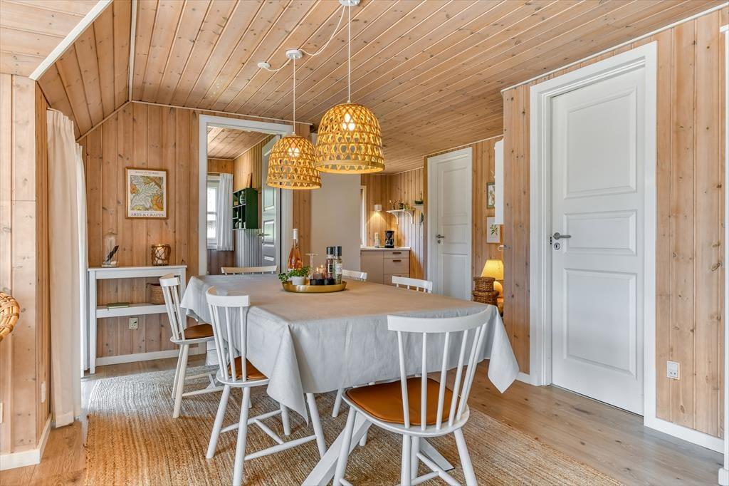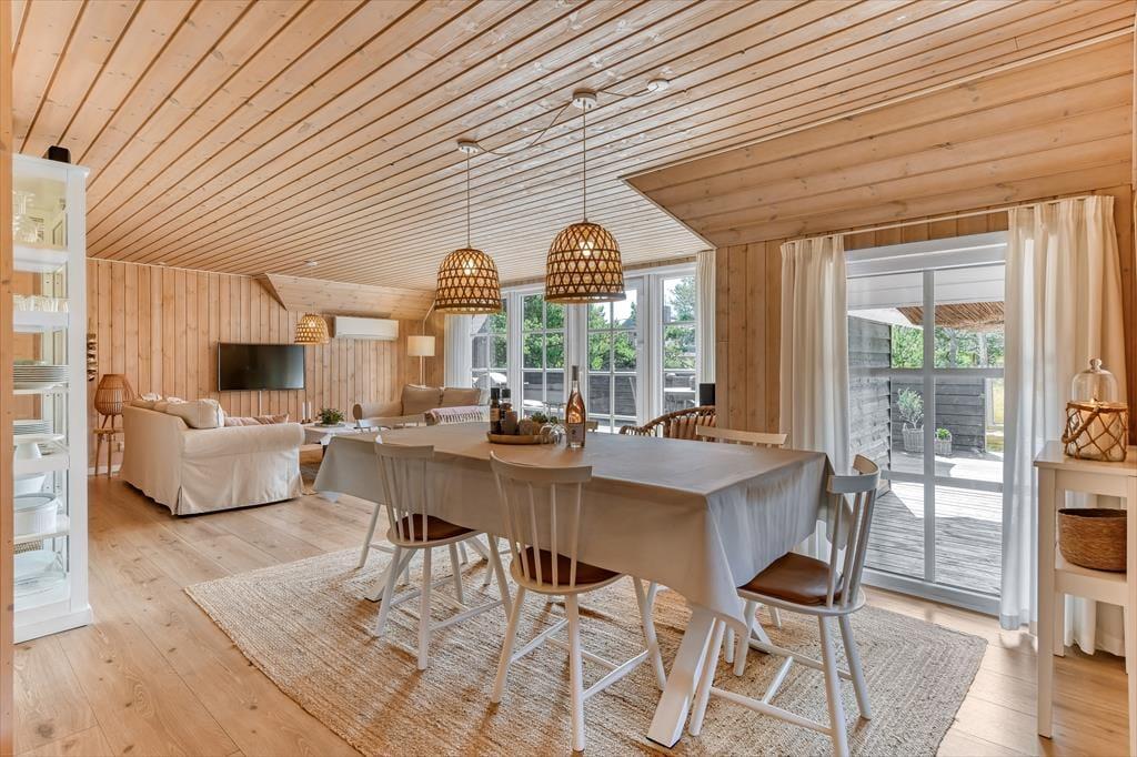 Det stråtækte træhus er blevet grundigt moderniseret inden for den seneste årrække, og det kan tydeligt både ses og mærkes i de stilfuldt indrettede rum. Interiøret er lyst og indbydende, så det er fristende at bruge en stor del af ferien på at hvile, lege og hygge sig i ro og mag. Køkken og stue ligger i åben forbindelse, og i nærheden af både spisebordet og sofaafdelingen står en brændeovn, som du kan tænde op i, hvis vejret kalder på ekstra varme og hyggestemning. Saunaen og spabadet, der står på det største badeværelse, inviterer til total afslapning, og når det er sengetid, kan du glæde dig til at sove længe på et af de to soveværelser.