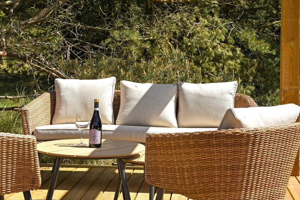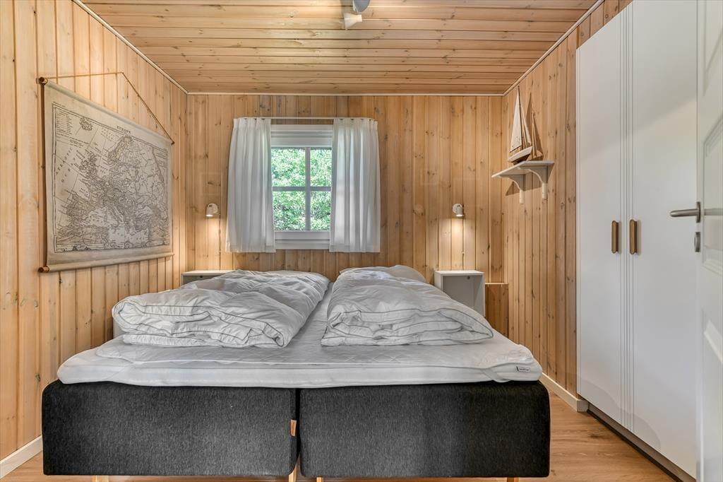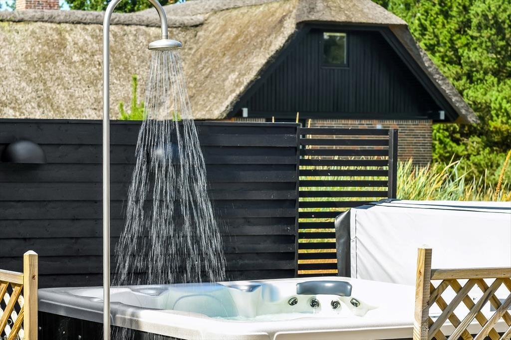 Sommerhusets naturgrund er det helt rette sted at være, når du vil sole dig eller sidde i skyggen med kaffen i en god havestol. Træterrassen ligger godt i forhold til solen, og den er stor, så der er god plads til både liggestole, havebord og loungemøbler. På den tilstødende fliseterrasse er der en udebruser og en udespa – sidstnævnte kan du nemt fylde med vand og varme op via et trykknapsystem, når du er i humør til at dase i de rolige omgivelser. Græsplænen indbyder til leg, og på det flisebelagte parkeringsareal kan der nemt holde to biler.