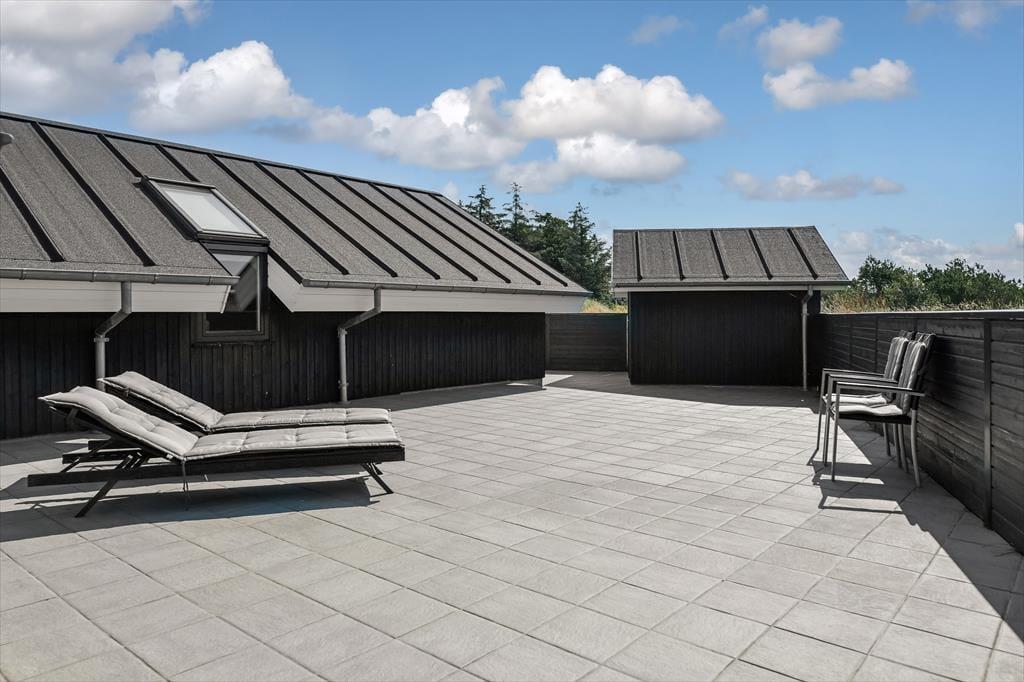 Sommerhusets store og grønne have fungerer som en skøn oase for hele familien. På græsplænen er der god plads til at spille fodbold og dyste i diverse havespil, og der er gyngestativ, nedgravet trampolin og klatretårn med rutsjebane, så børnene har masser af underholdning. Når I alle vil slappe af med morgenkaffe, eftermiddagskage eller nyde en rolig stund i aftensolen, kan I sætte jer på havens store og flotte fliseterrasse. Med sine 160 m2 er den imponerende stor, og derudover er den helt aflukket, så hunden kan gå frit i rolige og trygge omgivelser.
