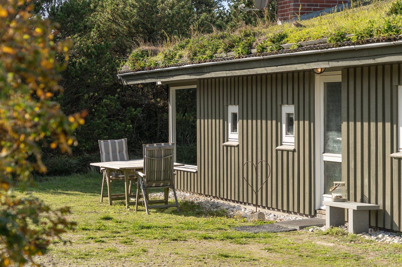 På en ugenert og pragtfuld naturgrund med klitter, kun 400 m fra Vesterhavet, ligger dette skønne og velindrettede sommerhus, bygget i 1986. Til huset hører 2 delvist overdækkede terrasser med havemøbler og en Weber kuglegrill.