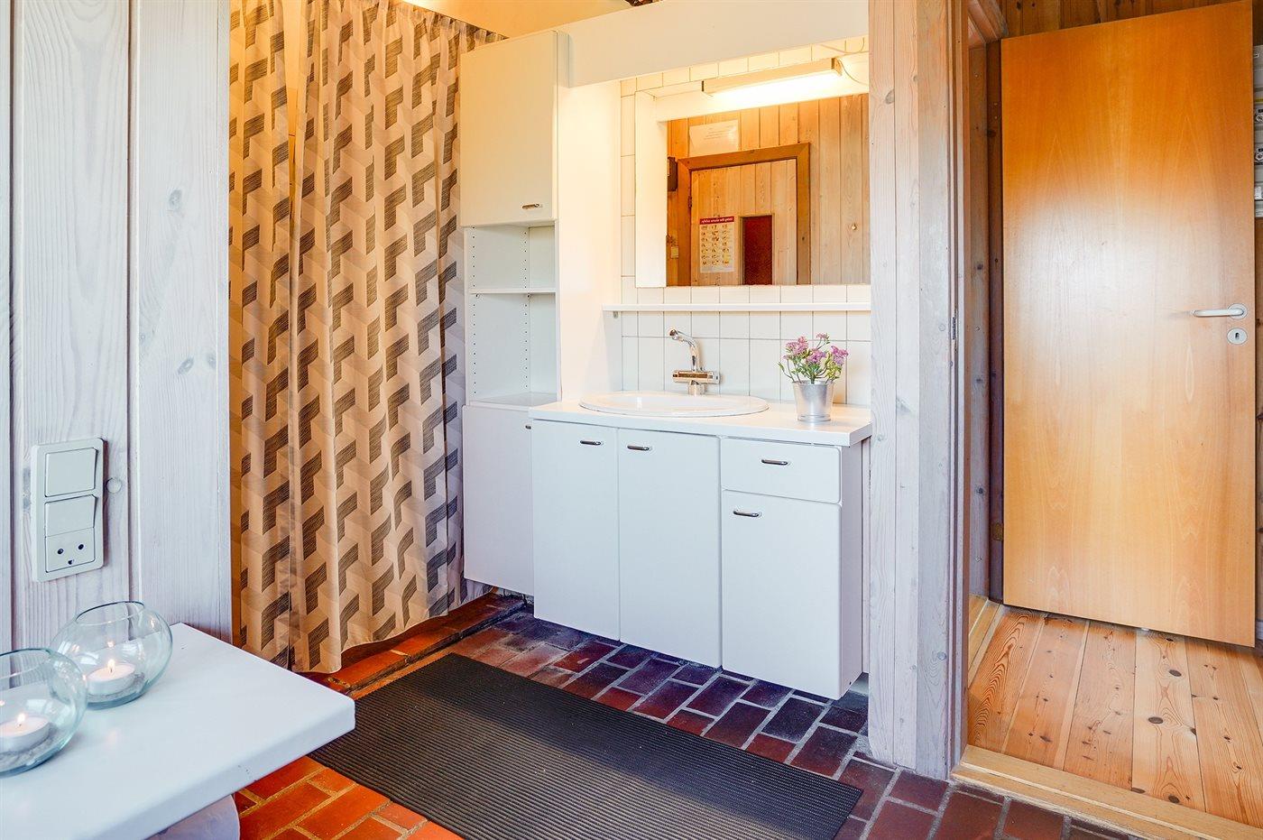 Hvidt badeværelse med bruseniche og direkte adgang til husets sauna. Husets 6 sovepladser fordeler sig på 3 store værelser; 2 med dobbeltseng og 1 med 2 enkeltsenge. Huset er desuden udstyret med gratis, trådløs internetforbindelse (computer skal medbringes), vaskemaskine og tørretumbler. Trægulve med små tæpper overalt undtagen i badeværelset, gæstetoilet samt entré, hvor der er klinker med gulvvarme.