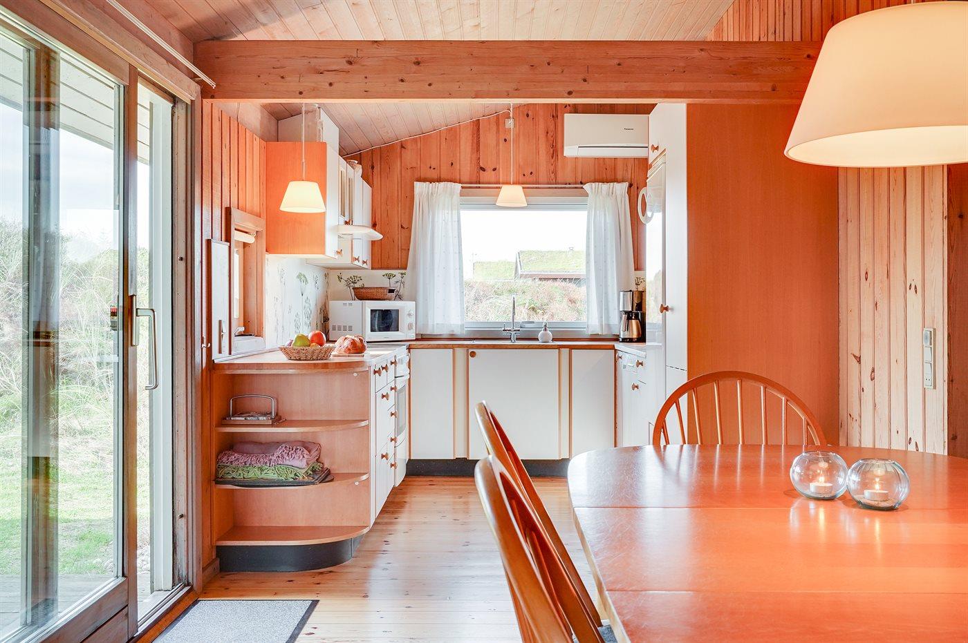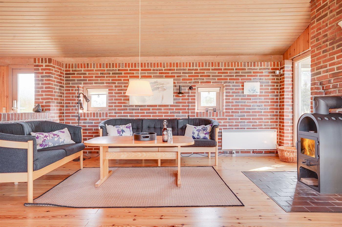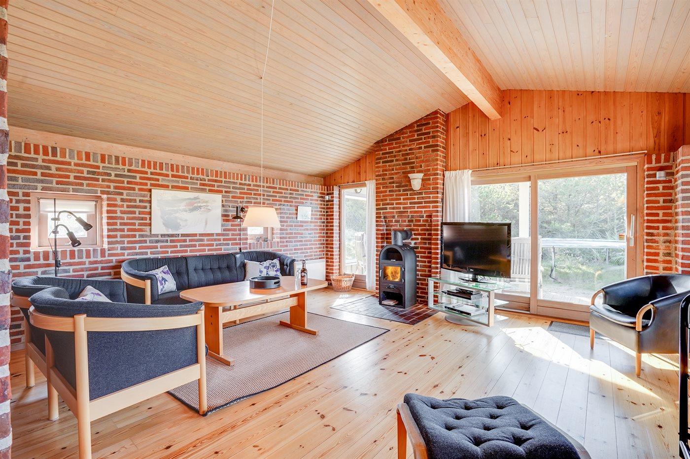 Veludstyret køkken/alrum med bl.a. opvaskemaskine og mikrobølgeovn, stor spiseplads og udgang til vestvendt terrasse. Den hyggelige og store opholdsstue har adgang til syd- og vestvendte terrasser og indeholder brændeovn, stereoanlæg med CD-afspiller samt TV med parabol (digital) og DVD-afspiller. Fra de store vinduer i opholdsstuen er der en flot udsigt til Blåvand Fyr.