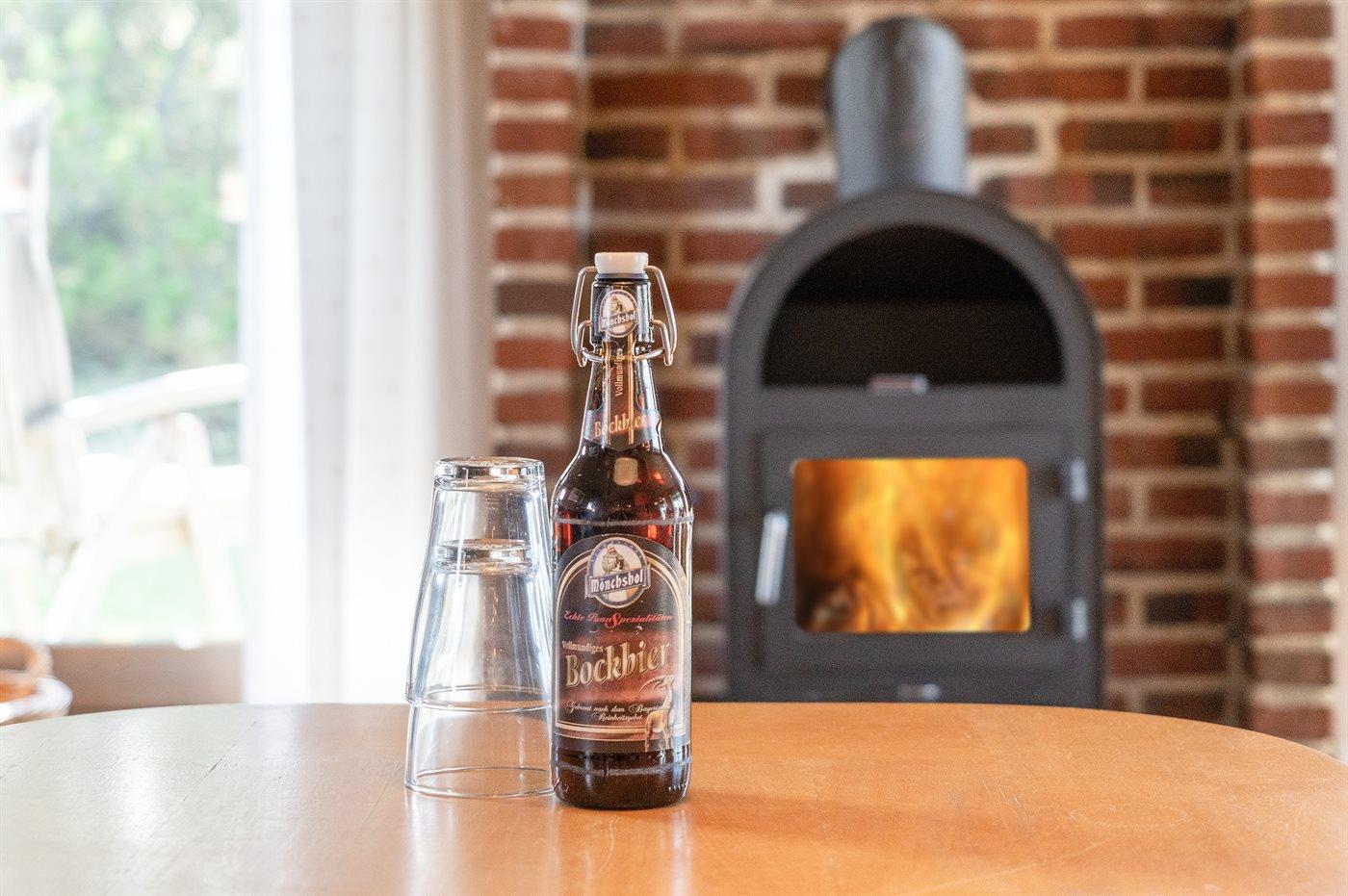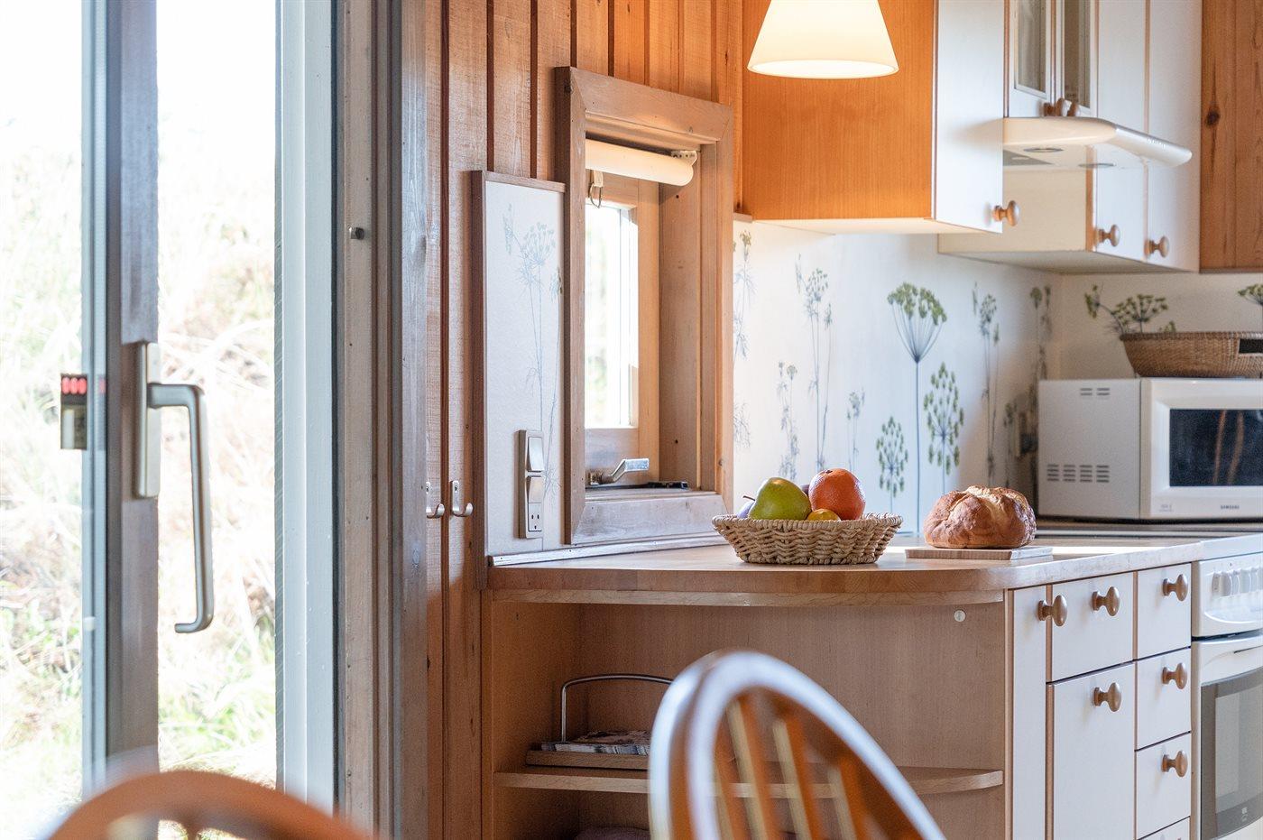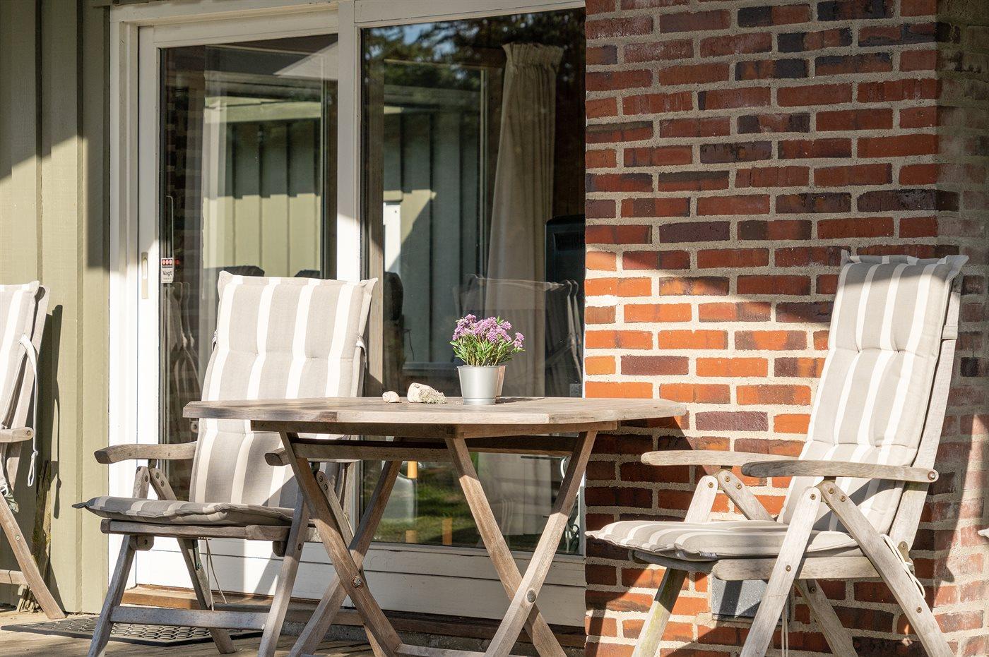 Veludstyret køkken/alrum med bl.a. opvaskemaskine og mikrobølgeovn, stor spiseplads og udgang til vestvendt terrasse. Den hyggelige og store opholdsstue har adgang til syd- og vestvendte terrasser og indeholder brændeovn, stereoanlæg med CD-afspiller samt TV med parabol (digital) og DVD-afspiller. Fra de store vinduer i opholdsstuen er der en flot udsigt til Blåvand Fyr.