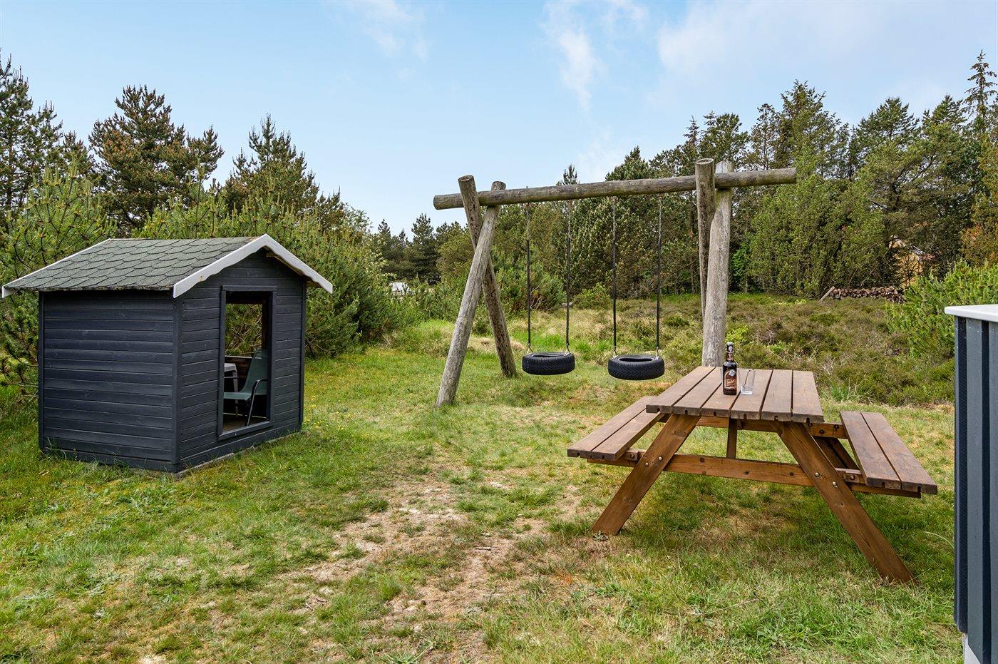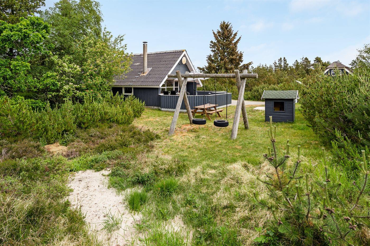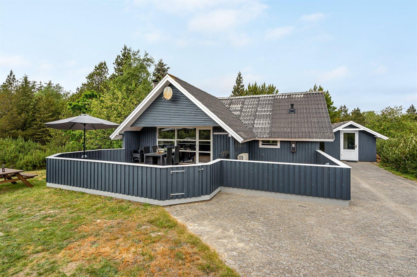 På en kuperet grund med mange fyrretræer, ud til Blåvand-vejen, ligger dette sommerhus med afskærmet, sydvendt og delvis overdækket terrasseareal.