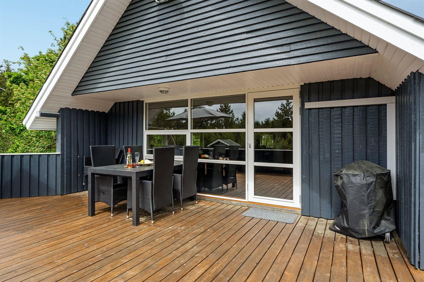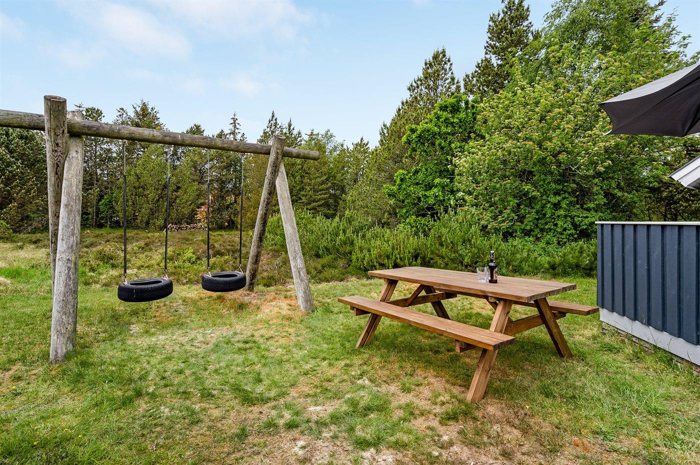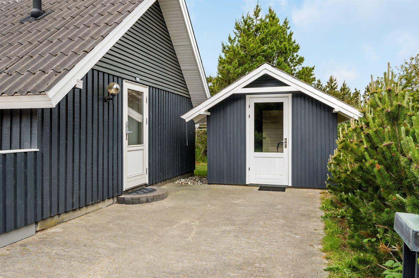 På en kuperet grund med mange fyrretræer, ud til Blåvand-vejen, ligger dette sommerhus med afskærmet, sydvendt og delvis overdækket terrasseareal.
