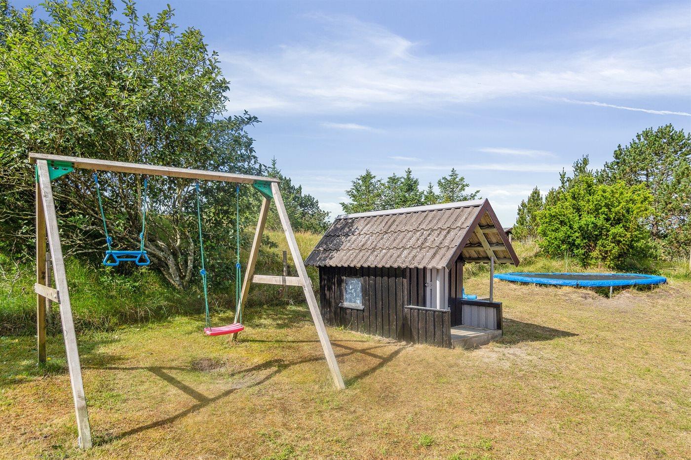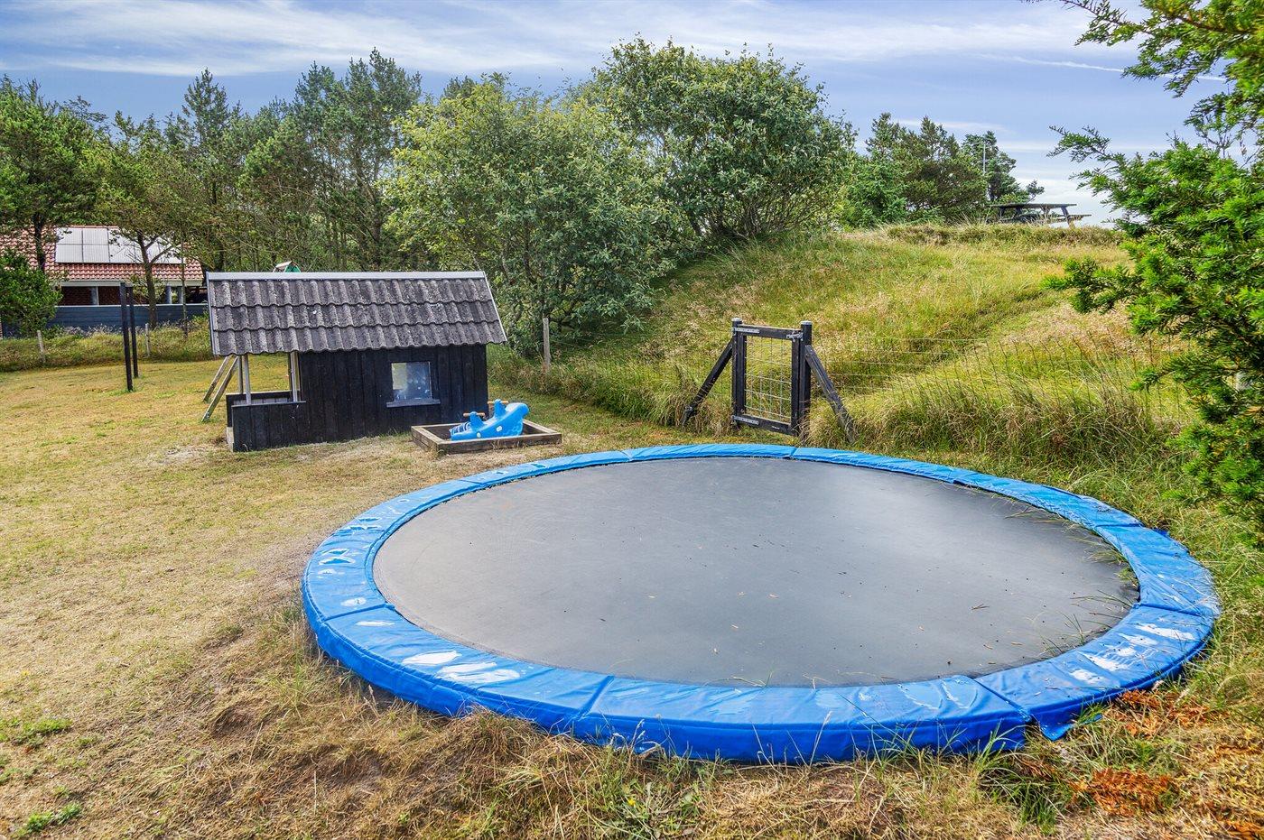 Ferieboligen er beliggende på en 2380 m² stor naturgrund. Grunden er indhegnet. Der er 800 m til havet. Nærmeste forretning er beliggende i en afstand af 2000 m. Til ferieboligen hører 48 m² terrasseareal. Gynge. Sandkasse. Legehus. Trampolin. Fodboldmål. Grill til rådighed. Parkering ved ferieboligen.