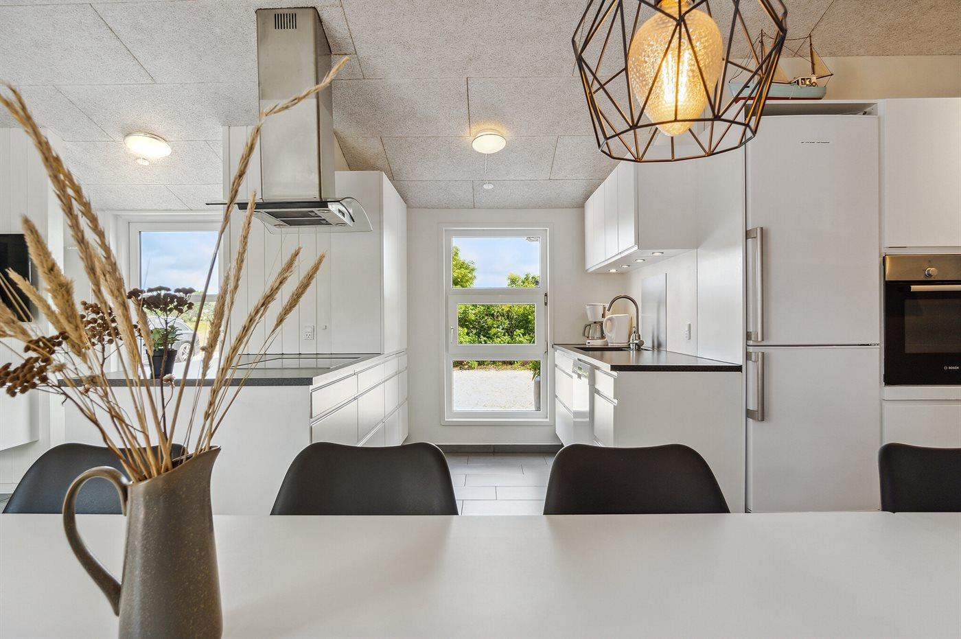 Køkkenet er udstyret med 1 køleskab. Der er 4 keramiske kogeplader, varmluftovn, mikrobølgeovn samt opvaskemaskine Der er gulvvarme i køkkenet.