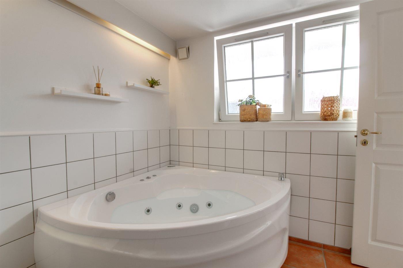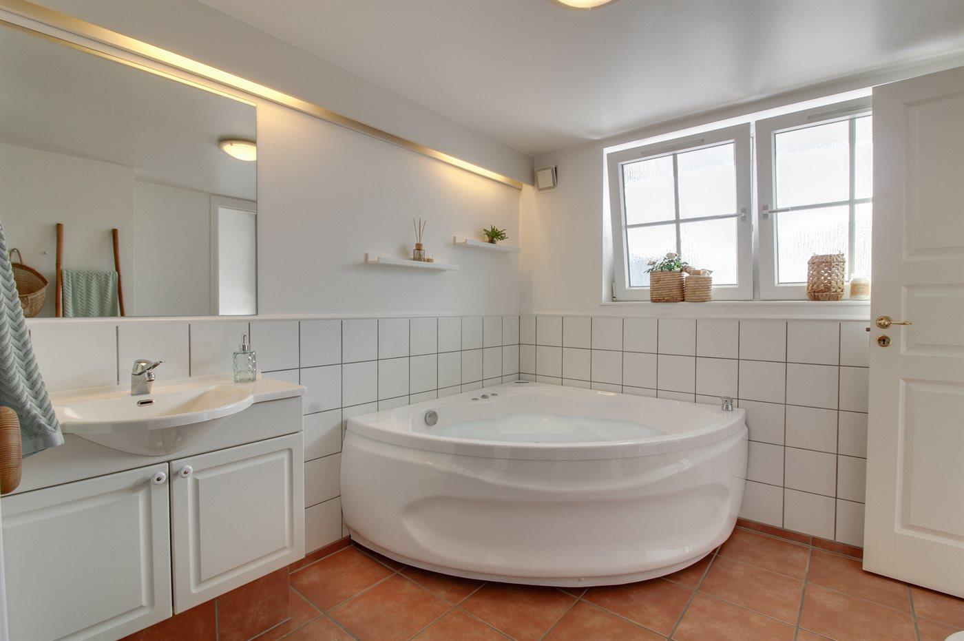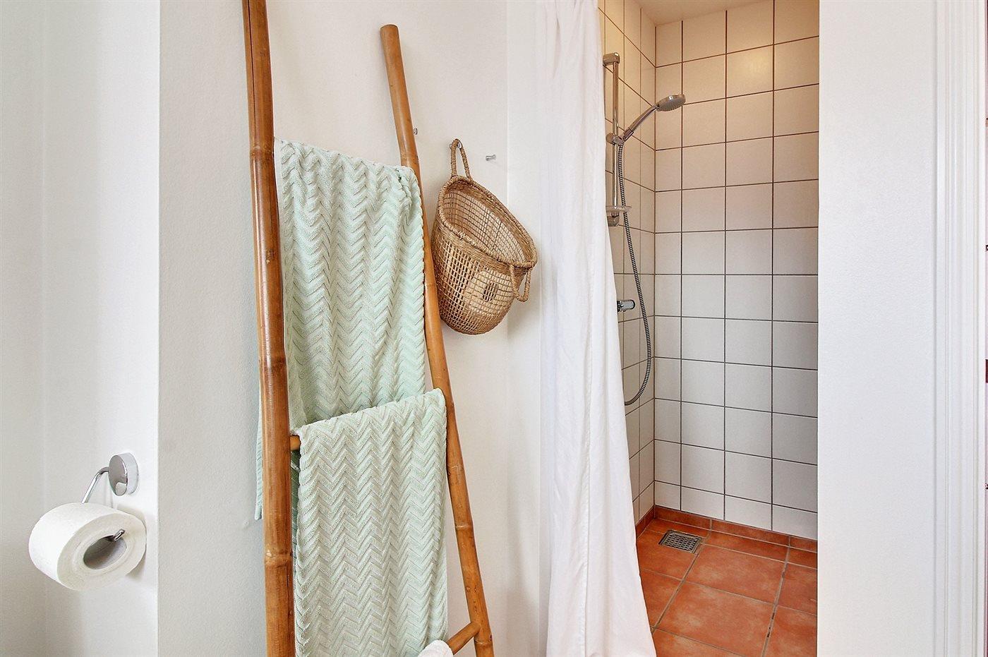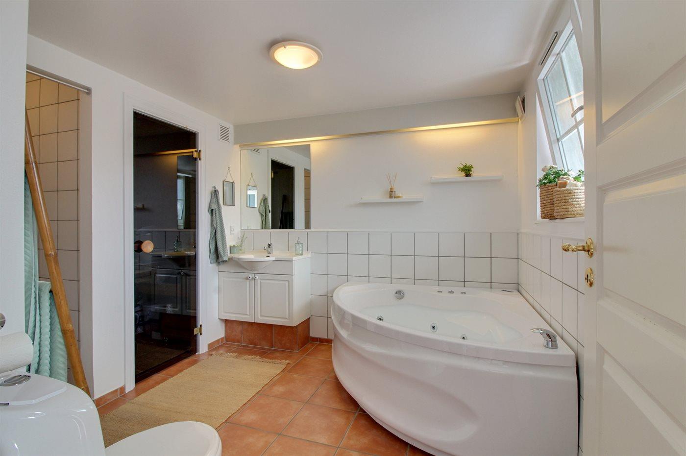 Der er 2 badeværelser med bruseniche og 2 toiletter. Der er gulvvarme på 1 badeværelse. I saunaen er der mulighed for afslapning.