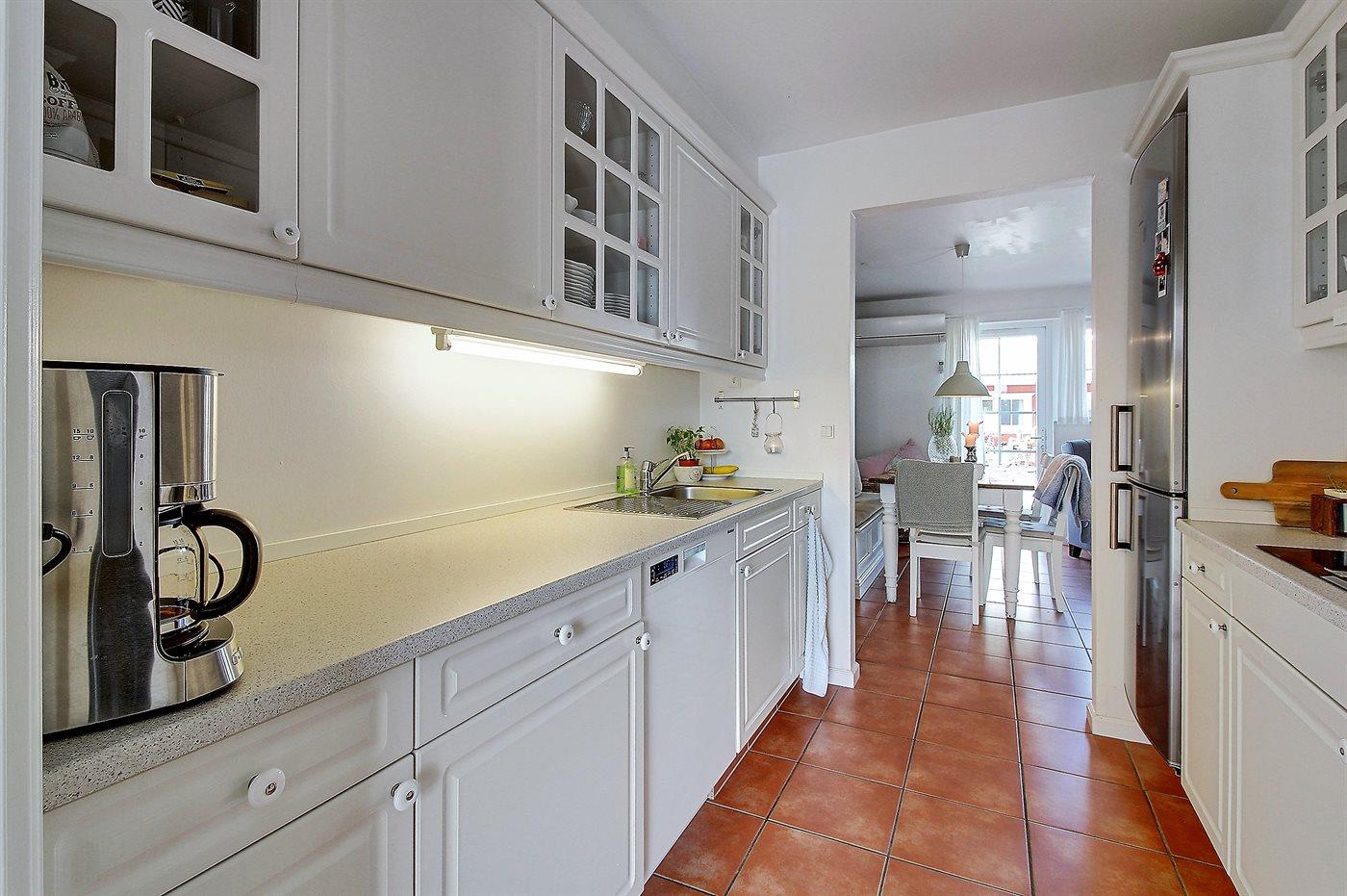 Køkkenet er udstyret med 1 køleskab. Der er 4 induktionskogeplader, varmluftovn samt opvaskemaskine Der er gulvvarme i køkkenet.