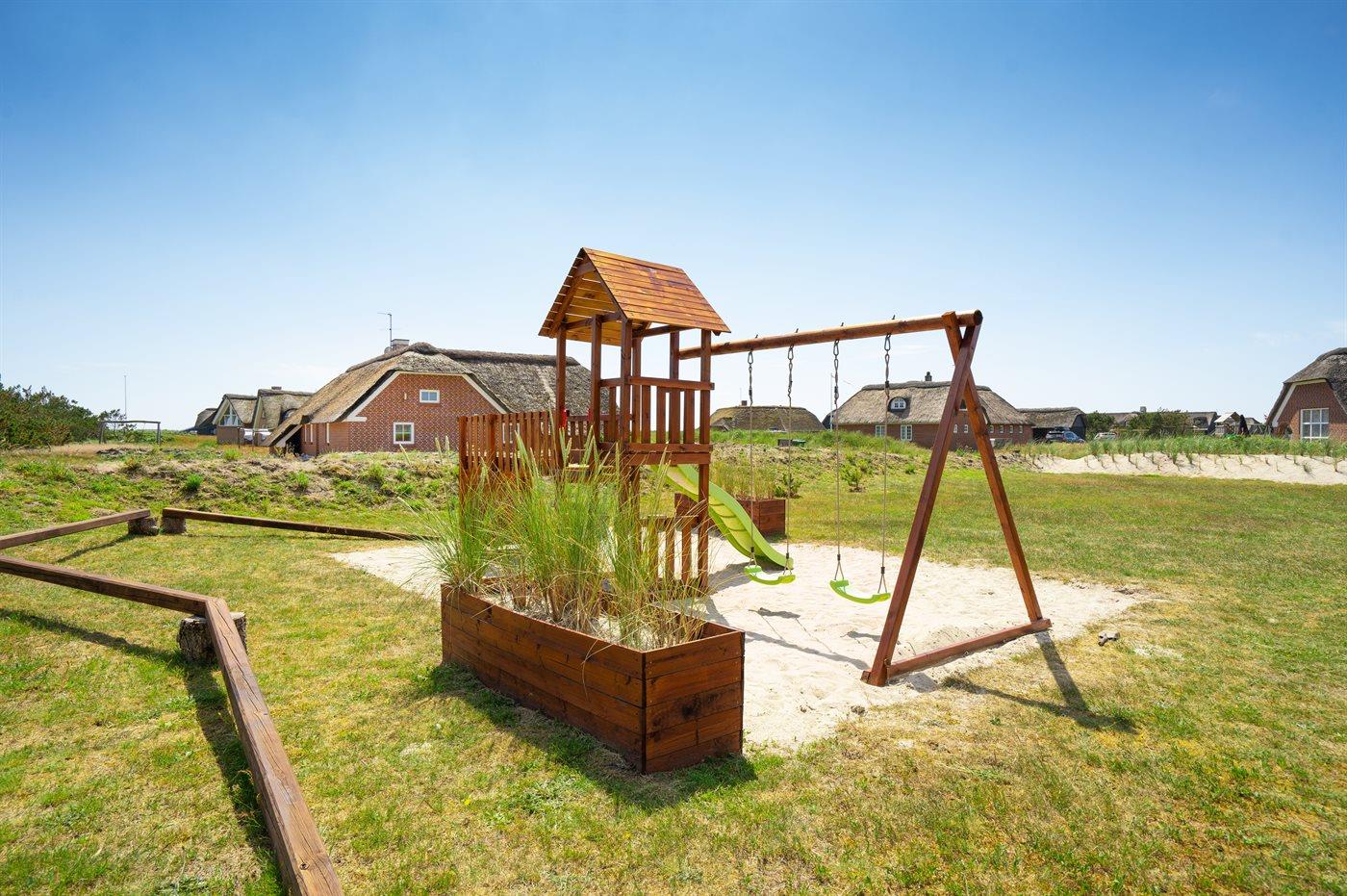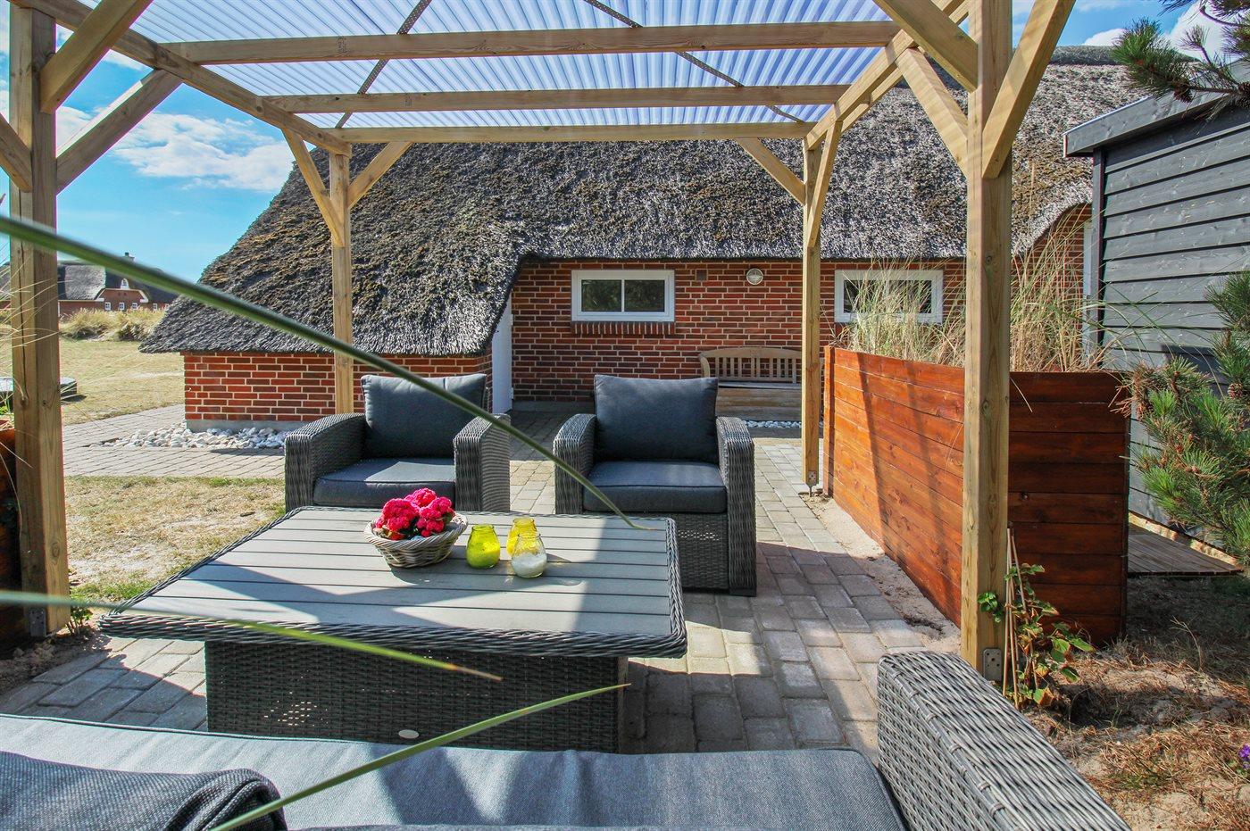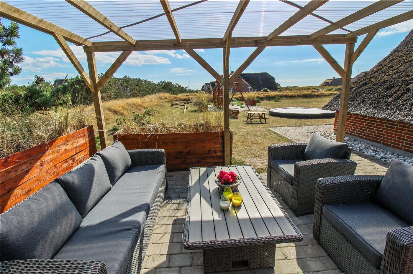 Ferieboligen er beliggende på en 1524 m² stor klitgrund. Der er 100 m til havet. Nærmeste forretning er beliggende i en afstand af 900 m. Til ferieboligen hører 50 m² terrasseareal. Desuden er der 12 m² overdækket terrasse. Gynge. Sandkasse. Trampolin. Legetårn. Rutchebane. Der findes udendørs bruser, hvor vandet bliver opvarmet af solen. Grill til rådighed. Der er installeret stik til opladning af elbil. Parkering ved ferieboligen.