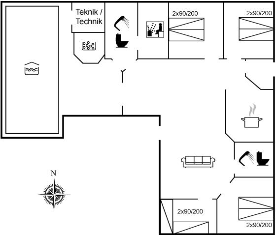 Der er i alt 4 soveværelser. Sovepladserne fordeler sig på: 6 sovepladser i dobbeltsenge. 2 sovepladser i enkeltsenge.