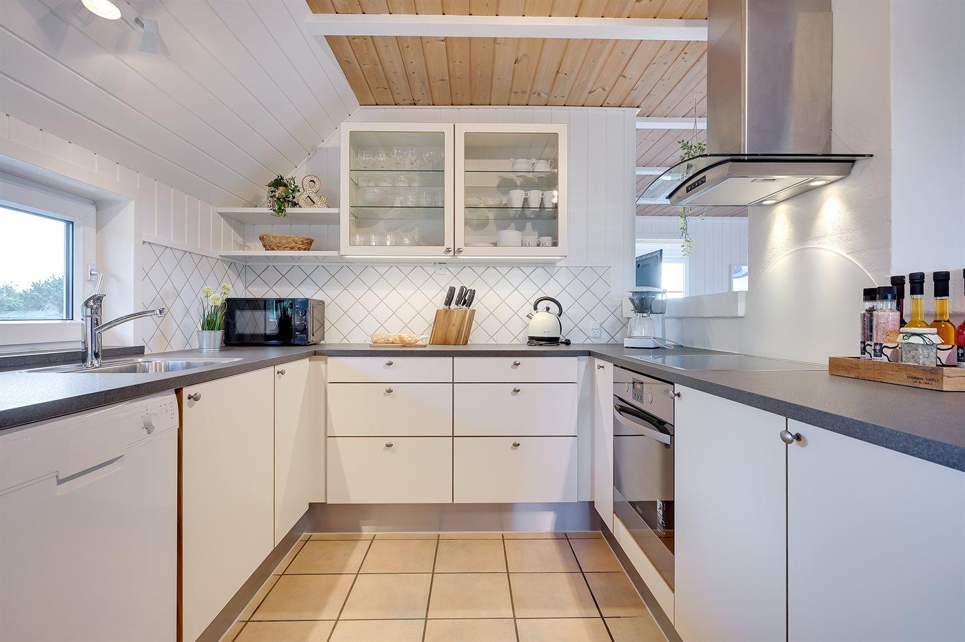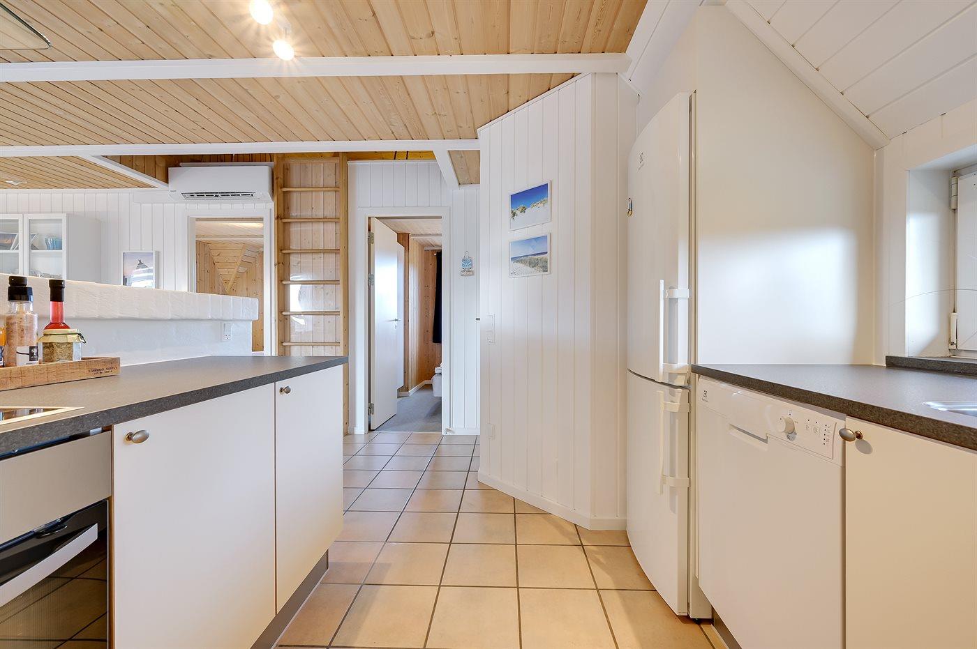 Køkkenet er udstyret med 1 køleskab. Der er 4 keramiske kogeplader, varmluftovn, mikrobølgeovn samt opvaskemaskine Der er gulvvarme i køkkenet.