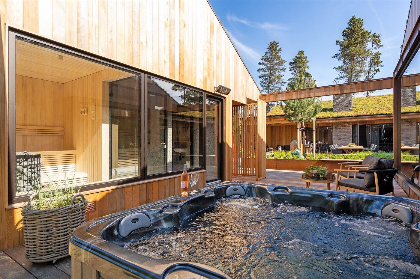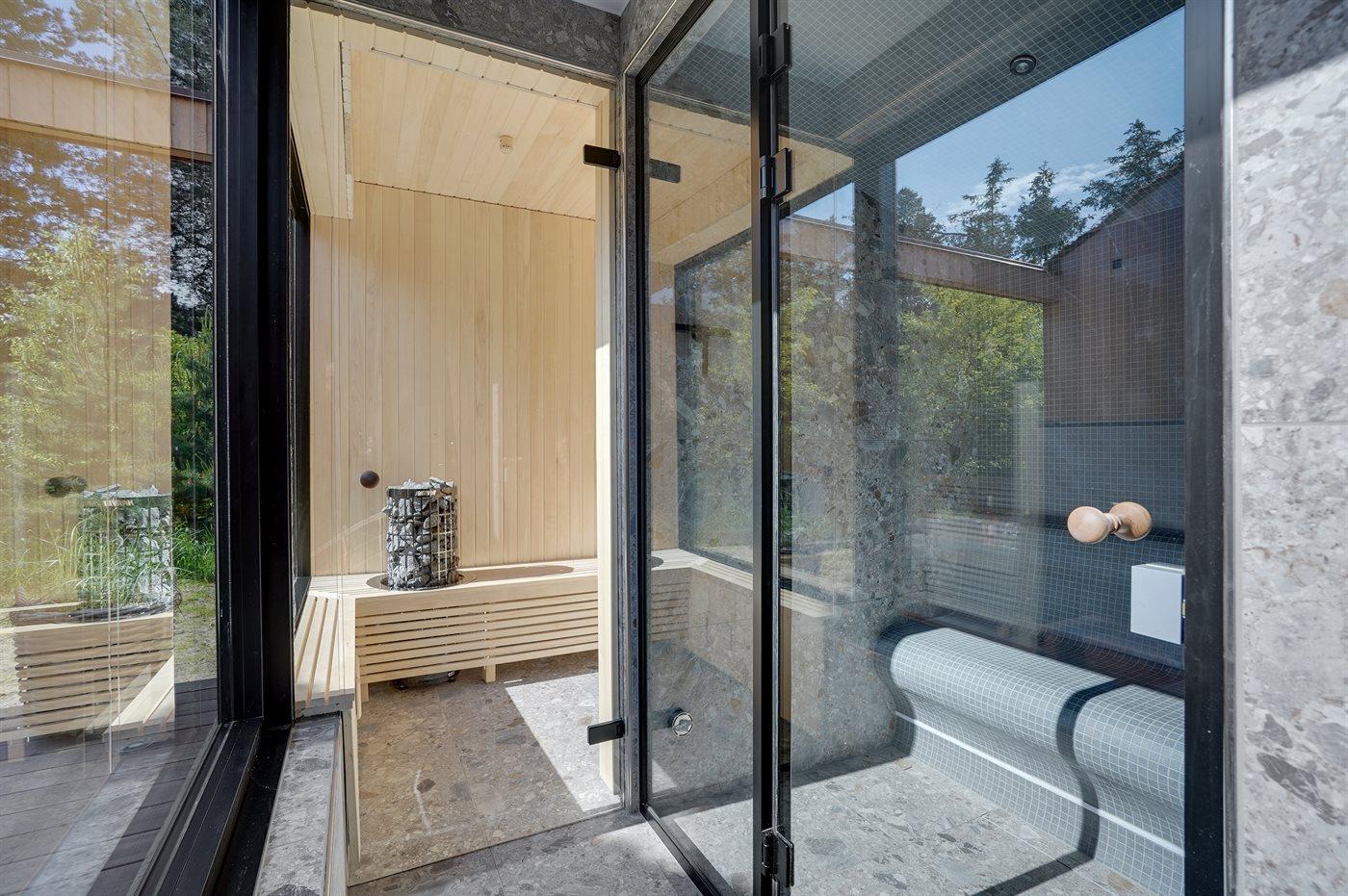 I forbindelse med den store terrasse er der udendørs wellness, så som udespa med plads til 5 pers. og udebruser. I tilknytning dertil er der sauna og dampkabine, samt endnu et toilet, hvor der også er placeret vaskemaskine og tørretumbler.