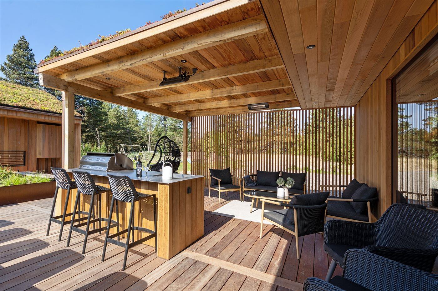 Udenfor kan man nyde den store solgård, hvor der også er en lækker stor overdækket terrasse, med terrassevarmere og lounge møbler. På terrassen er der også solstole samt der er mulighed for at tilberede maden udendørs i udekøkkenet (i perioden november til og med februar er der lukket for vandet).