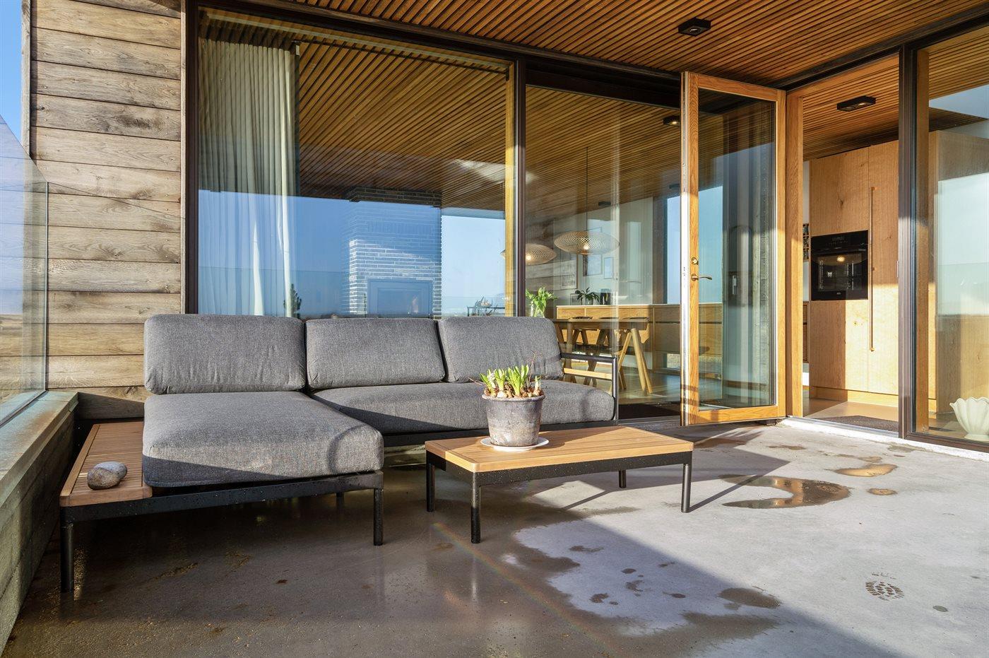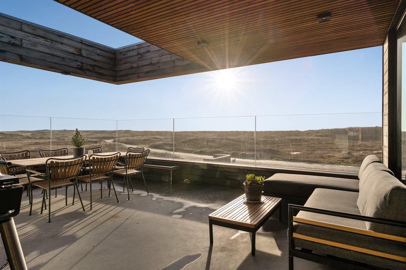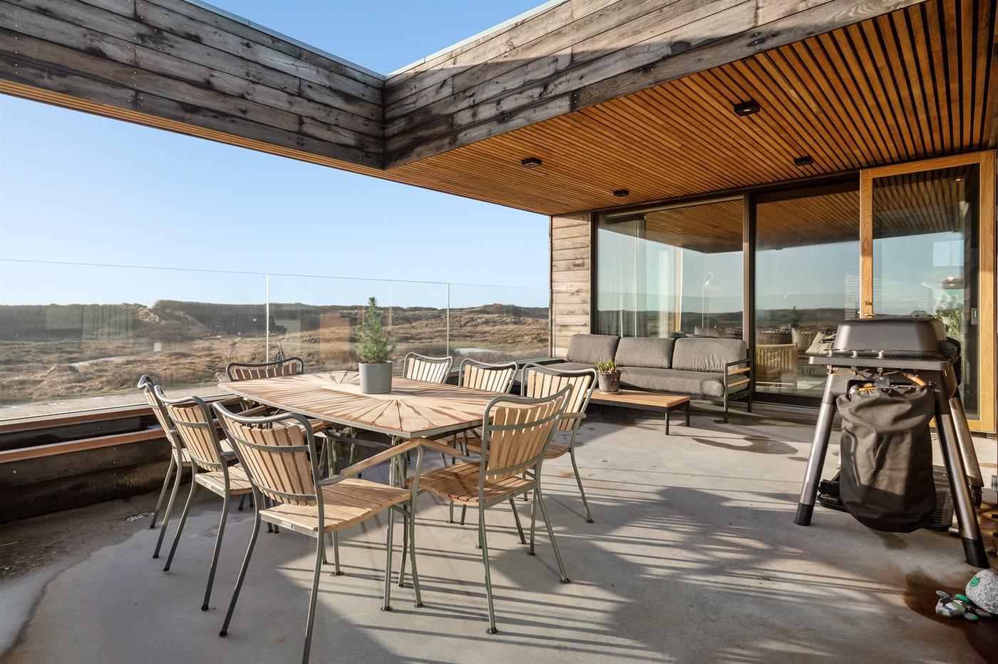 På den syd-/østvendte terrasse, som er delvist overdækket, er der både spisepladser og loungemøbler, hvorfra havet både kan ses og høres. Der er også mulighed for at tilberede sin mad på den store gasgrill.