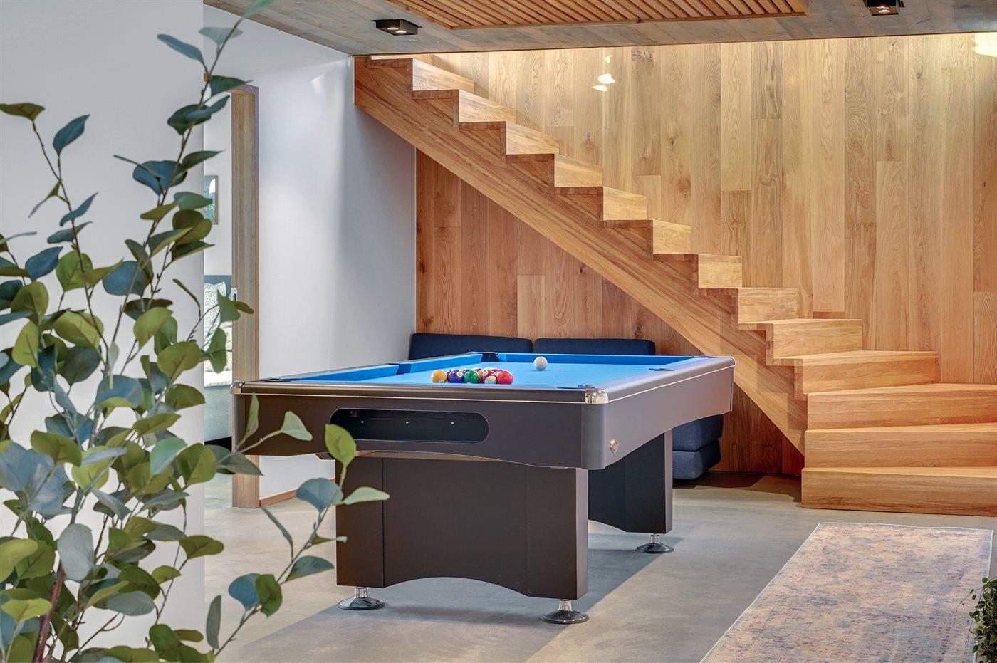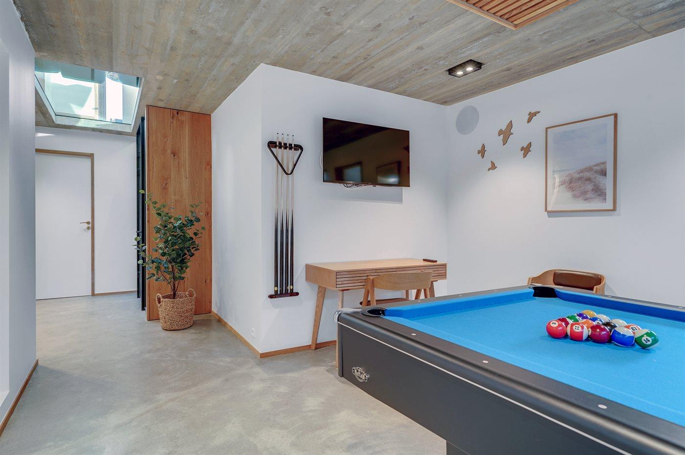 Kælderetagen er indrettet med 2 værelser med dobbeltsenge, stort badeværelse med dobbeltbruser, der ligger i forbindelse og har adgang til infrarød sauna. Desuden er der opholdsrum med poolbord og teknikrum med vaskemaskine, tørretumbler og 250 liter fryser. I kælderen har I mulighed for at få adgang til husets vinrum, gå på opdagelse for smagssanserne.